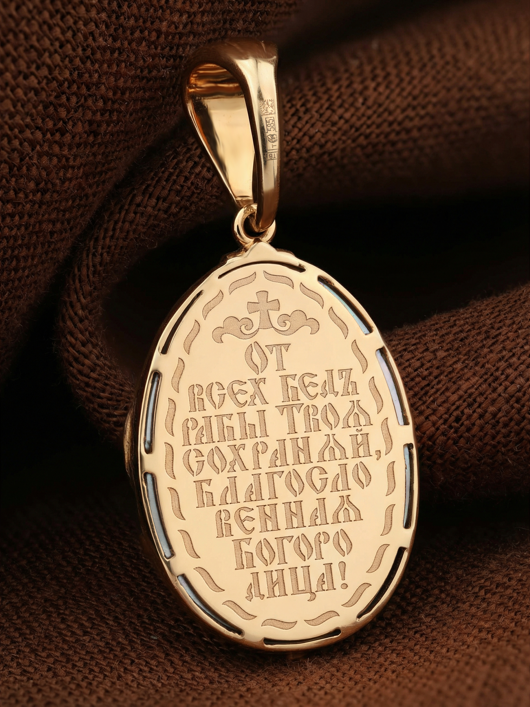 На оборотной стороне образка написана молитва: «От всех бед рабы Твоя сохраняй, Благословенная Богородица!»
