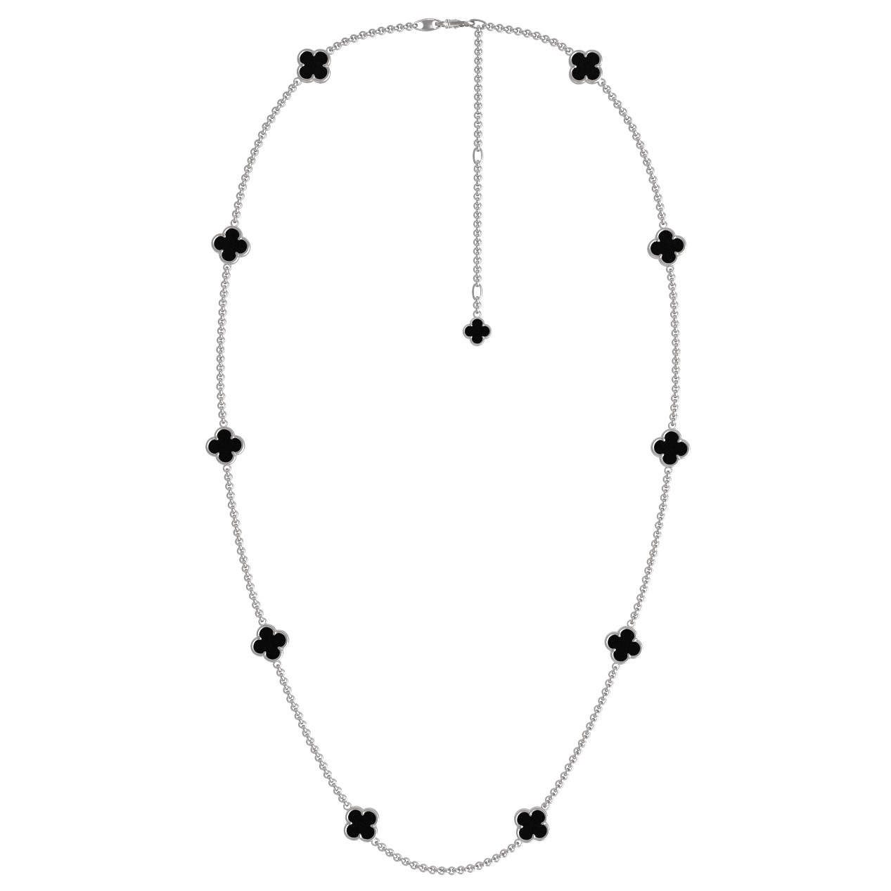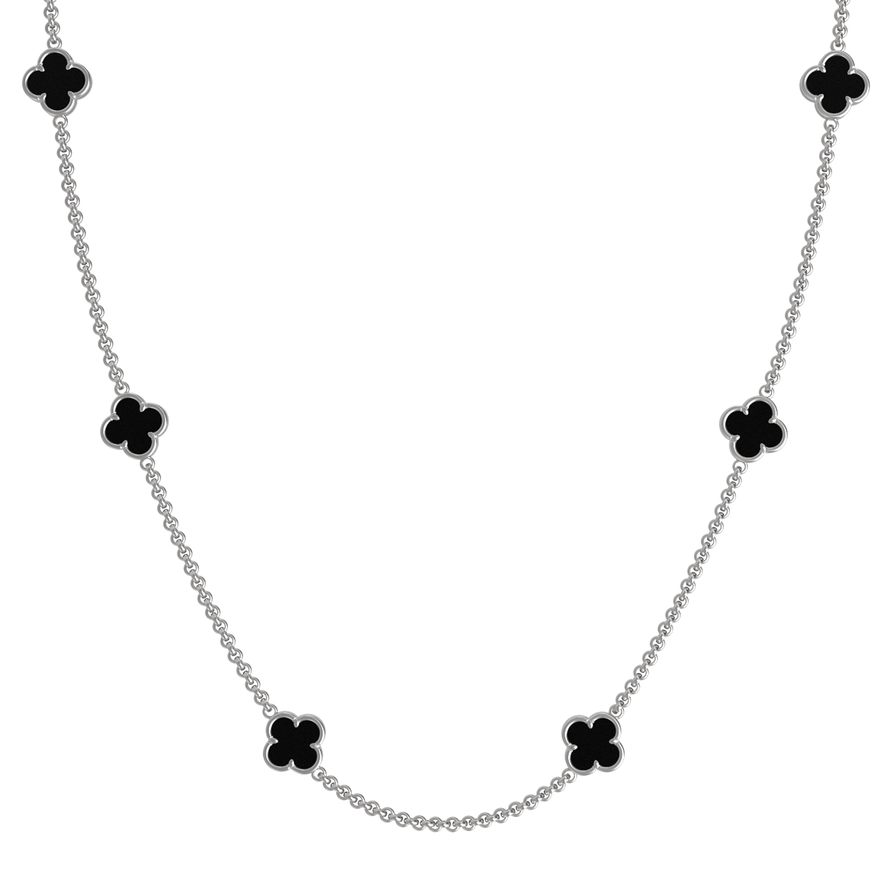 Элегантное колье из белого золота 585 пробы — это воплощение утонченности и лаконичного стиля. Дизайн украшения, вдохновленный символом клевера, подчеркивает безупречный вкус владельца. Ювелирное изделие из коллекции De Luxe — Клевер весна гармонично сочетает в себе холодный блеск белого золота и глубокий, насыщенный цвет вставок из натурального оникса. Черный оникс придает украшению особую выразительность и делает его заметным акцентом в любом образе.