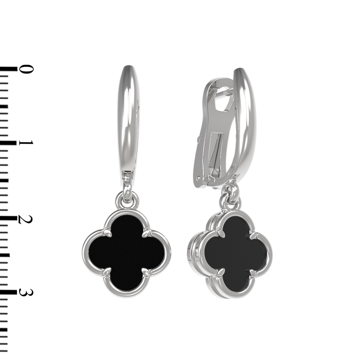 В центре композиции расположены две вставки из оникса насыщенного черного цвета. Контрастное сочетание сияющего металла и черного камня создает выразительный визуальный эффект, делая серьги заметным аксессуаром, который притягивает взгляды. Лаконичная форма и выверенные пропорции позволяют использовать эти серьги как для повседневного ношения, так и для торжественных выходов.