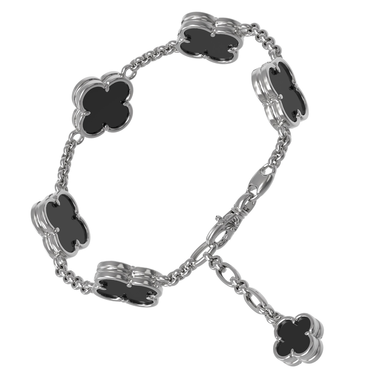 Элегантный браслет из белого золота 585 пробы — это сочетание утонченного стиля и глубокой символики. Модель выполнена в узнаваемом дизайне «Клевер», который давно стал классикой ювелирного искусства. В основе украшения лежит холодный блеск благородного металла, который идеально гармонирует с лаконичным черным цветом вставок.