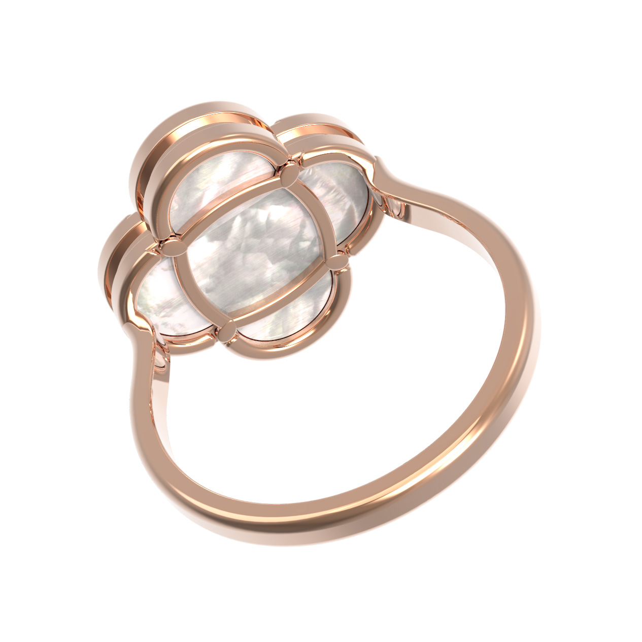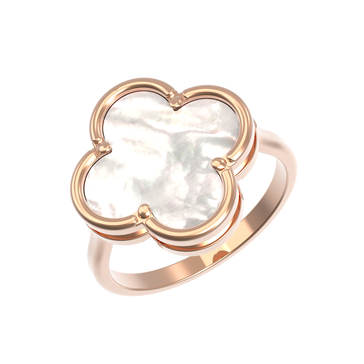 Кольцо из красного золота 585 пробы из коллекции De Luxe — Клевер весна станет изысканным акцентом вашего образа. Дизайн украшения выполнен в популярной тематике клевер, что придает изделию особое очарование и символичность. Центром композиции выступает вставка из натурального перламутра, чей мягкий перелив гармонично сочетается с теплым блеском красного драгоценного металла.