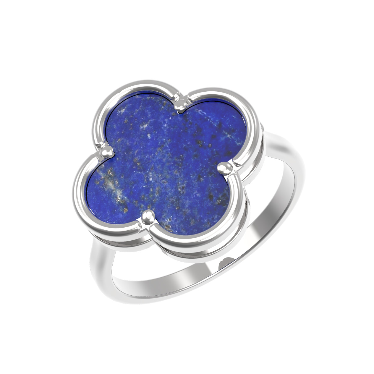 Кольцо из белого золота 585 пробы — утонченное ювелирное изделие, сочетающее в себе благородный блеск металла и глубокий синий оттенок натурального камня. Дизайн украшения выполнен в форме четырехлистного клевера, что придает аксессуару узнаваемый и эстетичный вид. В центре композиции расположена одна вставка из натурального лазурита, чей насыщенный цвет гармонично дополняет холодное сияние белого золота.