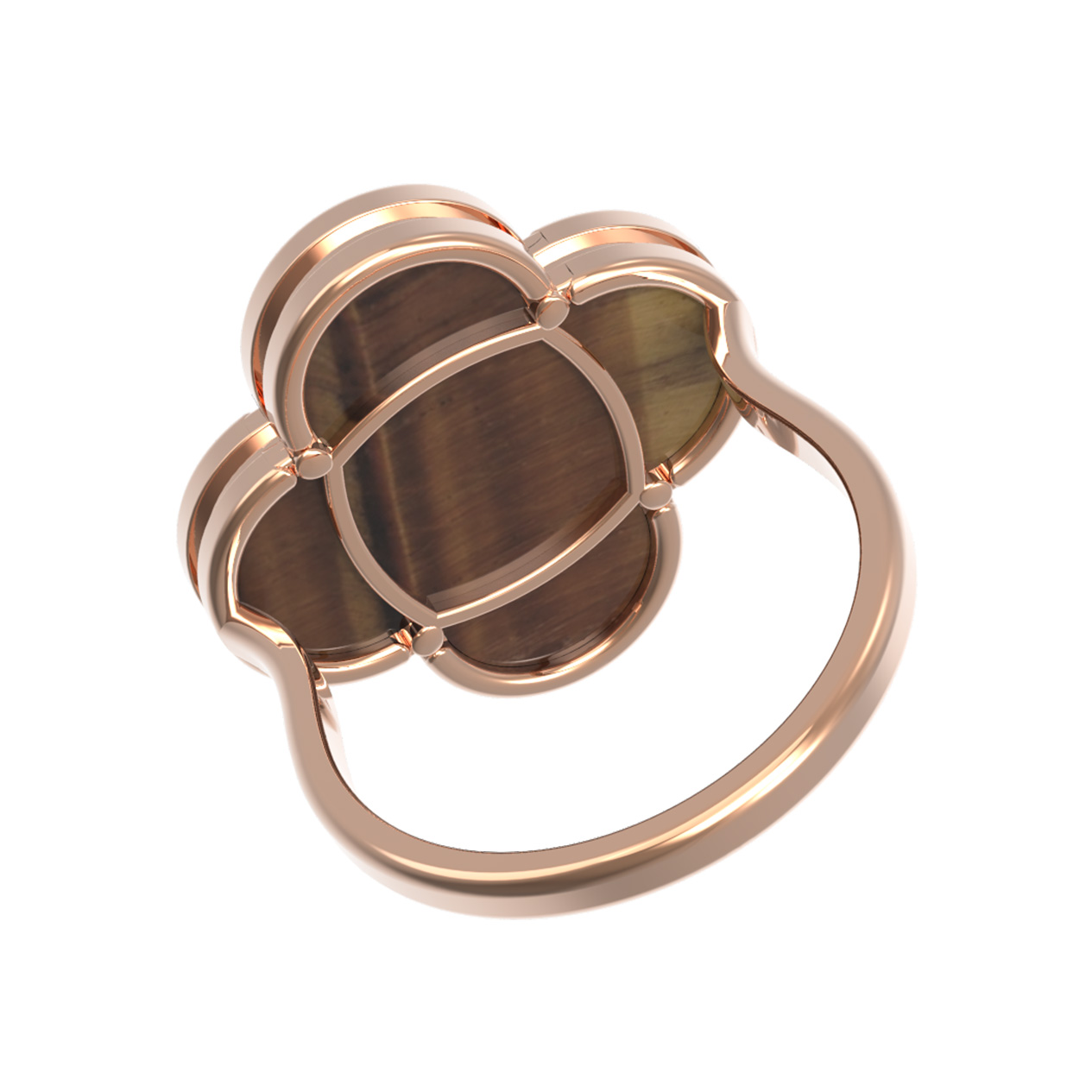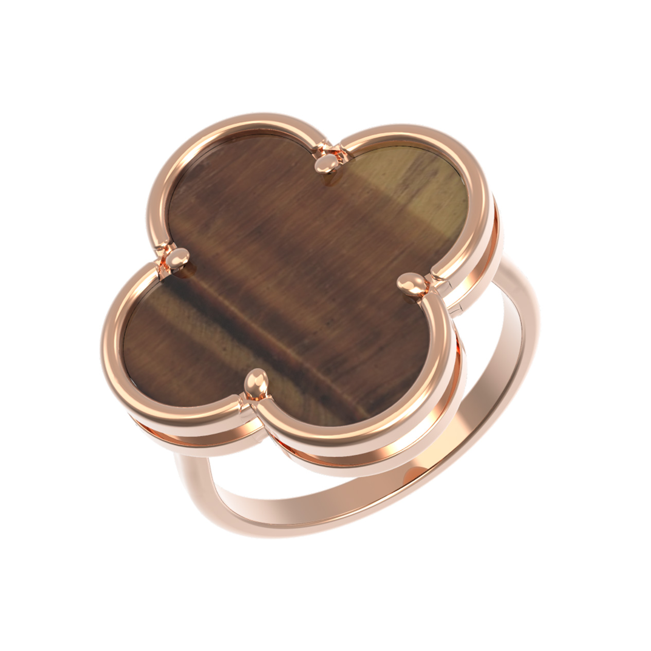 Кольцо из красного золота 585 пробы — это изысканное украшение, которое станет ярким акцентом в вашем образе. Центральным элементом дизайна выступает узнаваемая и всегда актуальная форма клевера. В качестве единственной вставки используется натуральный тигровый глаз, который притягивает взгляд своими глубокими переливами и теплым оранжевым оттенком.