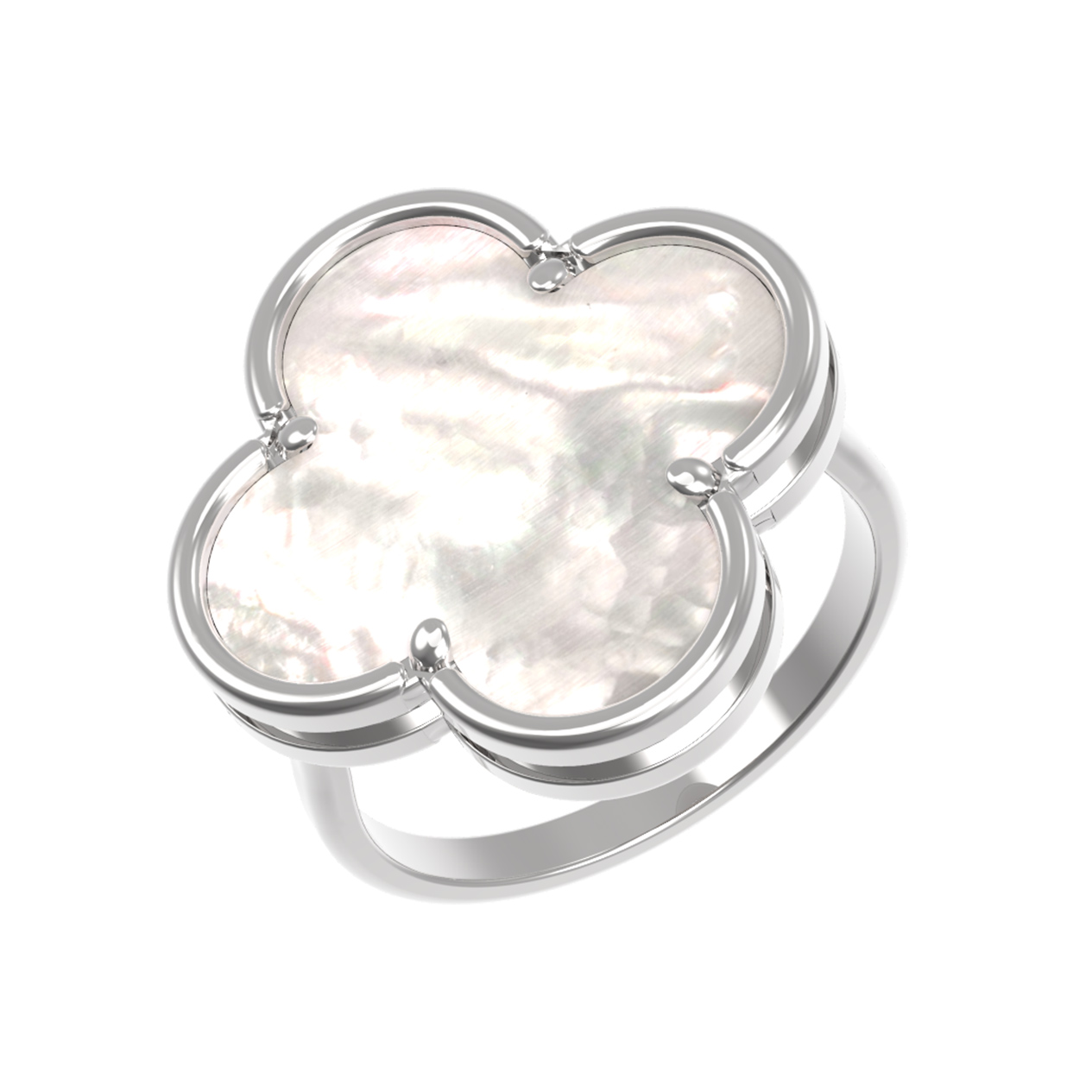 Изящное кольцо из белого золота 585 пробы станет утонченным дополнением вашего образа. Дизайн украшения выполнен в форме четырехлистного клевера — символа удачи и гармонии. В центре композиции расположена вставка из натурального перламутра, чей нежный перелив подчеркивает холодный блеск благородного металла. Это изделие, представленное в коллекции De Luxe — Клевер весна, отличается лаконичностью и безупречным стилем.