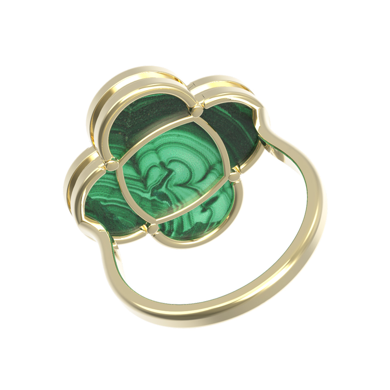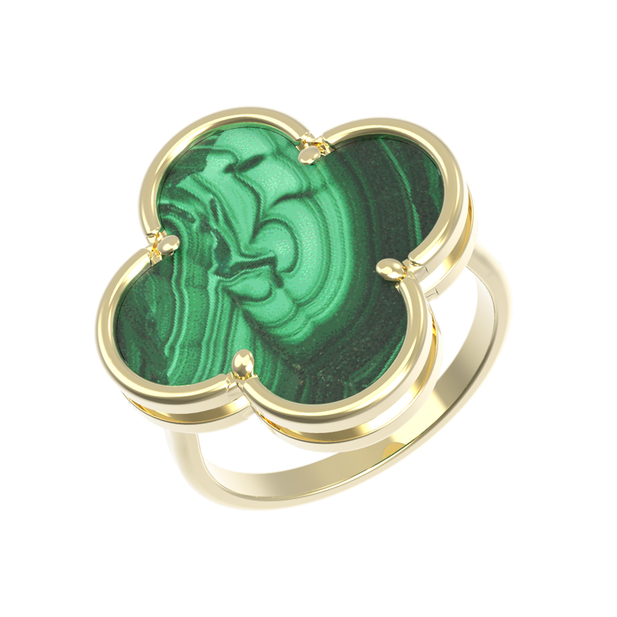 Откройте для себя воплощение изысканности с кольцом из лимонного золота 585 пробы, которое станет ярким акцентом в вашем ювелирном гардеробе. Изделие выполнено в узнаваемом дизайне «Клевер», символизирующем удачу и гармонию, и входит в состав коллекции De Luxe — Клевер весна. Глубокий, насыщенный зеленый цвет вставки из натурального малахита идеально сочетается с благородным оттенком лимонного золота, создавая притягательный контраст.