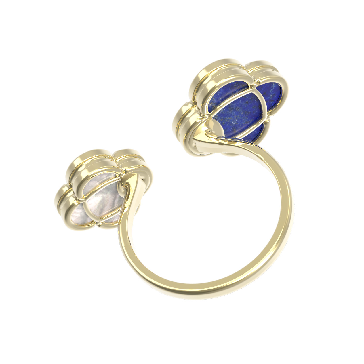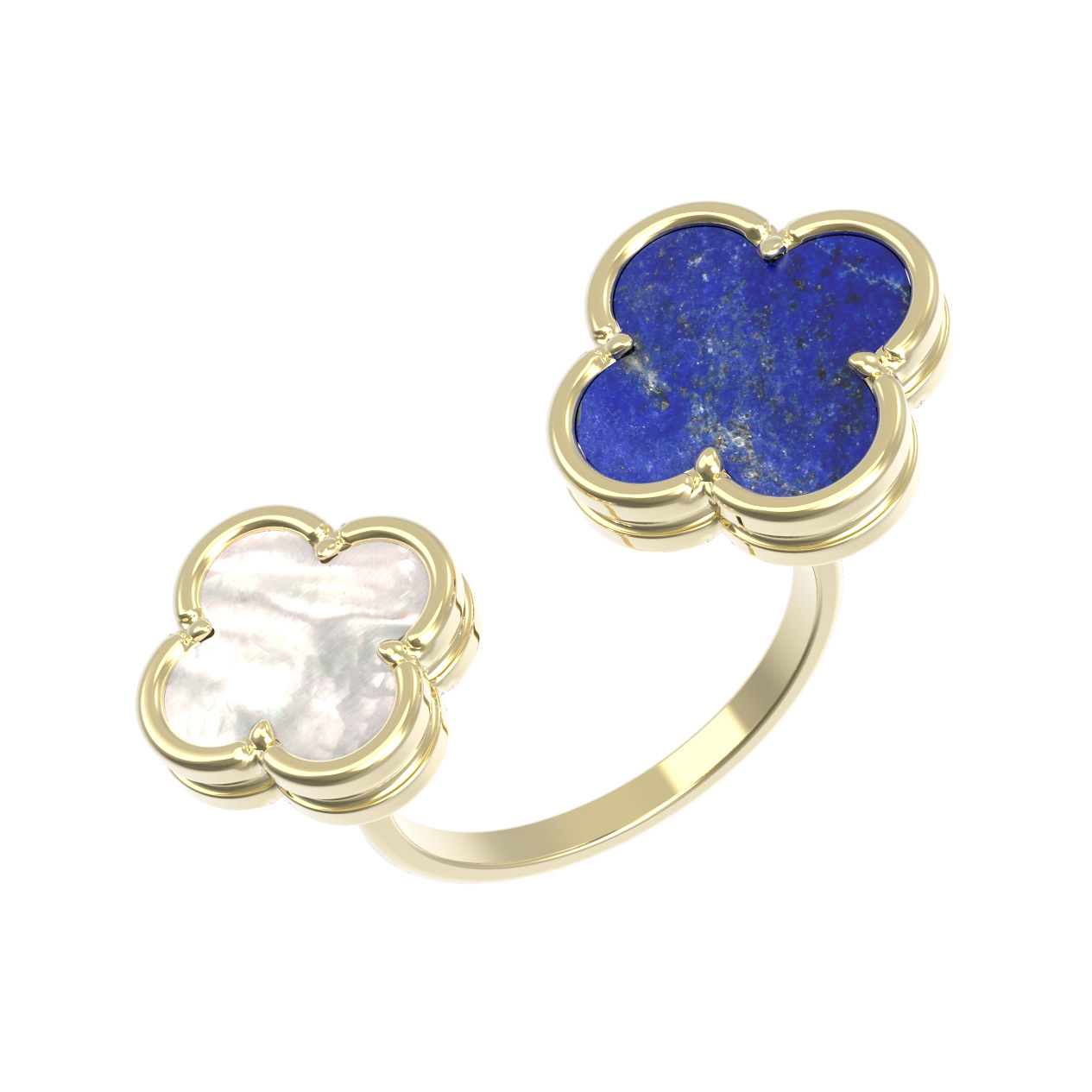 Элегантное кольцо из коллекции De Luxe — Клевер весна воплощает собой гармонию стиля и утонченности. Это изысканное украшение, выполненное из лимонного золота 585 пробы, станет выразительным акцентом вашего образа. Дизайн изделия вдохновлен природными мотивами — центральным элементом декора выступает узнаваемый символ клевера. Композиция дополнена контрастным сочетанием двух вставок: глубокого синего лазурита и нежного перламутра, которые вместе создают неповторимую игру оттенков.