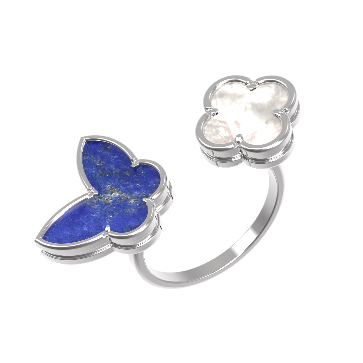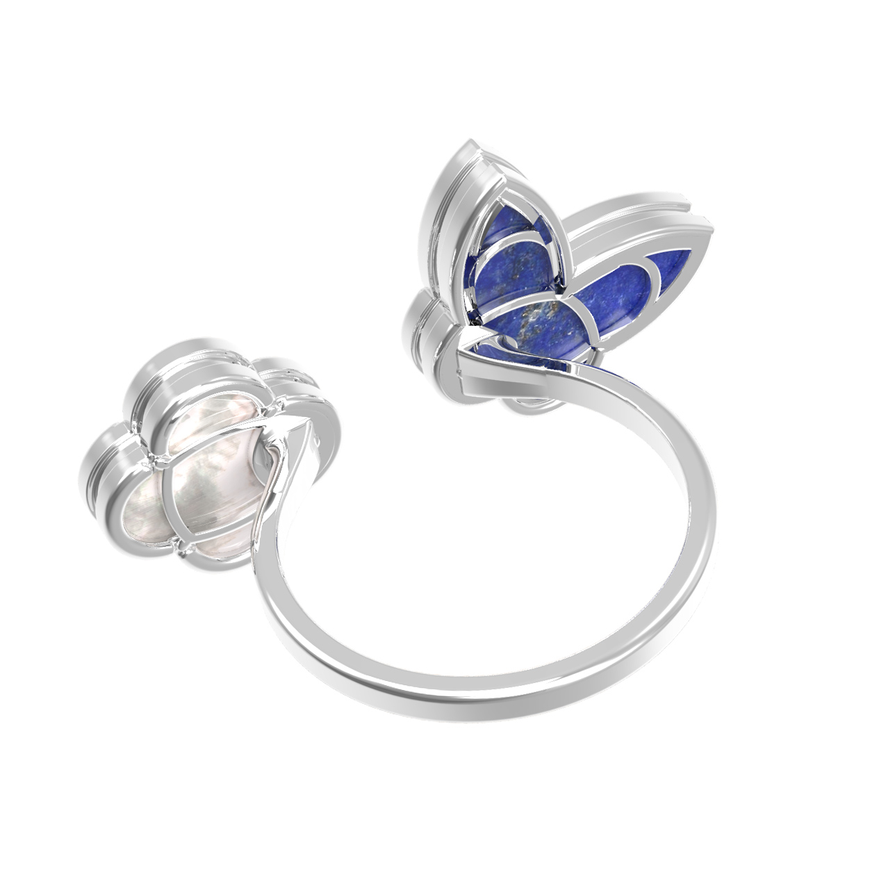 В центре композиции гармонично сочетаются два контрастных материала: насыщенный синий лазурит и нежный перламутр. Сочетание холодного блеска металла и игры натуральных вставок создает элегантный образ, который привлекает внимание своей утонченностью. Это кольцо является универсальным аксессуаром, который одинаково гармонично дополнит стиль как женщин, так и мужчин, предпочитающих качественные и статусную ювелирные изделия.