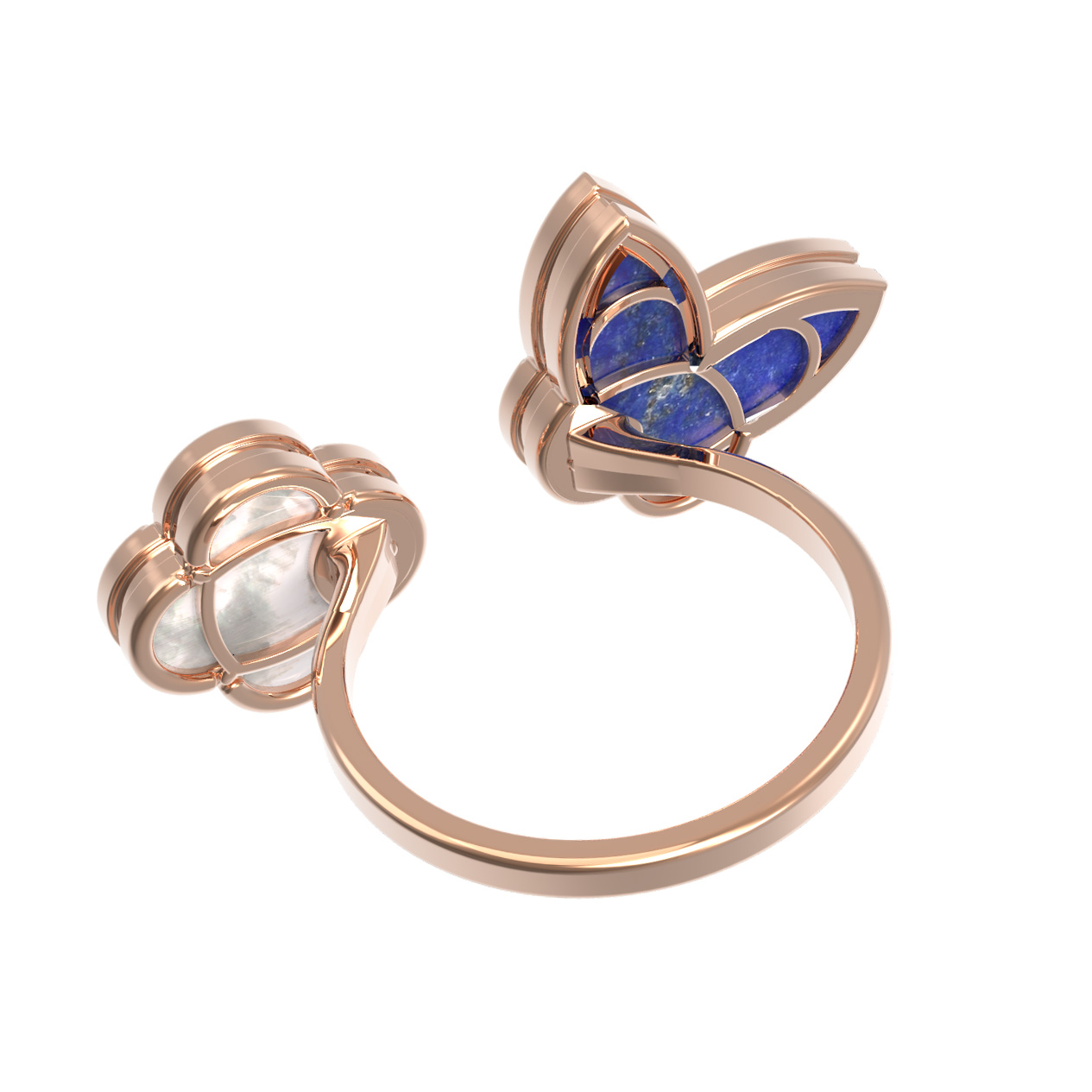 Композиция украшена двумя контрастными элементами: насыщенным синим лазуритом и нежным переливчатым перламутром. Сочетание этих натуральных камней создает гармоничный визуальный дуэт, который привлекает внимание своей глубиной и сиянием. Утонченные линии золотой оправы мягко обрамляют вставки, подчеркивая их природную красоту и статусность.