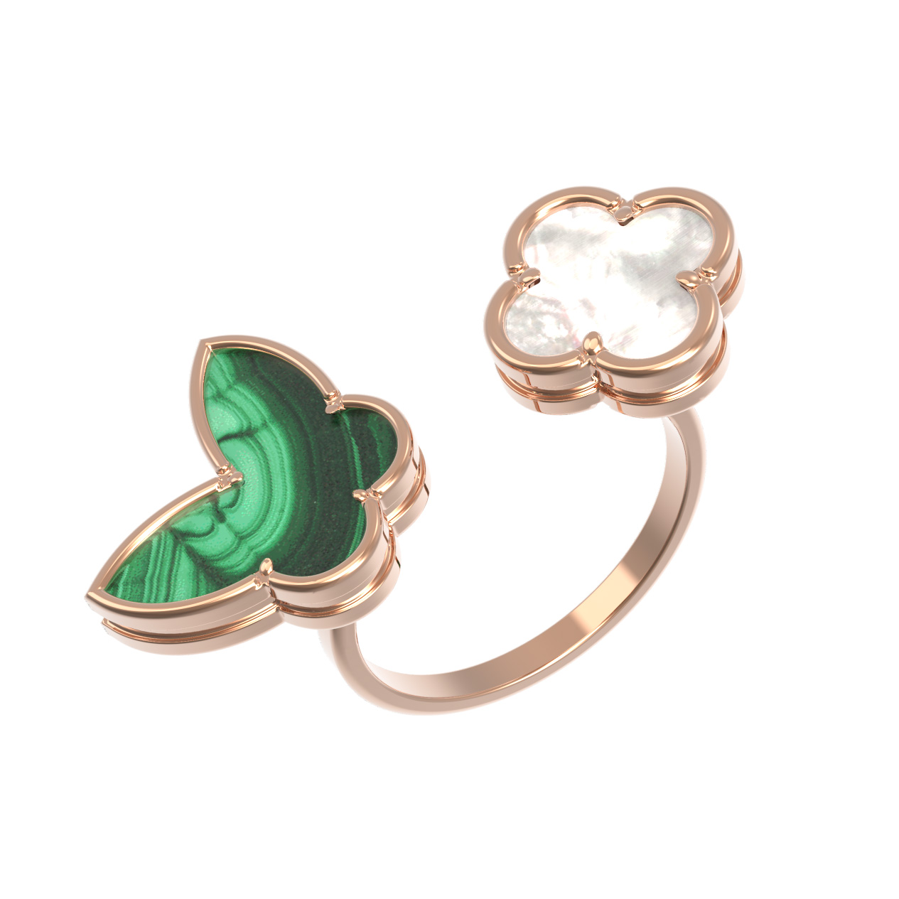 Уникальность украшения заключается в его открытой конструкции, где две вставки в форме клевера эффектно дополняют друг друга. Насыщенный зеленый цвет малахита с его характерным природным рисунком красиво перекликается с деликатным блеском перламутра. Красное золото подчеркивает глубину вставок и придает изделию теплое, благородное сияние. Это стильное кольцо универсально: оно подойдет как для женщин, так и для мужчин, желающих подчеркнуть свою индивидуальность.