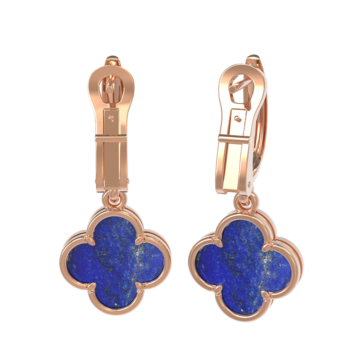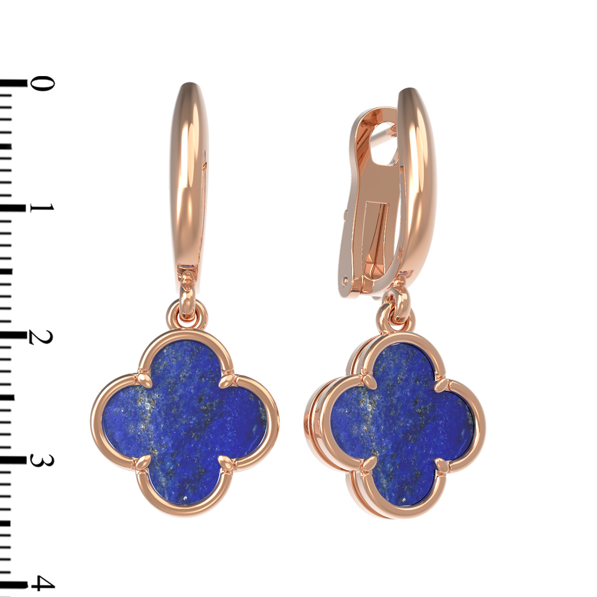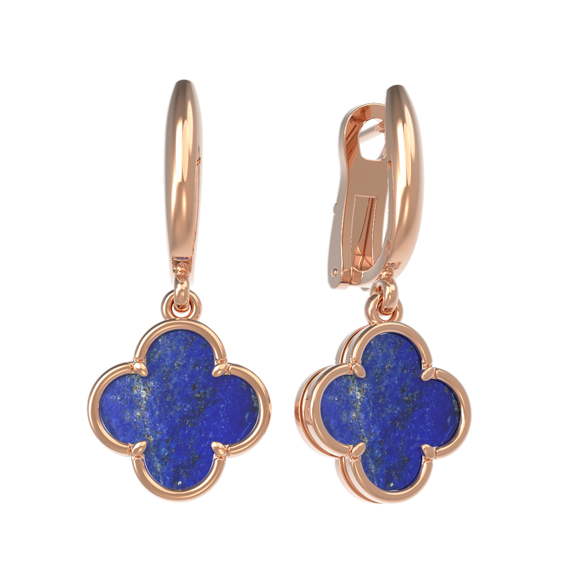 Элегантные серьги из красного золота 585 пробы станут изысканным акцентом вашего образа. Дизайн украшения вдохновлен флористическими мотивами и выполнен в форме узнаваемого символа удачи — клевера. Глубокий синий цвет вставок из натурального лазурита эффектно контрастирует с теплым оттенком драгоценного металла, создавая гармоничное и статусное сочетание. В каждой серьге расположено по одной вставке, которые приковывают взгляд своей насыщенной текстурой.