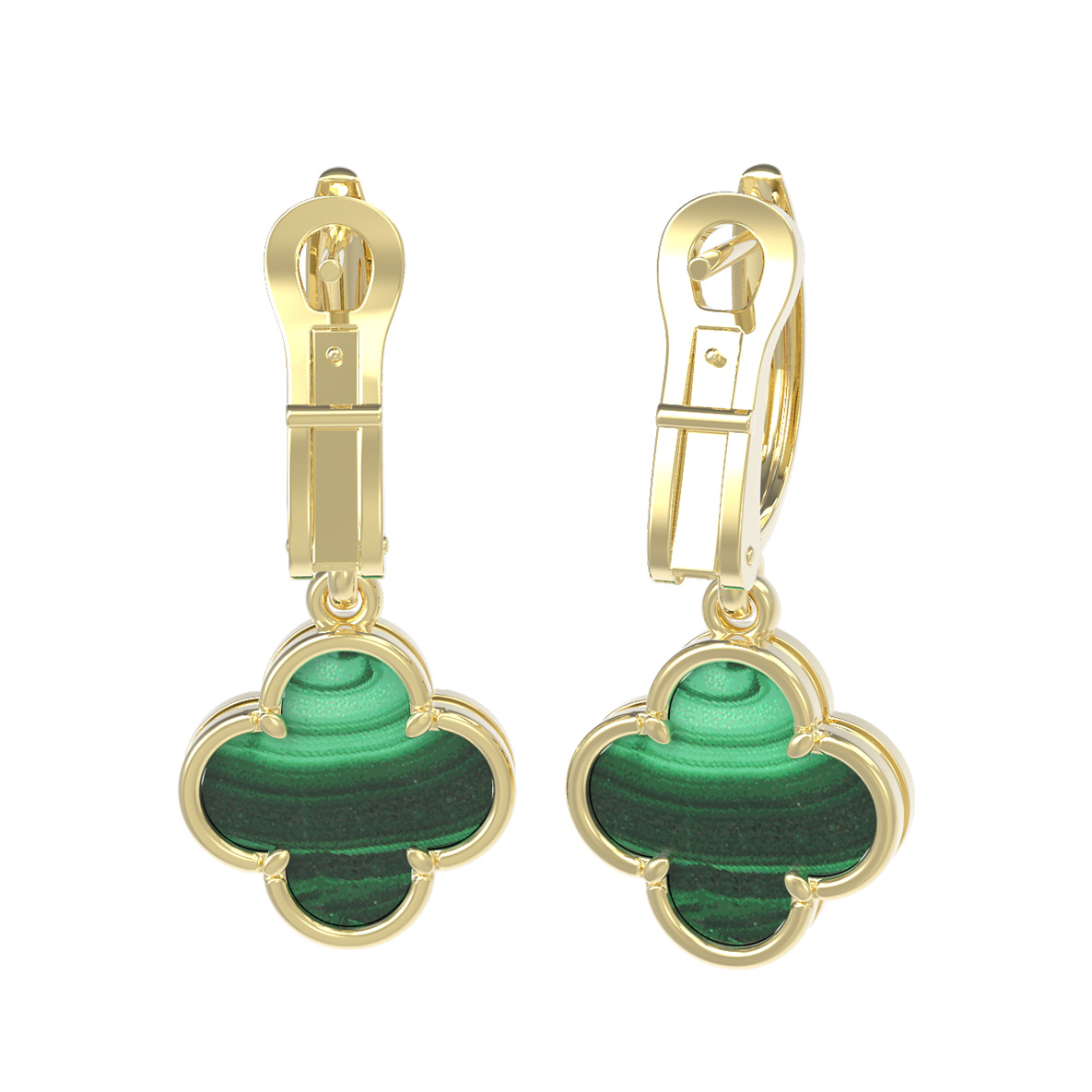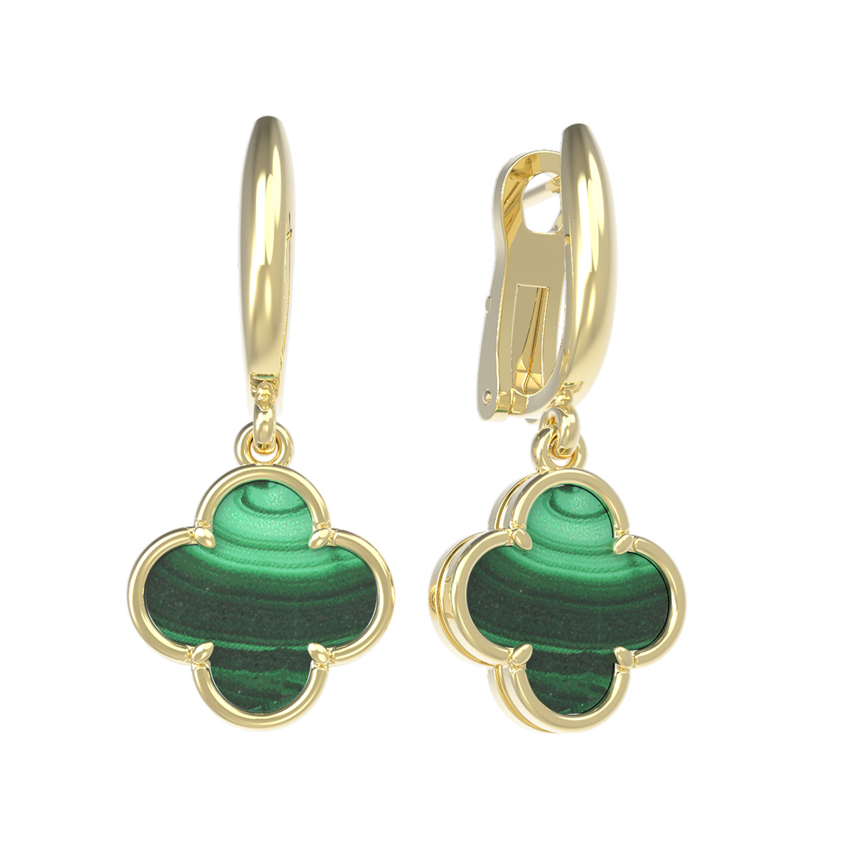 В дизайне этих серег использованы 2 вставки из натурального малахита, которые благодаря своей уникальной текстуре делают каждое украшение неповторимым. Конструкция изделия продумана до мелочей: серьги обладают комфортной посадкой и надежной застежкой, что позволяет носить их как в повседневной жизни, так и дополнять ими вечерние образы. Лаконичная форма клевера в сочетании с качественными материалами делает эту модель универсальным аксессуаром, который подходит как для женщин, так и для мужчин, предпочитающих статусные украшения.