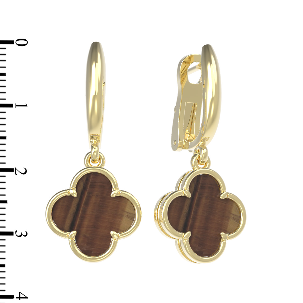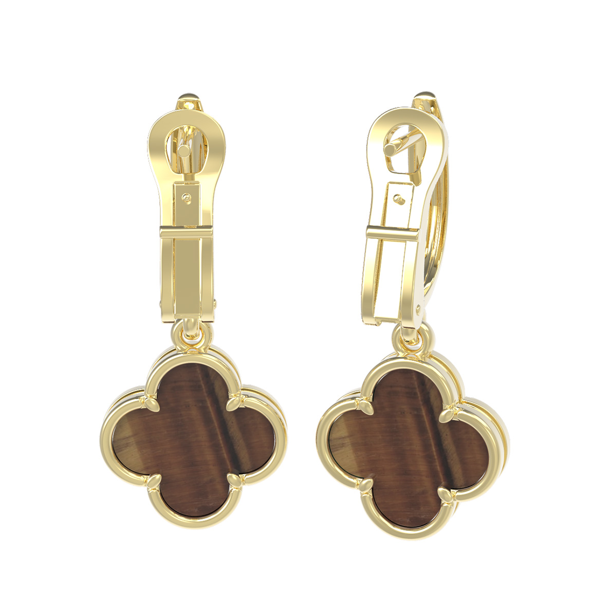 Центральным элементом дизайна стали две вставки из тигрового глаза. Этот полудрагоценный камень глубокого оранжевого цвета с характерными переливами притягивает взгляд и добавляет образу нотку загадочности и природной красоты. Благодаря качественной огранке, вставки ярко раскрывают свою текстуру, создавая гармоничный контраст с блеском лимонного золота.