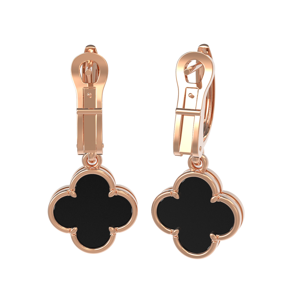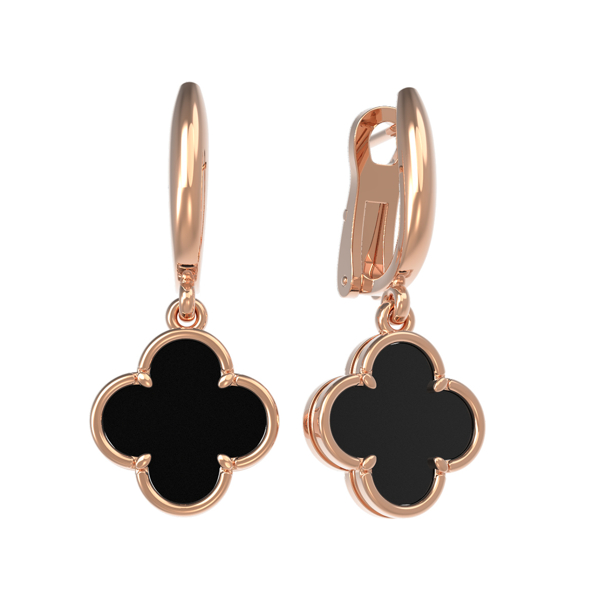 Серьги из красного золота 585 пробы из коллекции De Luxe — Клевер весна представляют собой сочетание лаконичного дизайна и изысканной эстетики. Главным акцентом украшения стал узнаваемый силуэт клевер, который придает образу нотки утонченности и символичного шарма. Глубокий черный цвет вставок оникса эффектно контрастирует с теплым блеском металла, создавая гармоничную композицию.