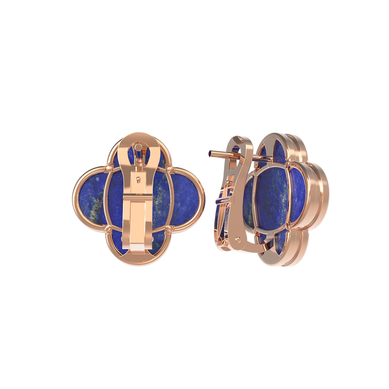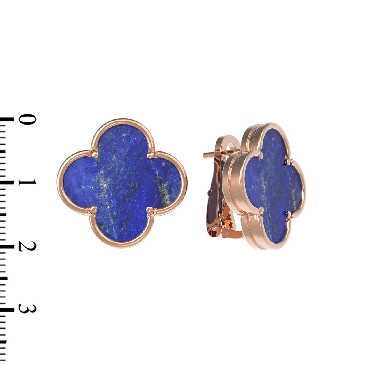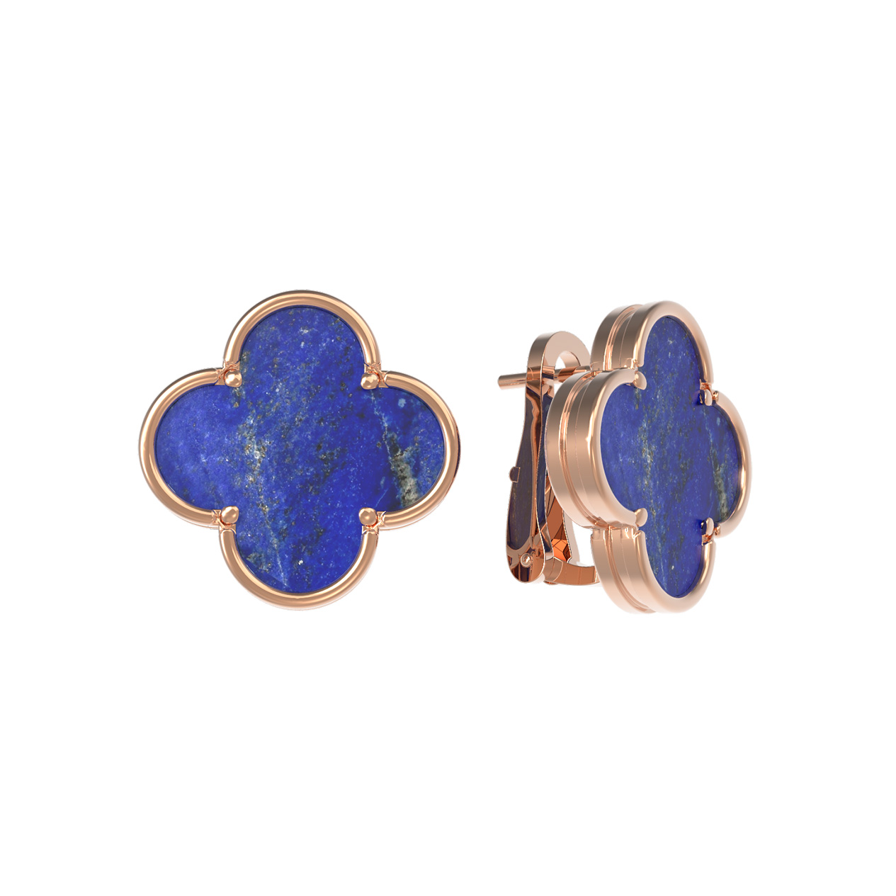 Элегантные серьги из красного золота 585 пробы станут изысканным дополнением к вашему образу. Украшение выполнено в популярном дизайне «клевер», который давно стал классикой ювелирного искусства. В центре композиции расположены две эффектные вставки из натурального лазурита глубокого синего цвета. Этот минерал с уникальным природным рисунком гармонично сочетается с теплым блеском красного золота, создавая выразительный контраст.
