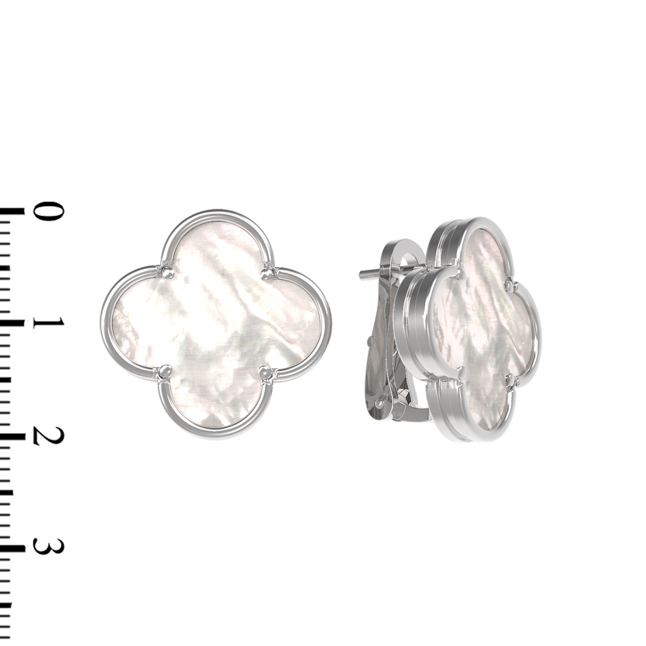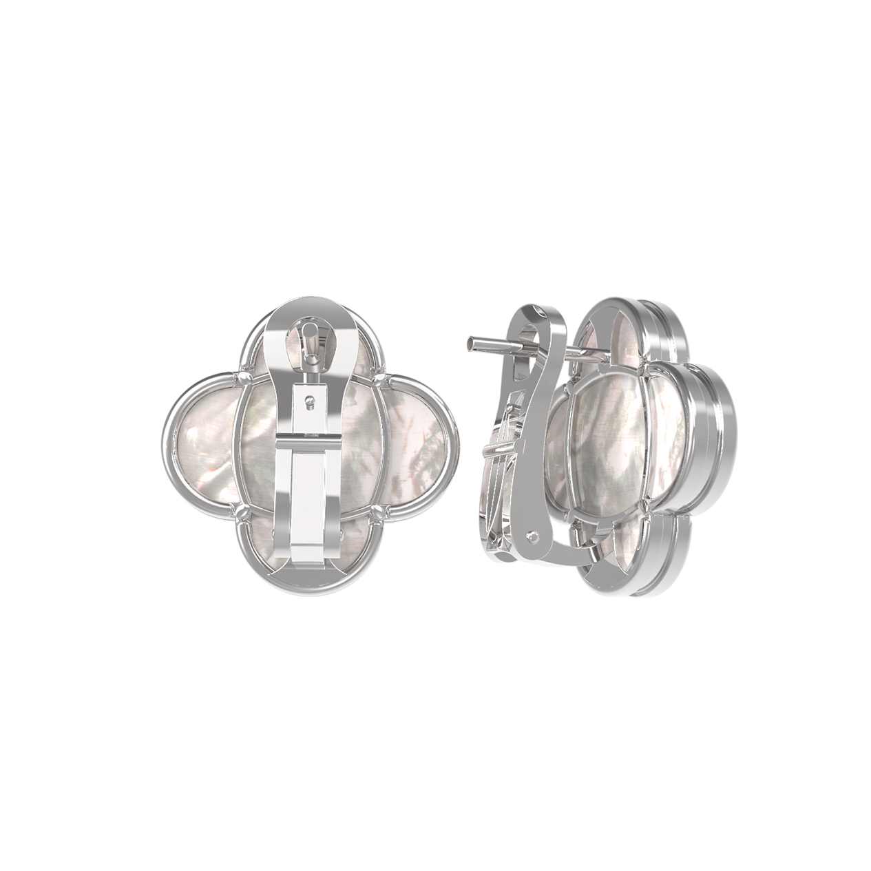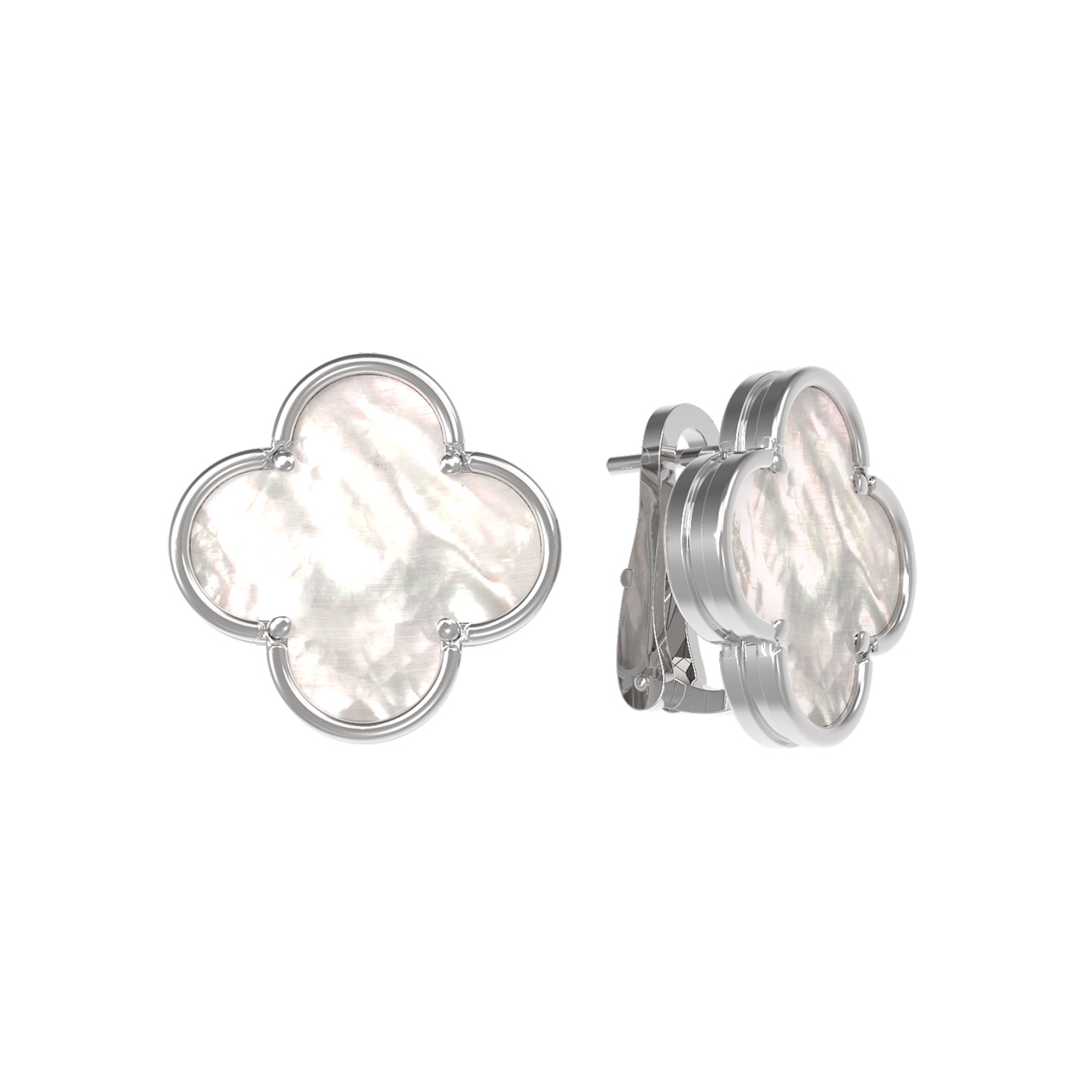 Центральную часть изделия украшает вставка из перламутра, обладающая неповторимым мягким сиянием и переливами, напоминающими блеск морской жемчужины. Перламутр цвета слоновой кости идеально сочетается с холодным блеском белого золота, создавая притягательный визуальный акцент. Гладкие линии оправы подчеркивают изящную форму клевера, делая украшение заметным, но при этом лаконичным аксессуаром для любого случая.
