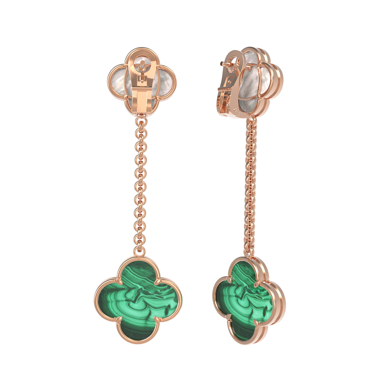 Данная модель из коллекции De Luxe — Клевер весна отличается продуманной конструкцией: подвижное соединение элементов придает серьгам легкость и динамику при каждом движении. Красный цвет золота подчеркивает природную насыщенность малахита и деликатный перламутровый перелив вставок, создавая сбалансированное и стильное украшение. Эти серьги подойдут как для женщин, так и для мужчин, предпочитающих современные аксессуары с глубоким смыслом и безупречным качеством исполнения.