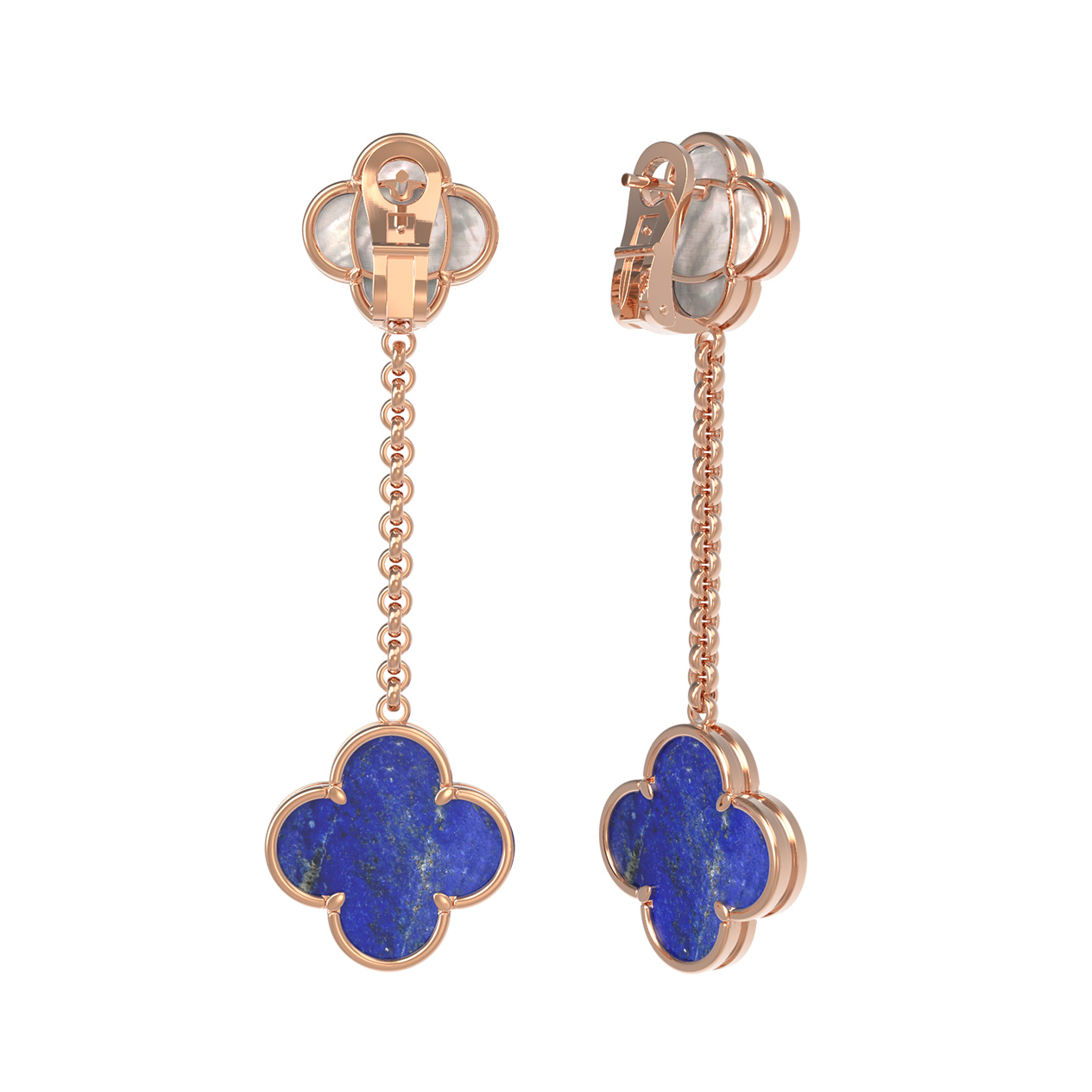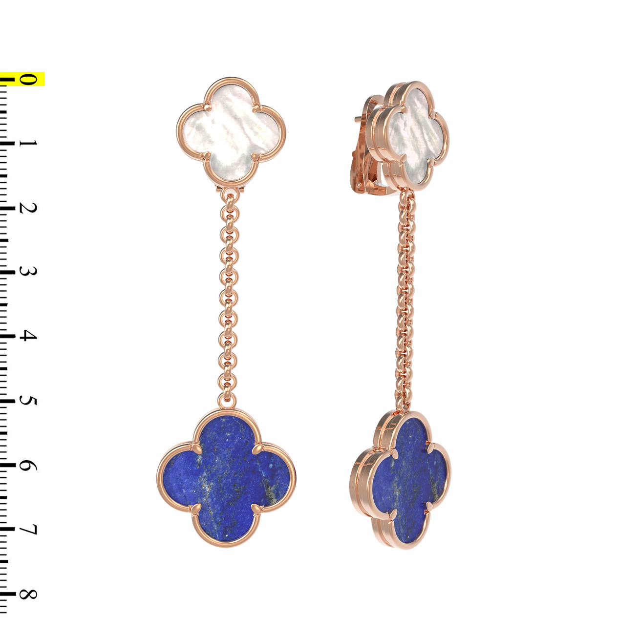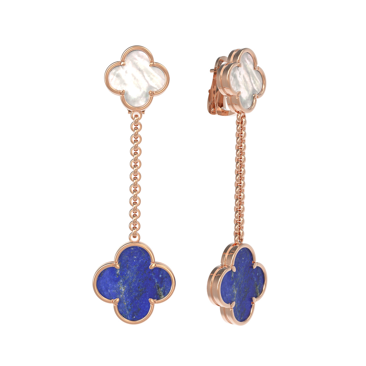 Серьги из красного золота 585 пробы из коллекции De Luxe — Клевер весна представляют собой изысканное сочетание классических материалов и актуального дизайна. В центре композиции — узнаваемый мотив клевер, который придает украшению особую эстетику и утонченность. Благородный блеск красного золота идеально гармонирует с контрастными вставками: глубоким синим лазуритом и нежным перламутром. Каждая серьга содержит 2 вставки, создающие эффектный визуальный акцент.