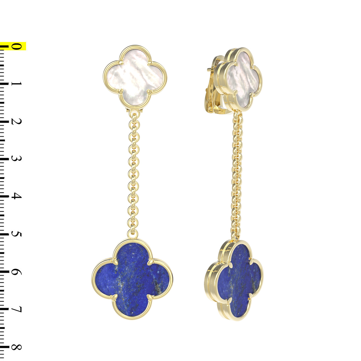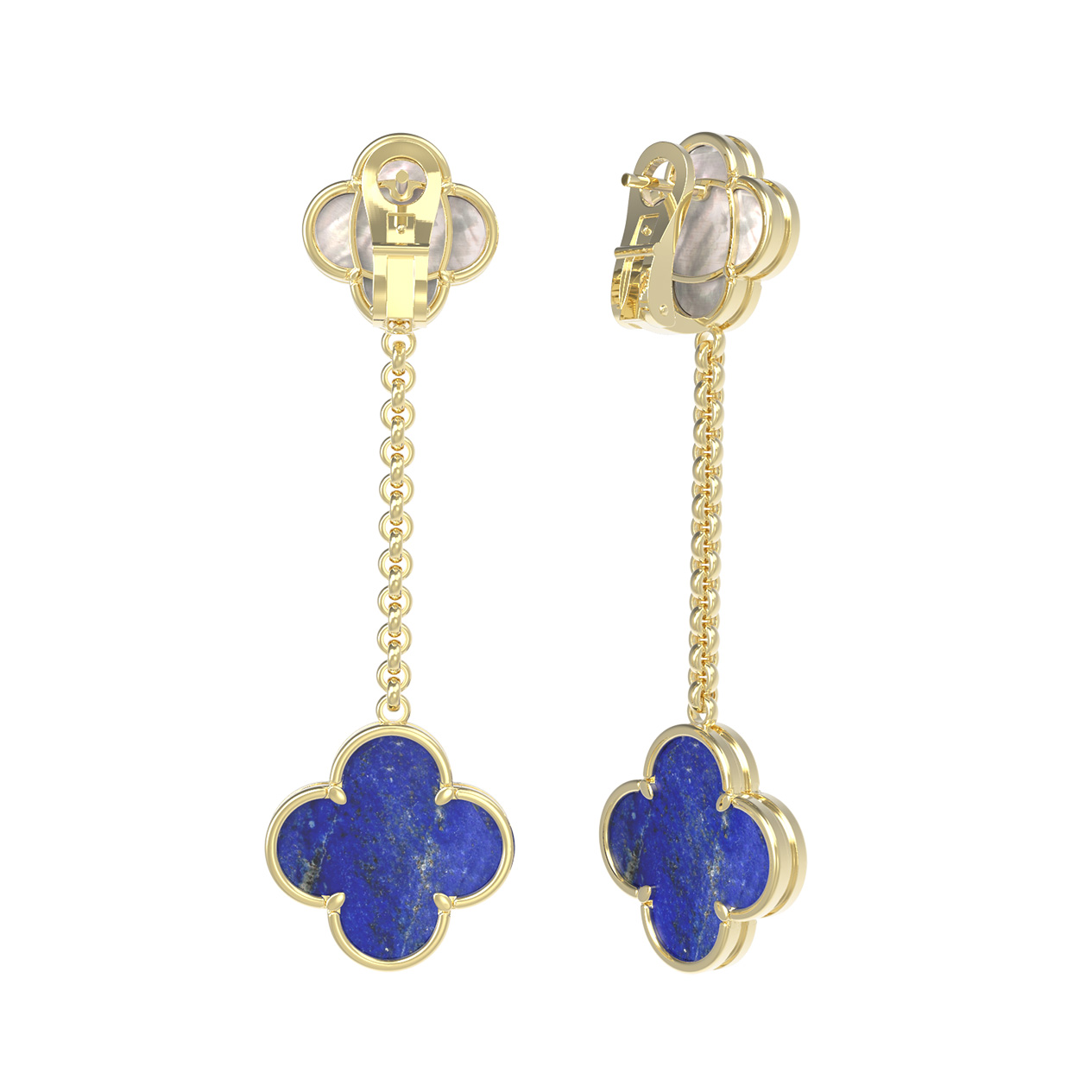 Серьги выполнены с вниманием к деталям: изящная цепочка соединяет верхний элемент с инкрустацией из перламутра и нижний подвесной элемент с лазуритом. Общее количество вставок составляет 2. Благодаря универсальной эстетике и выверенным линиям, эти серьги подходят для женщин и мужчин, которые ценят стиль и лаконичность. Дизайн в форме клевера символизирует удачу и природную красоту, воплощенную в ювелирном искусстве. Данное изделие прекрасно дополнит вечерний или повседневный наряд, а также может стать частью изысканного комплекта украшений. Привнесите ноту роскоши в свою коллекцию аксессуаров с этим оригинальным ювелирным творением из лимонного золота.