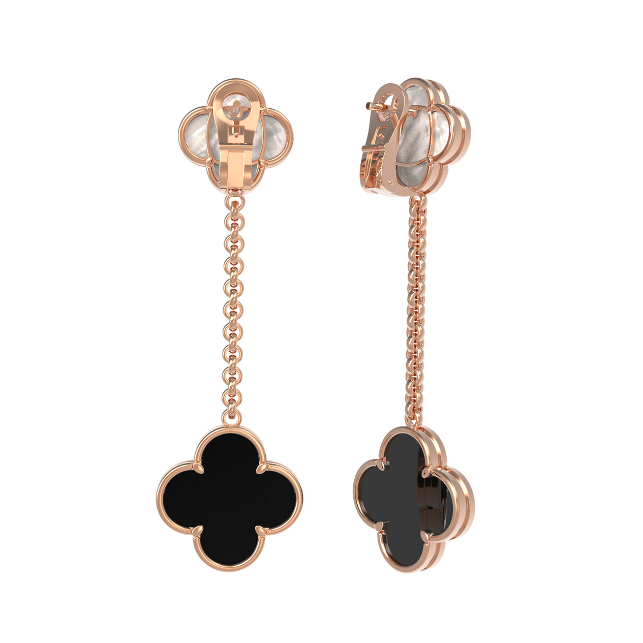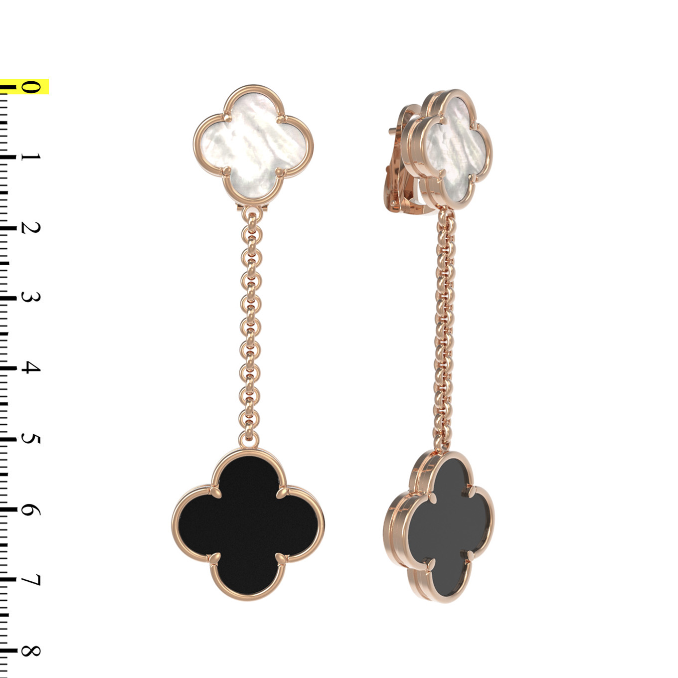 В модели гармонично сочетаются два элемента в виде клевера, соединенные изящной золотой цепочкой, что создает эффектное движение при каждом вашем шаге. Две вставки — оникс и перламутр — придают украшению универсальность, позволяя сочетать его как с вечерними нарядами, так и с более сдержанными повседневными образами. Это стильное ювелирное изделие подходит для женщин и мужчин, которые ценят внимание к деталям и премиальное качество исполнения.