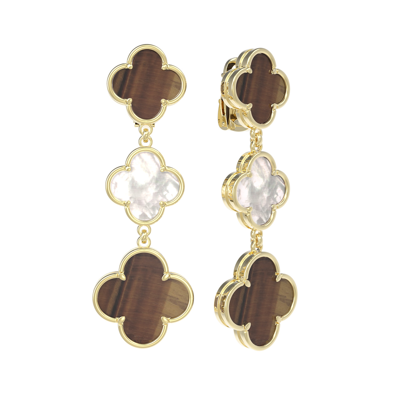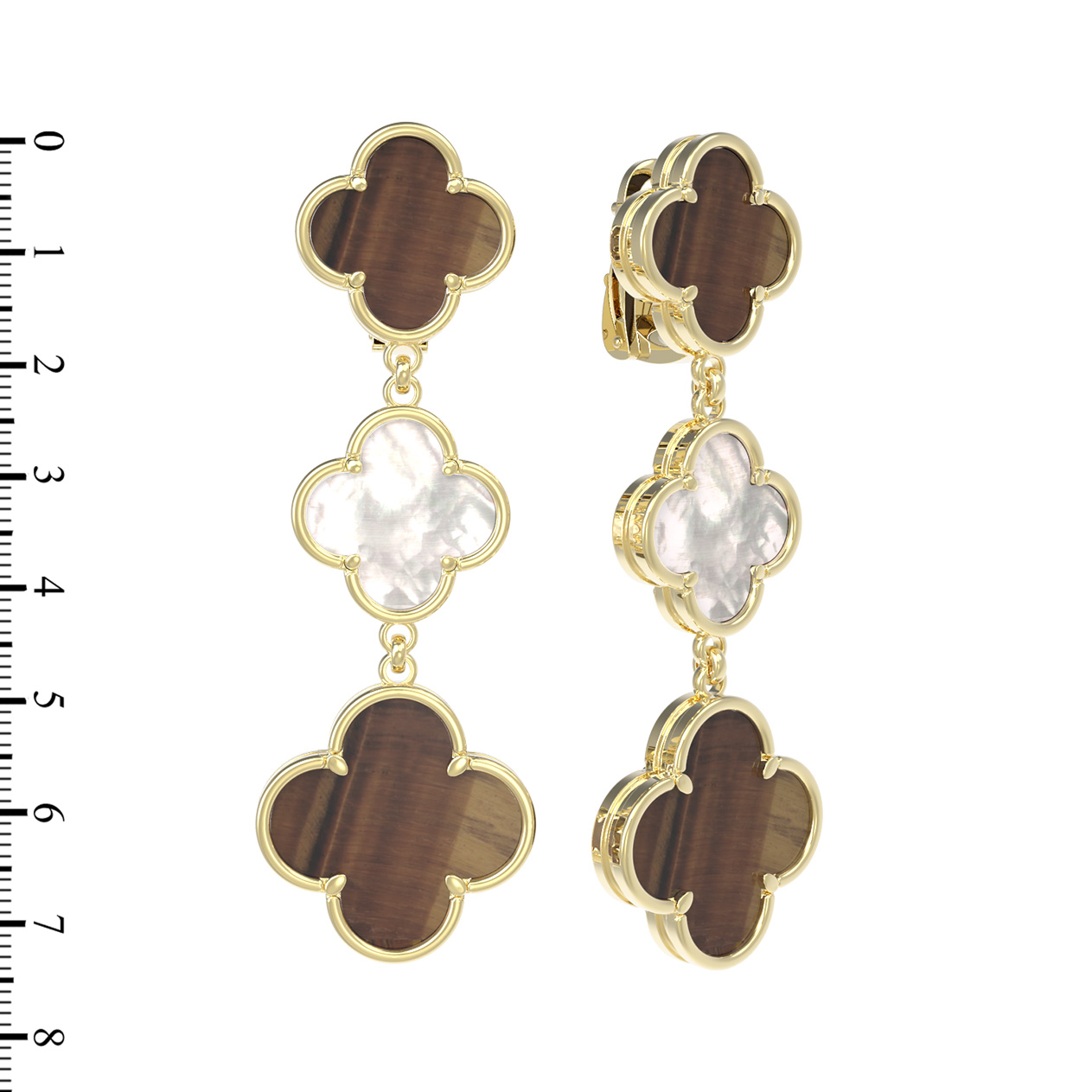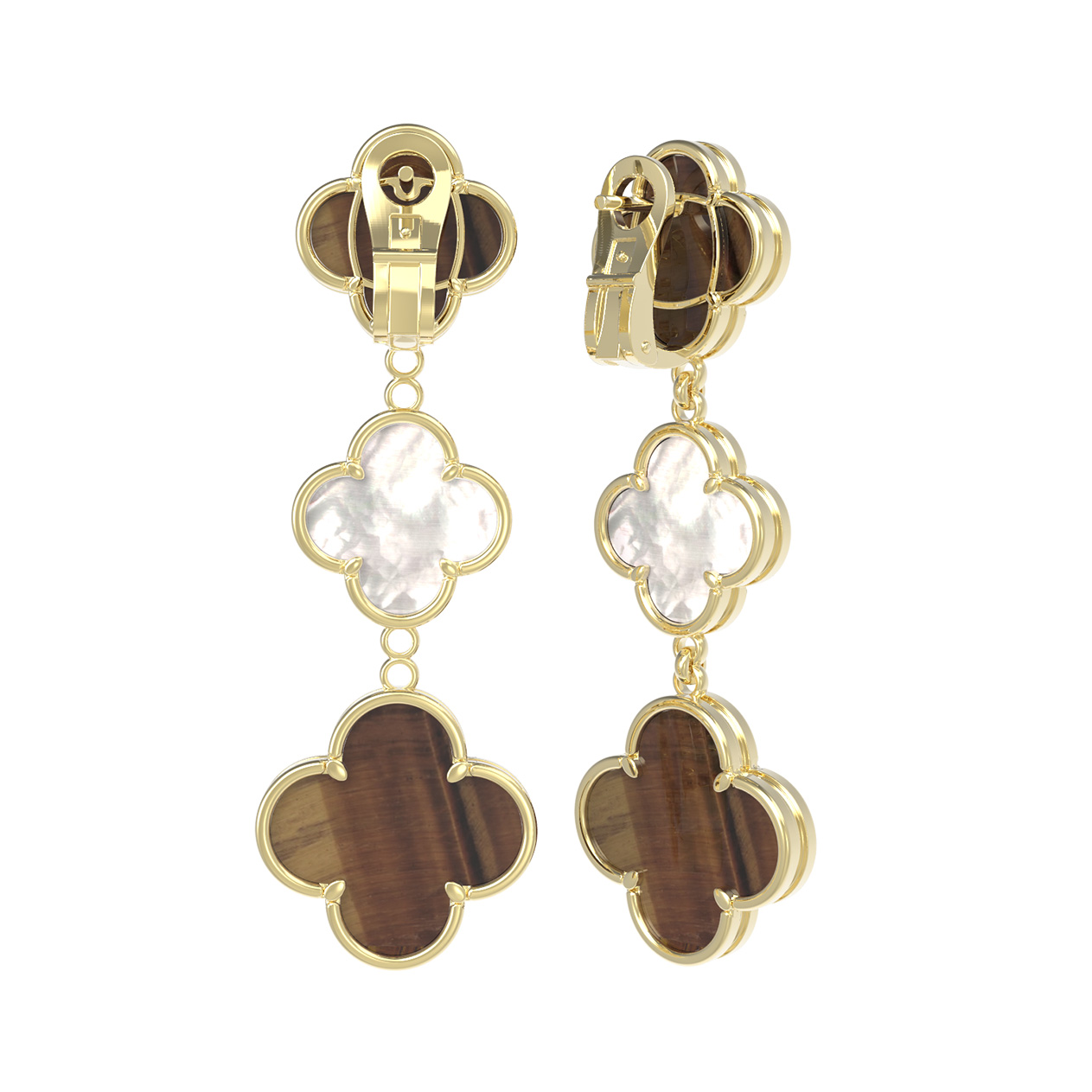 Особую выразительность серьгам придает сочетание двух контрастных материалов: загадочного оранжевого тигрового глаза и нежного перламутра. Каждое изделие украшено четырьмя вставками, которые чередуются, создавая динамичный и привлекательный визуальный ряд. Глубокий, переливчатый блеск тигрового глаза гармонично дополняется мягким, перламутровым сиянием, придавая образу особую роскошь и завершенность.