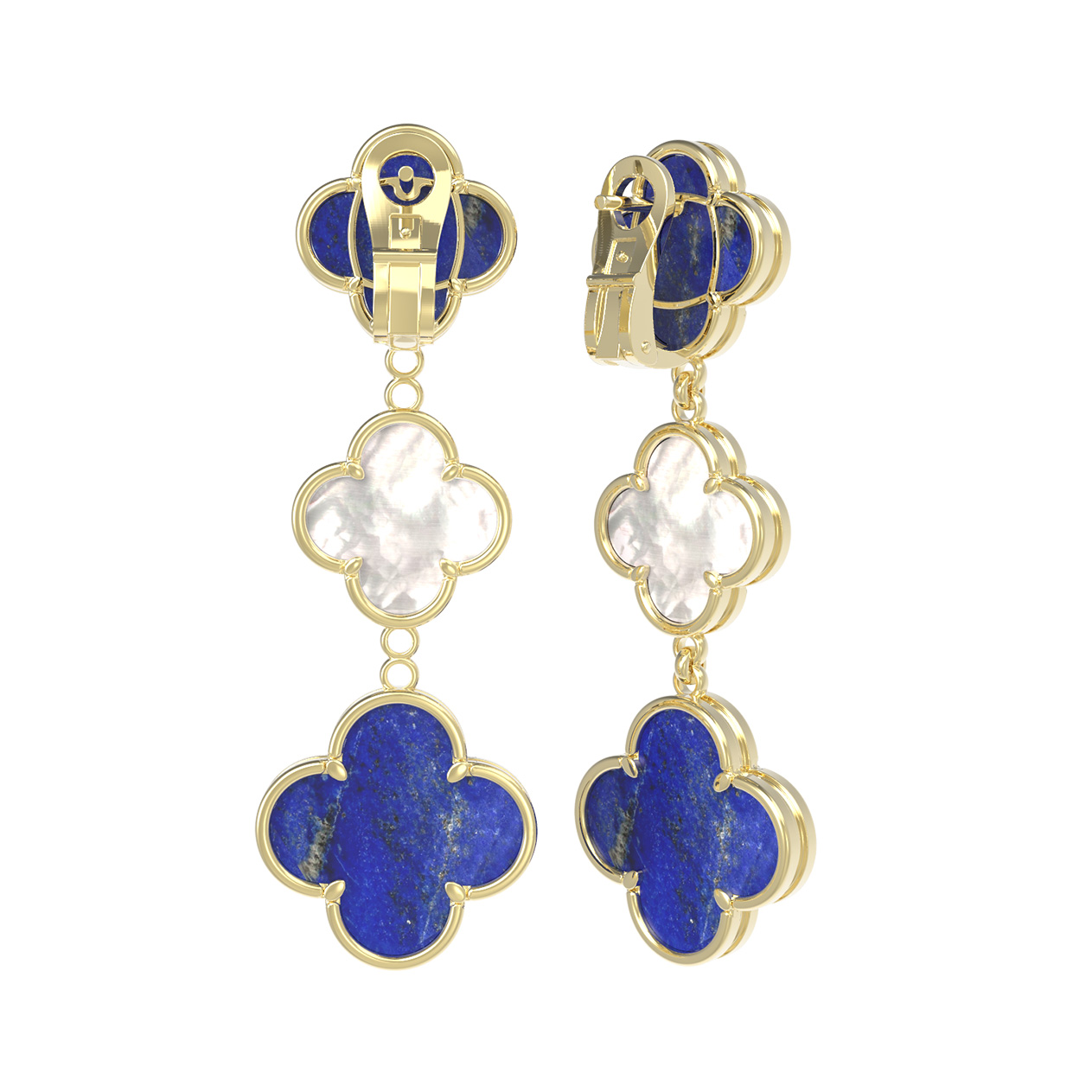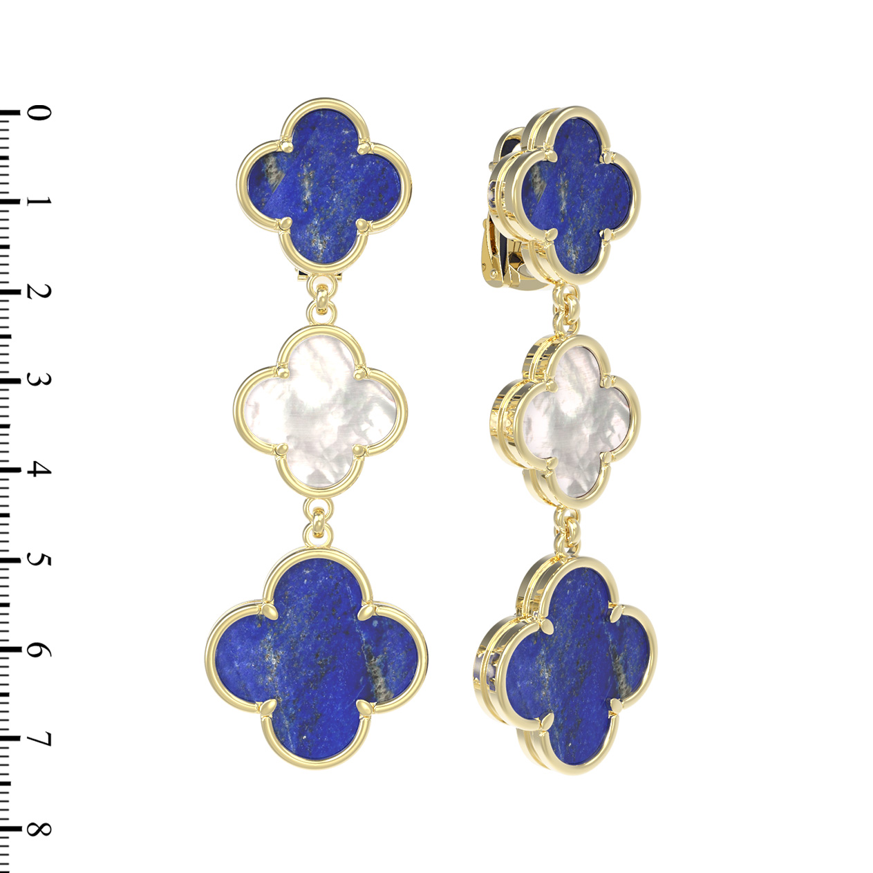 Эффектные серьги из лимонного золота 585 пробы из коллекции De Luxe — Клевер весна станут ярким акцентом вашего образа. Дизайн украшения, выполненный в форме изысканного клевера, подчеркивает статусность и тонкий вкус владельца. Ювелирная композиция состоит из 4 вставок: насыщенного синего лазурита и нежного перламутра, которые гармонично дополняют друг друга, создавая контрастное и благородное сочетание.