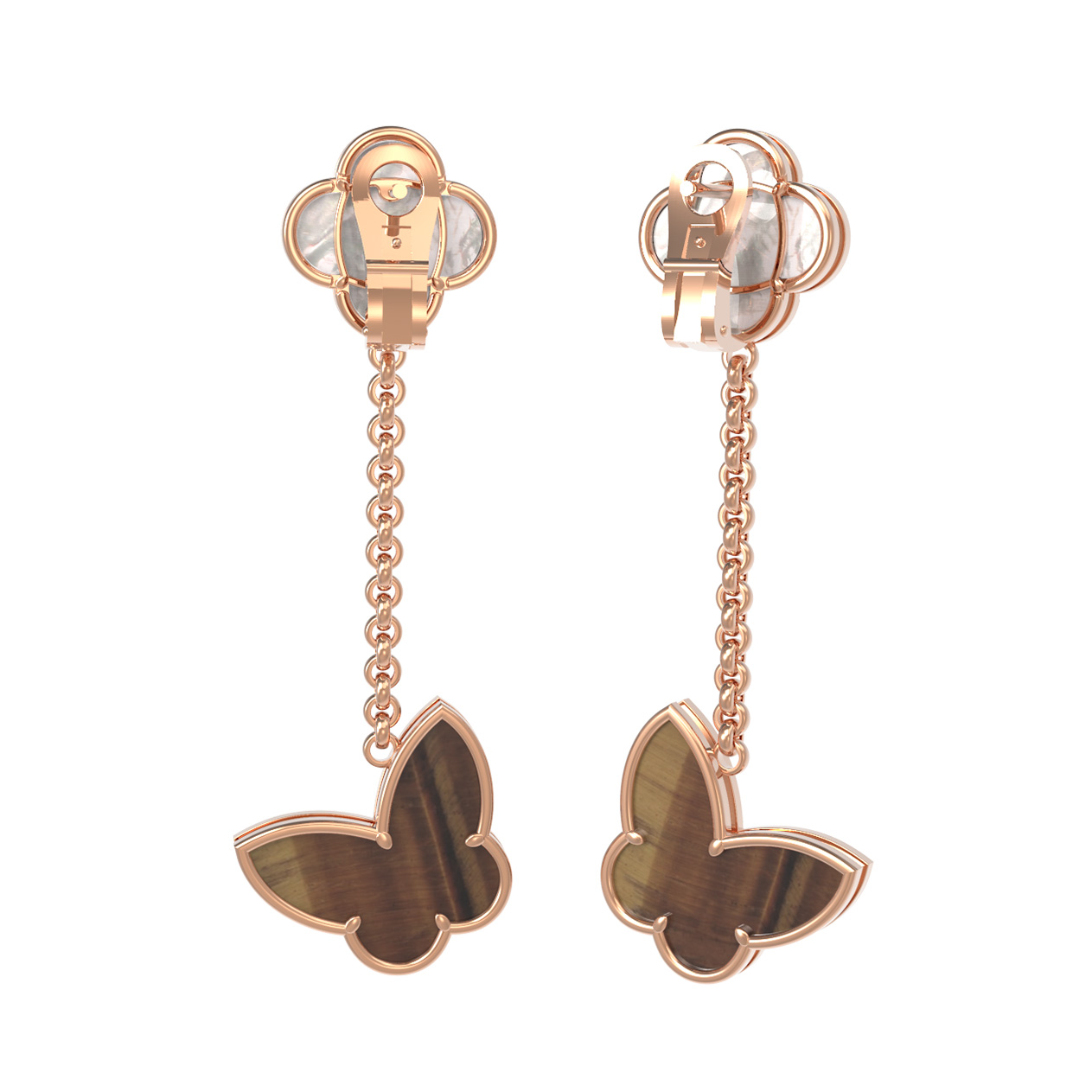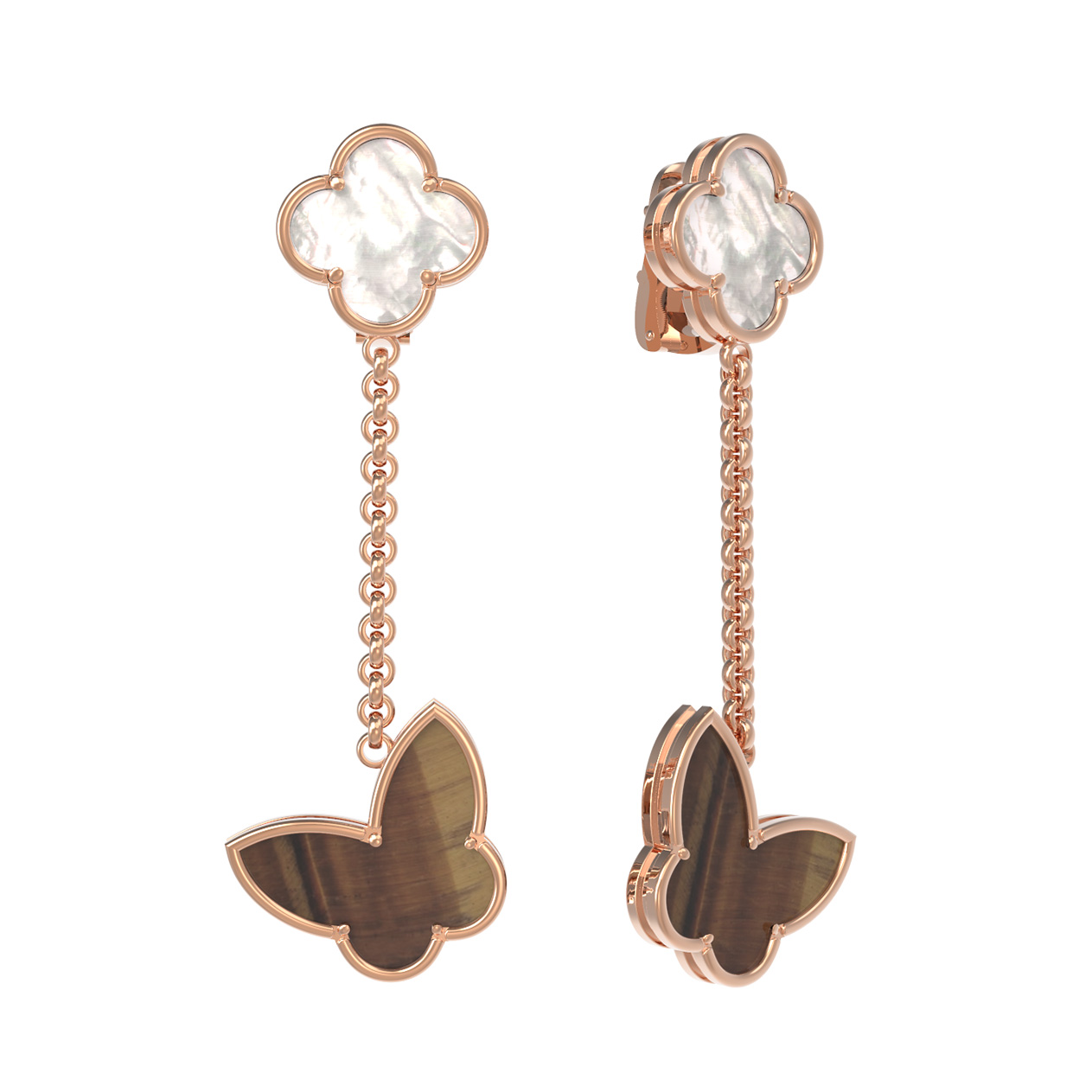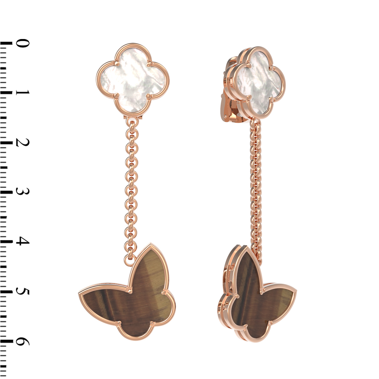 В центре композиции — 2 вставки, сочетающие в себе классическую нежность перламутра и выразительную глубину тигрового глаза. Перламутр придает изделию мягкое сияние, а оранжевый цвет тигрового глаза добавляет акцент, создавая изысканный контраст. Благодаря продуманной форме и качественному исполнению, серьги эффектно смотрятся при каждом движении.