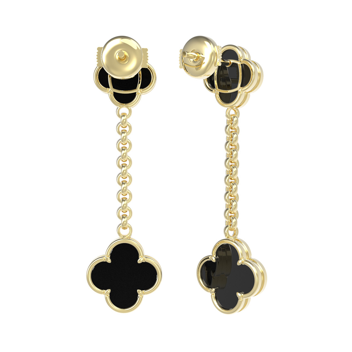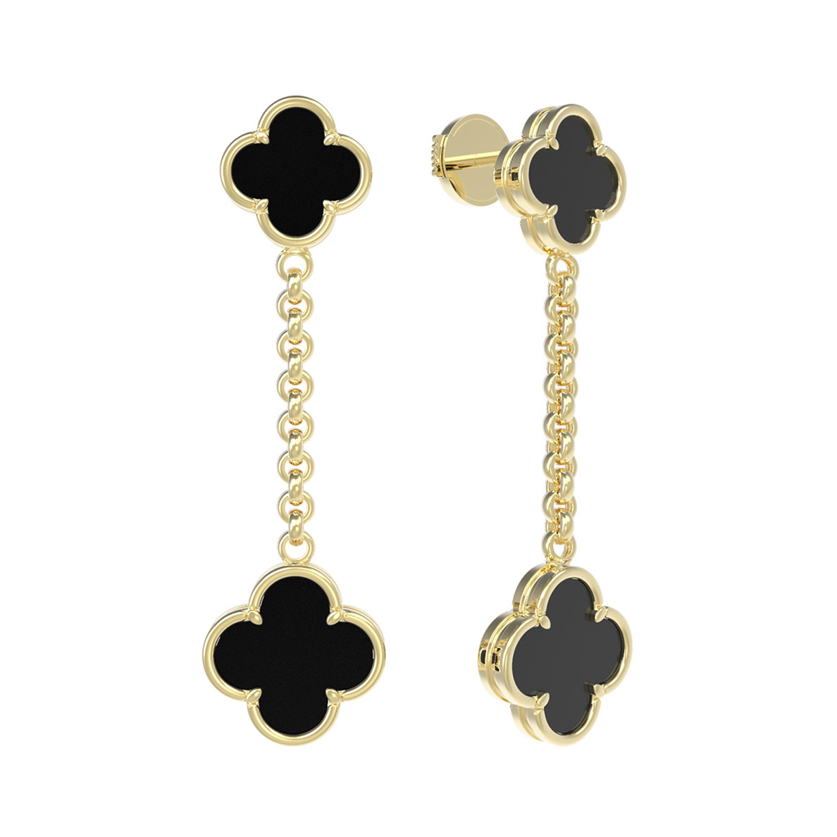 Главным украшением служит благородный оникс с насыщенным черным цветом вставок. Этот природный камень придает украшению строгость и особую выразительность, подчеркивая статусность владельца. Конструкция серег включает 4 вставки оникса, расположенные таким образом, чтобы максимально эффектно отражать свет при каждом движении.