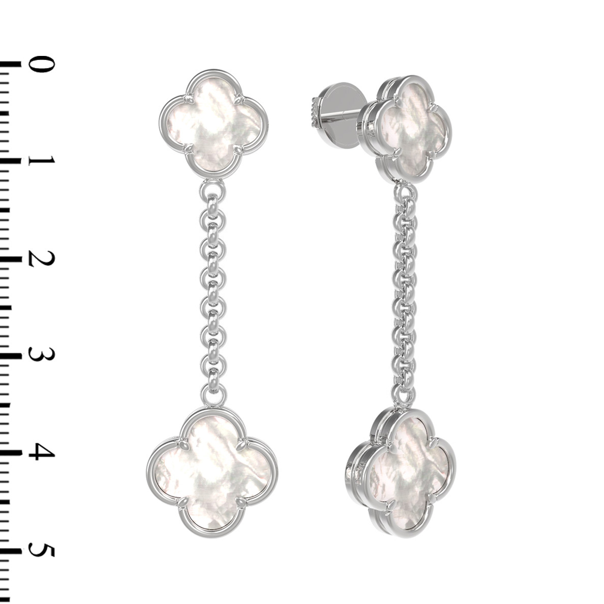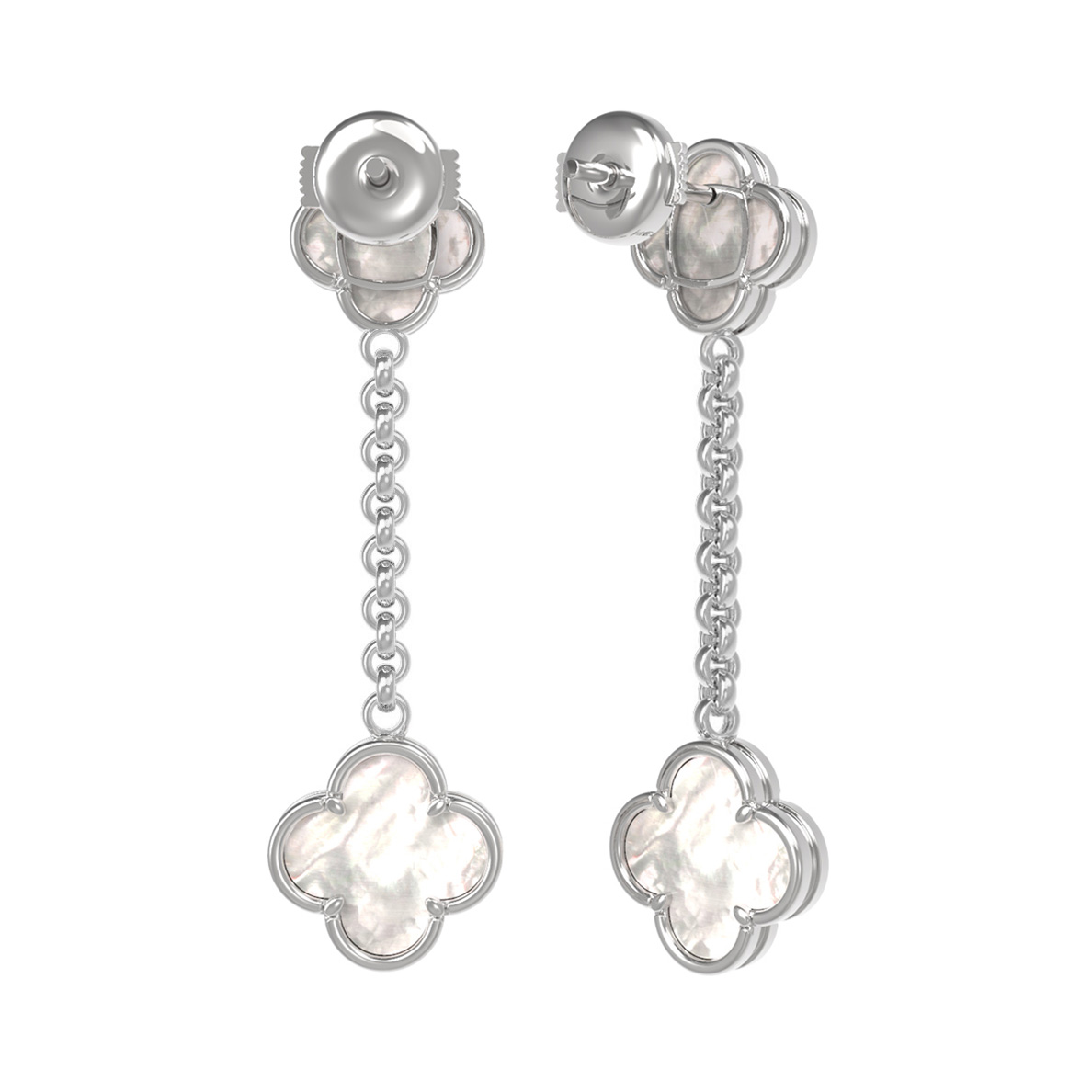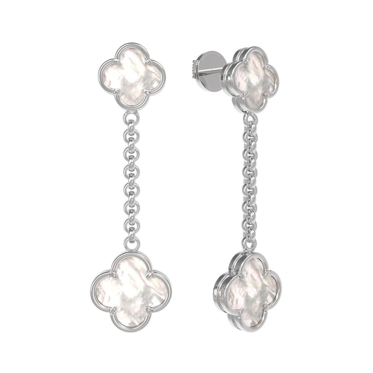 Центральным элементом композиции является натуральный перламутр с его мягким, переливающимся блеском. Белый цвет вставок гармонично сочетается с холодным сиянием благородного металла, создавая свежий и сдержанный образ. Длинная подвесная конструкция серьги придает динамику каждому движению, привлекая внимание к линии шеи и лица.