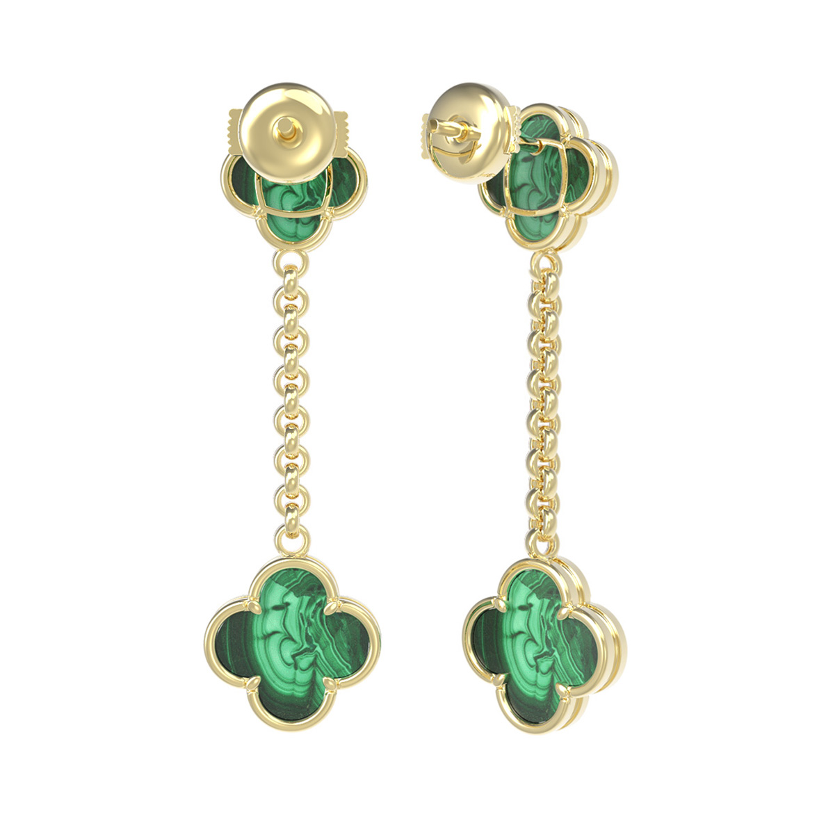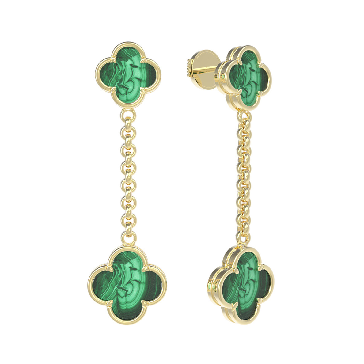 Серьги имеют продуманную конструкцию: в их оформлении использованы 4 вставки, что создает гармоничный и завершенный вид. Тонкая, изящная цепочка придает украшению динамику и легкость при каждом движении. Лимонный оттенок золотого металла прекрасно сочетается с ярким зеленым цветом малахита, создавая стильный контраст.