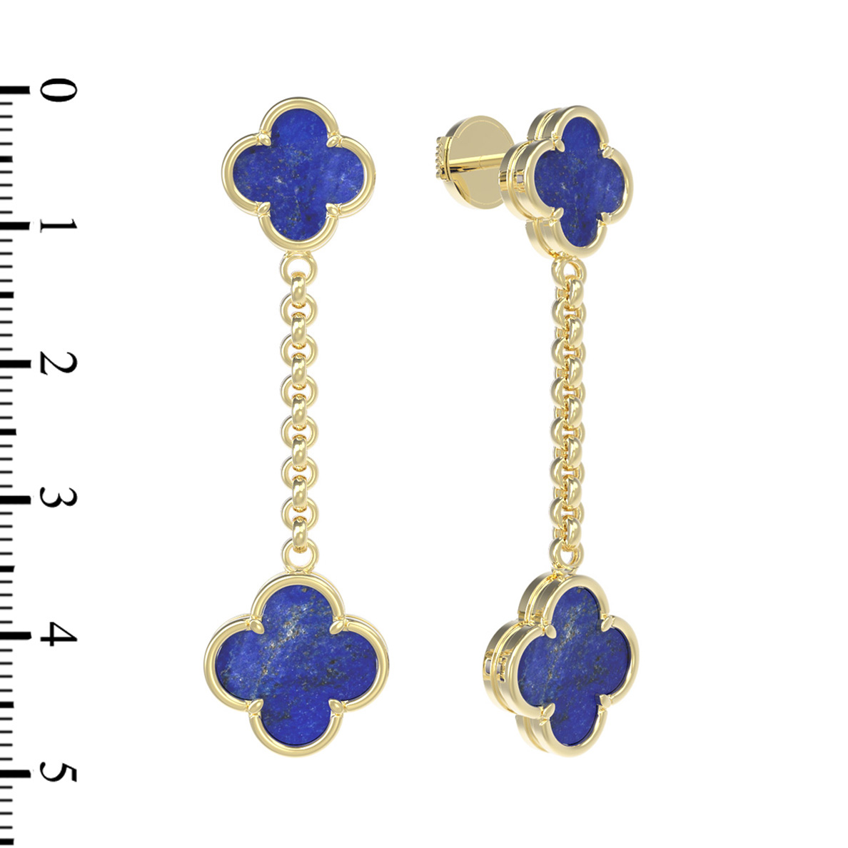 Конструкция серег представляет собой изящную подвесную композицию, где элементы в форме клевера соединены тонкой цепочкой. Подвижная часть изделия придает украшению легкость и динамичность, заставляя его мягко покачиваться при каждом движении. Глубокий синий оттенок лазурита в обрамлении теплого лимонного металла выглядит благородно и статусно.