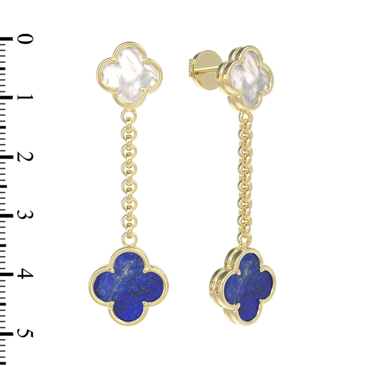 Оригинальная конструкция сочетает в себе классику и современные ювелирные тренды: элегантная цепочка, соединяющая две части декора, создает легкую динамику при каждом движении. Вставки из натурального перламутра и лазурита подчеркивают контраст материалов, делая эти серьги по-настоящему выразительными. Изделие оснащено двумя вставками, которые придают украшению завершенность и стиль.
