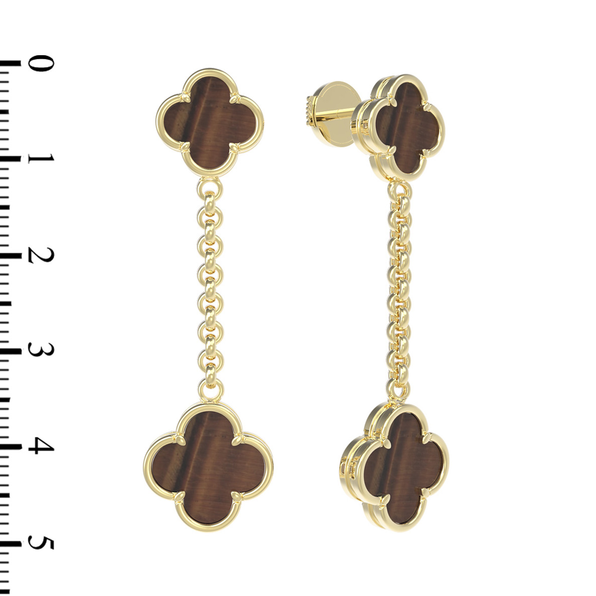 Центральным элементом дизайна является узнаваемый мотив клевера, который привносит в образ нотки природной эстетики и символизма. Вставки из натурального тигрового глаза оранжевого оттенка подчеркивают изысканность работы: всего в украшении использовано 4 камня, создающих акцентную игру цвета. Благодаря удлиненной форме и подвижному соединению, серьги эффектно двигаются при ходьбе, притягивая взгляды к их владельцу.