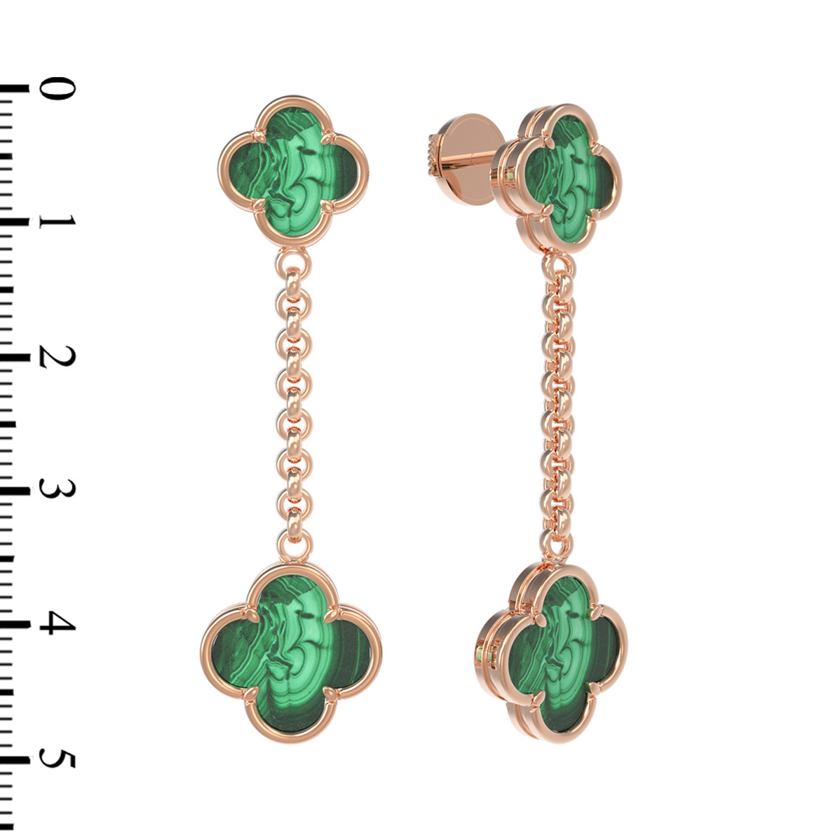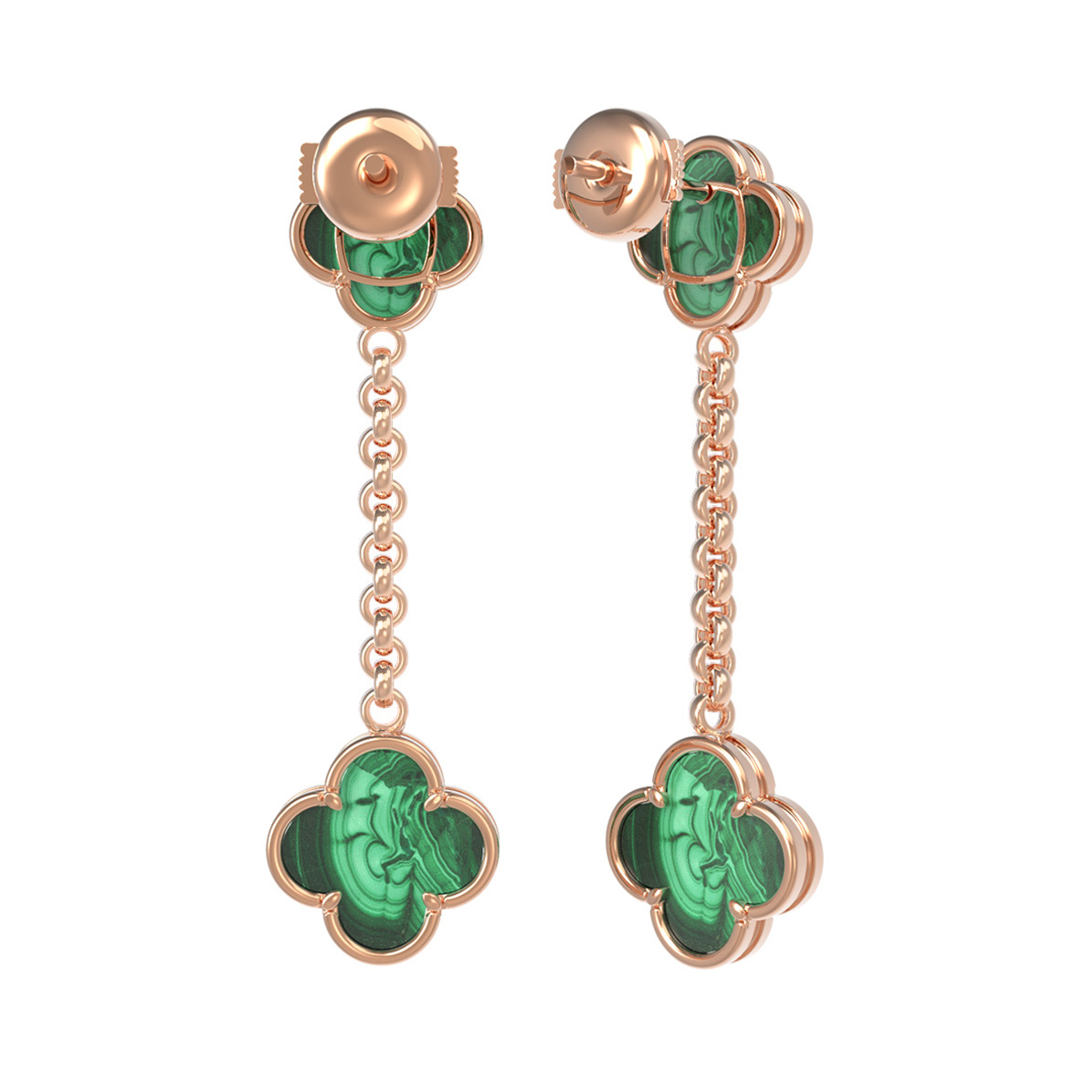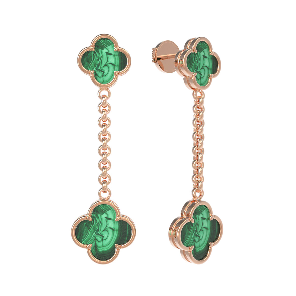 Данная модель из коллекции De Luxe — Клевер весна отличается изысканностью исполнения. Каждое украшение дополнено четырьмя вставками малахита, которые перекликаются между собой, создавая завершенную композицию. Длинная подвесная часть серег придает им динамику и грацию, подчеркивая естественную красоту каждой линии.