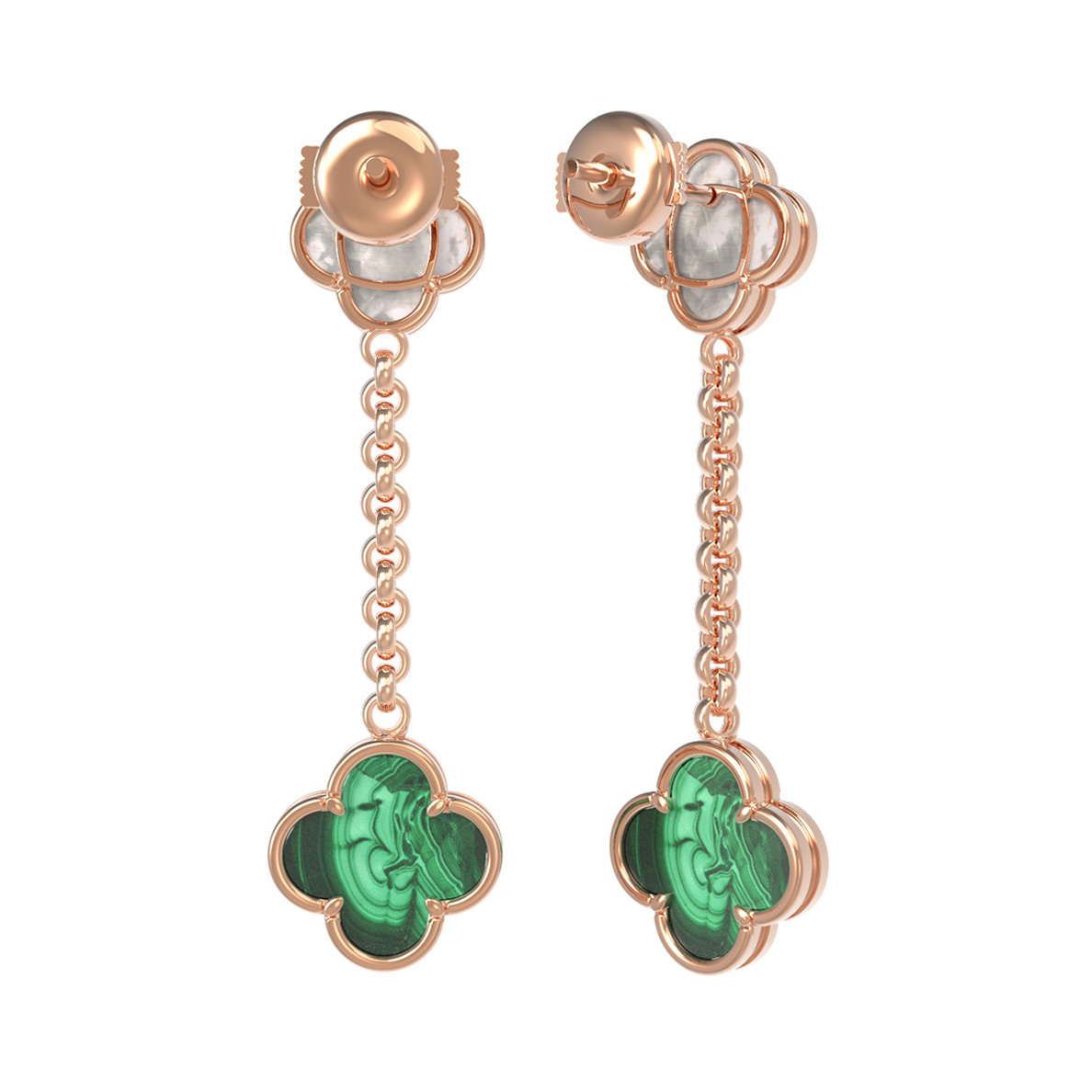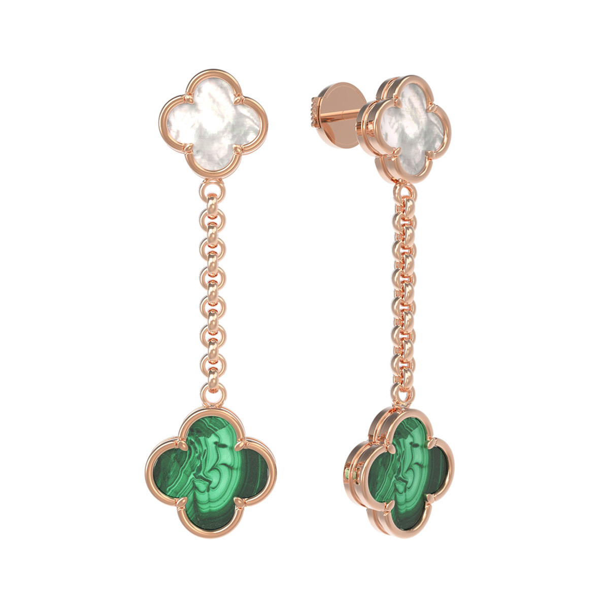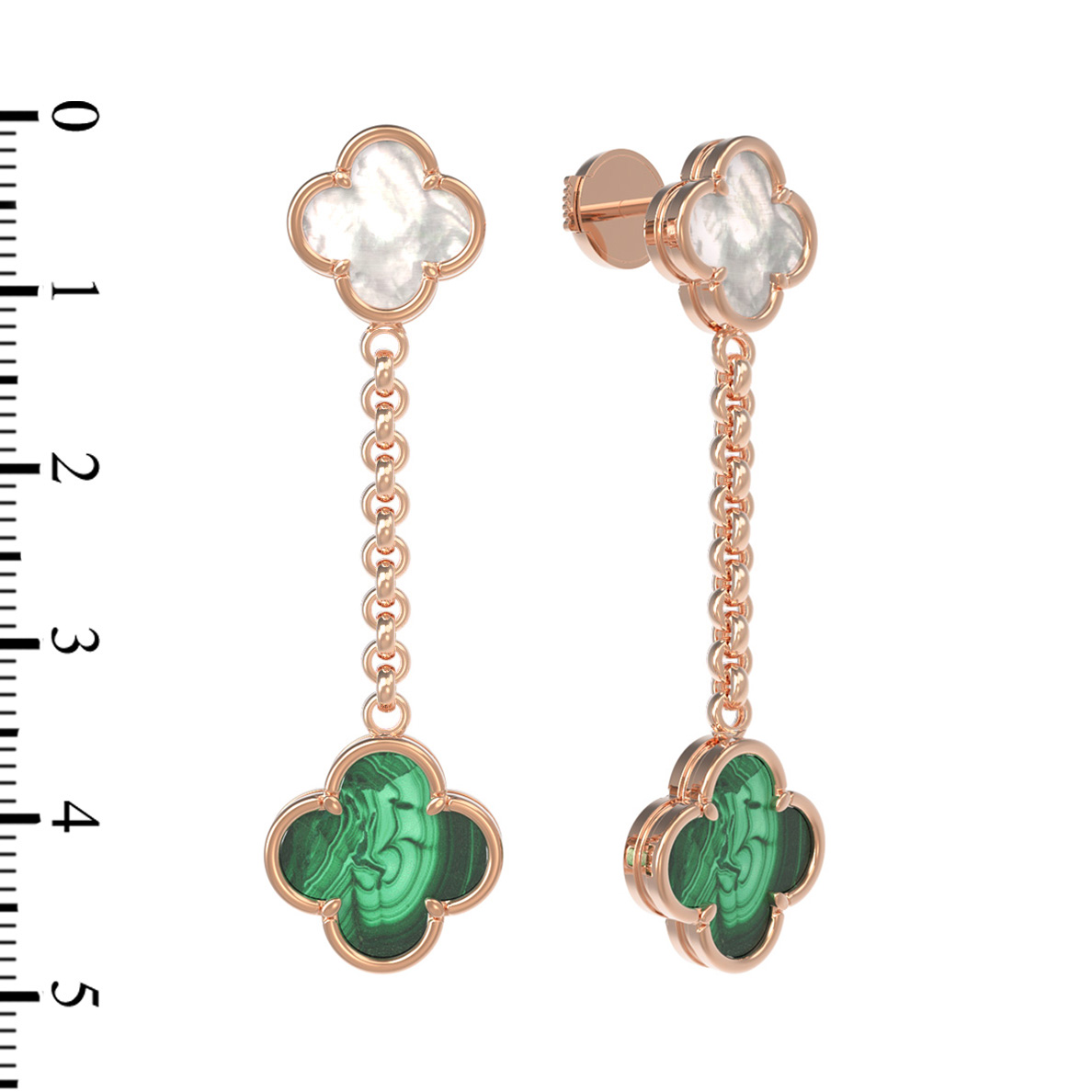 В центре композиции расположены две вставки: глубокий зеленый малахит и нежный перламутр, контраст которых создает завораживающую игру света и цвета. Красное золото теплого оттенка идеально подчеркивает природную текстуру камней, делая серьги универсальным аксессуаром. Благодаря своей лаконичной форме и выверенным пропорциям, эти украшения гармонично дополнят любой образ.