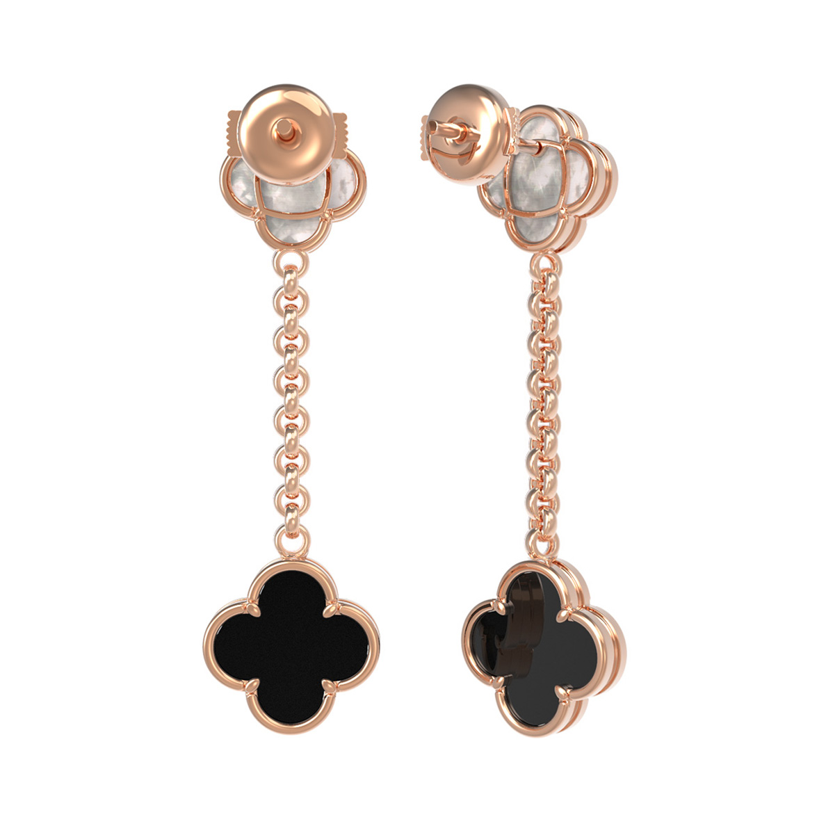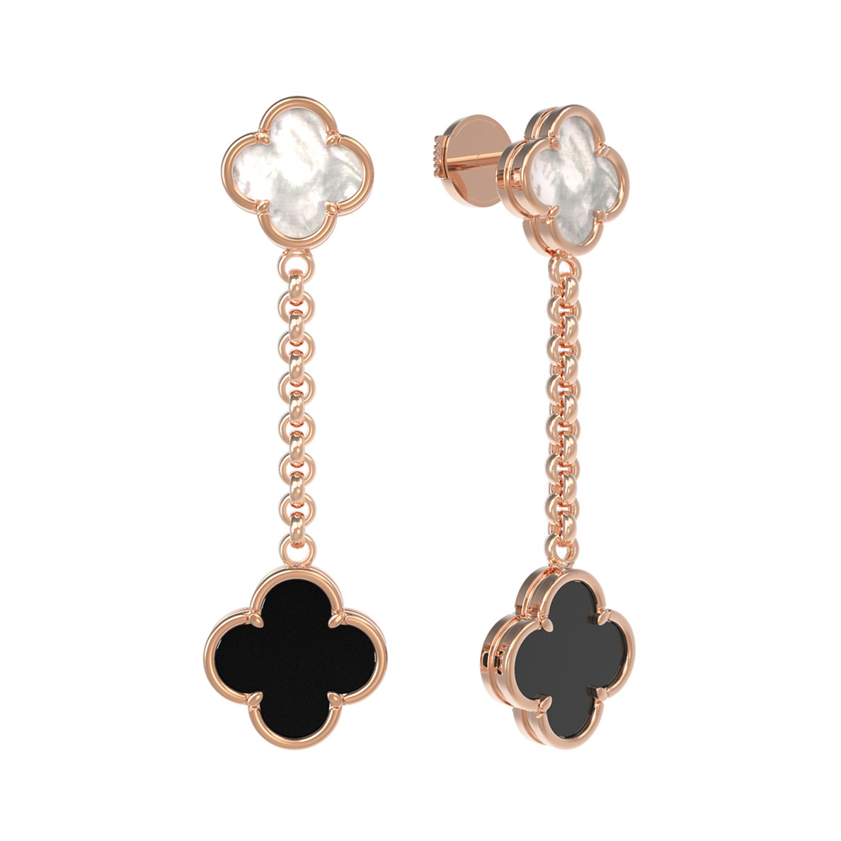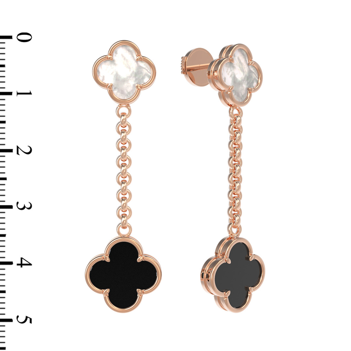Основа изделия — теплое красное золото, которое великолепно гармонирует с природным сиянием вставок. В дизайне использованы две вставки: нежный перламутр и глубокий черный оникс. Светлое мерцание перламутра на верхней части серег мягко переходит в насыщенную темную глубину оникса в нижней части, создавая динамичный и выразительный акцент.