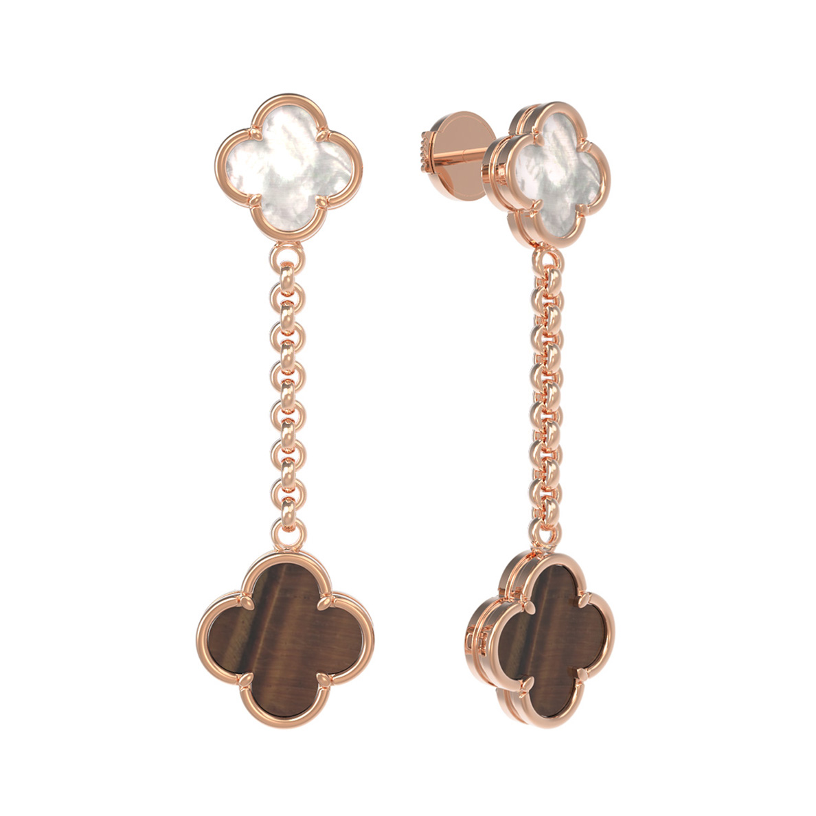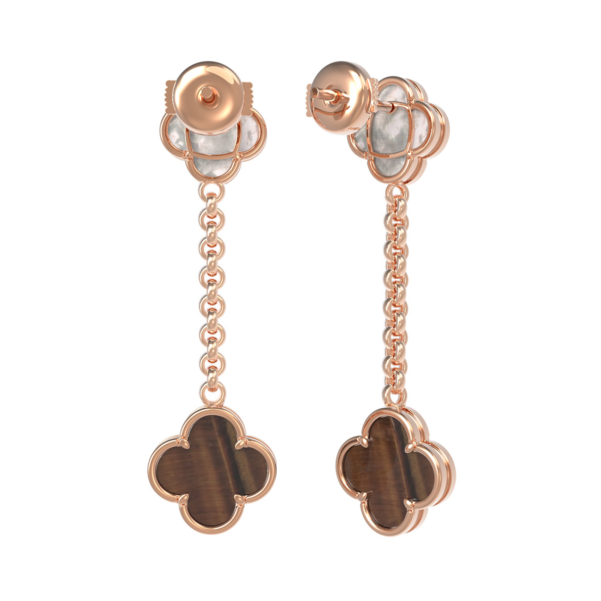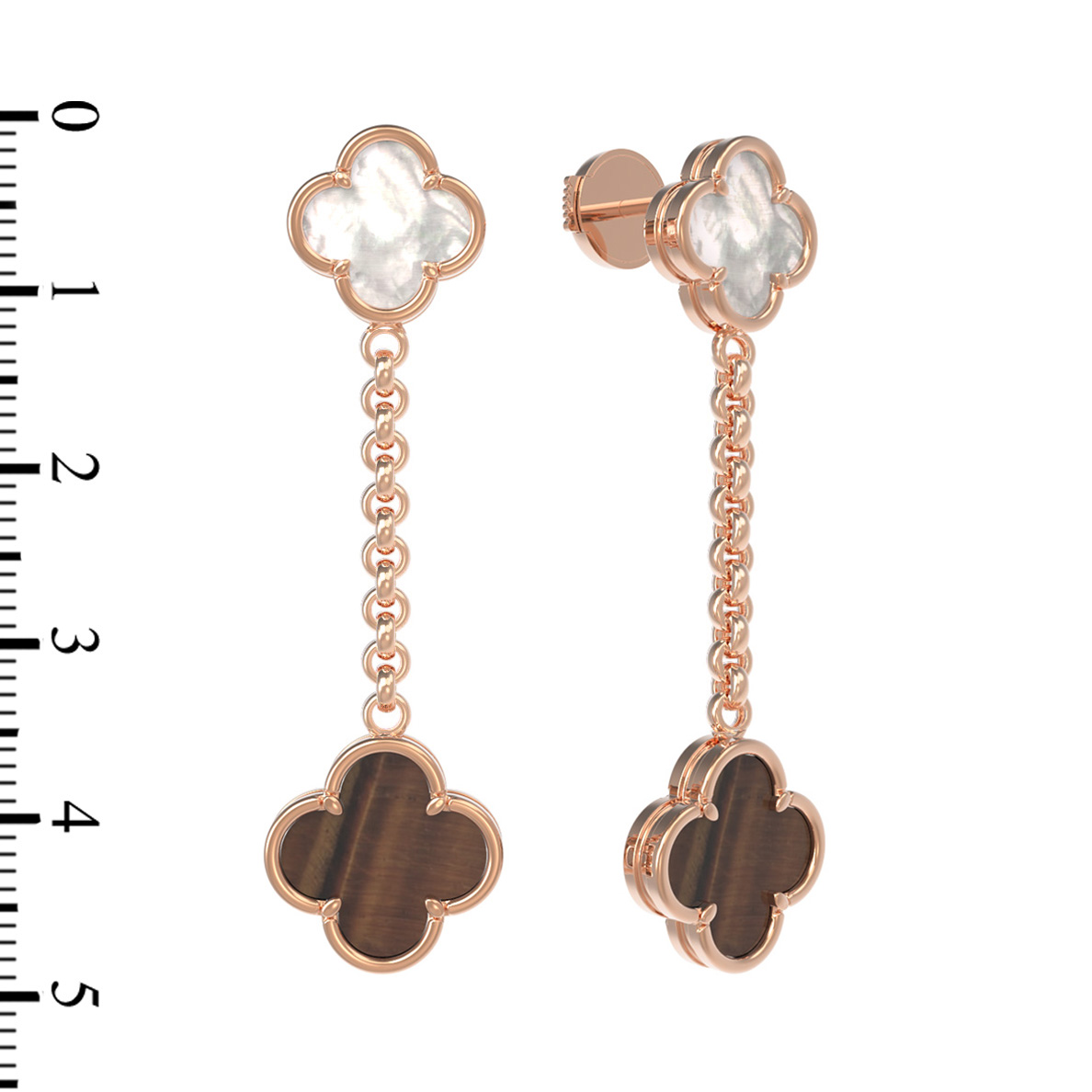 Ювелирная работа отличается искусным сочетанием материалов: в центре внимания оказались две вставки — нежный перламутр с его мягким сиянием и глубокий оранжевый тигровый глаз, известный своим уникальным переливом. Контраст этих камней создает завораживающий эффект, делая аксессуар универсальным и подходящим как для женщин, так и для мужчин. Благодаря подвижному соединению элементов, серьги при каждом движении красиво подчеркивают линию шеи, добавляя образу динамики и легкости.