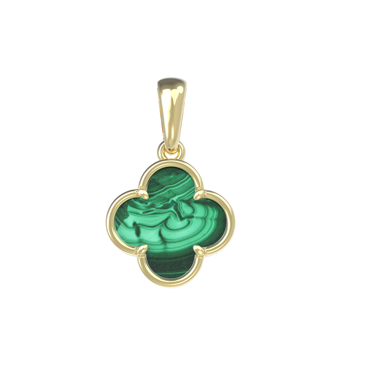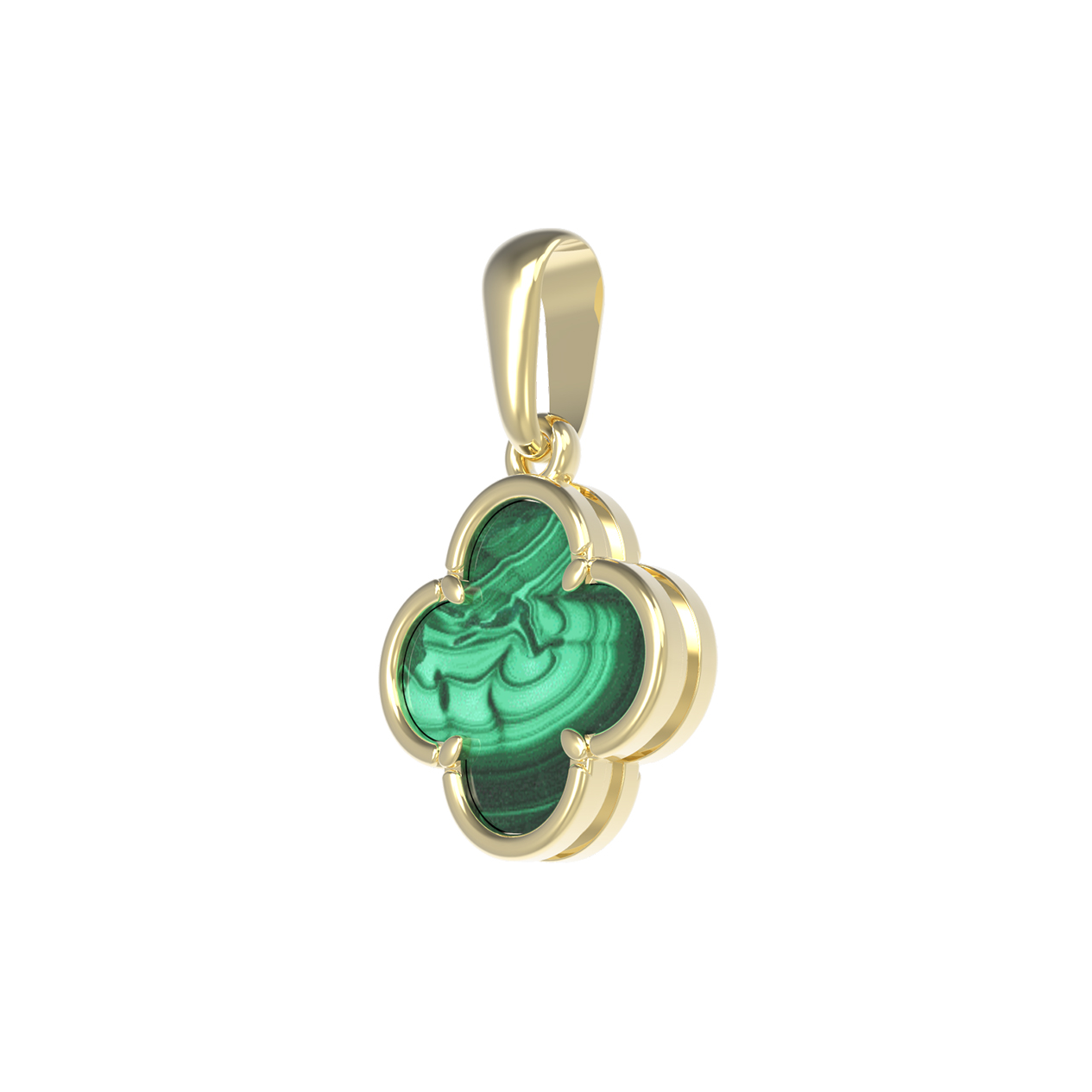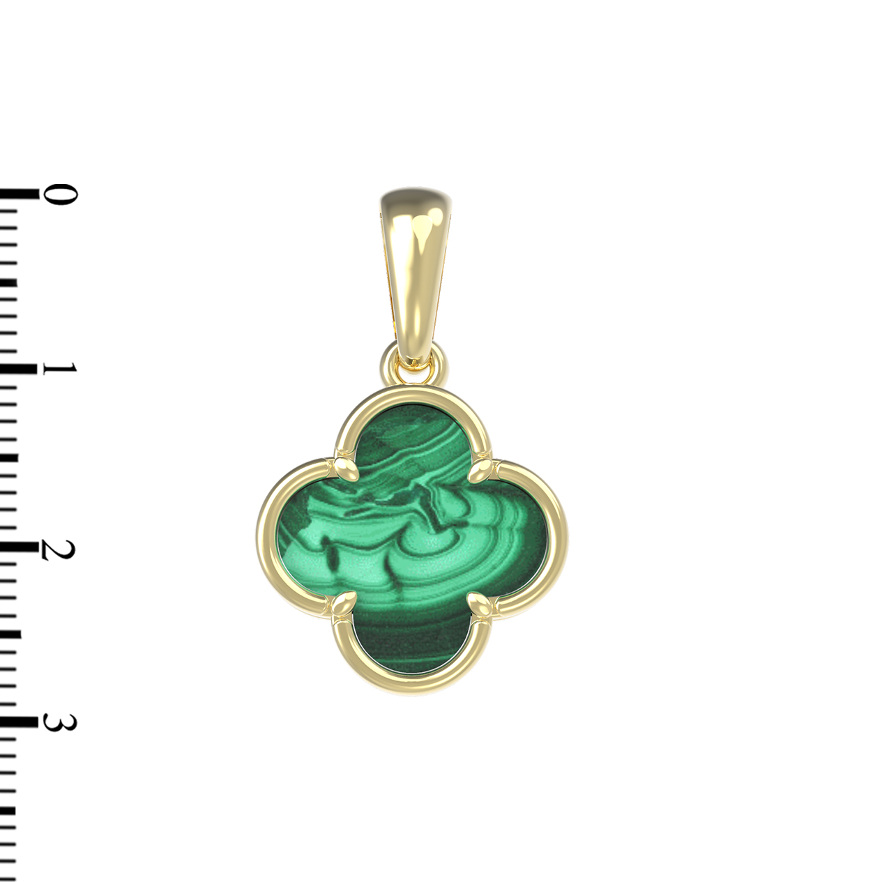 Изысканная подвеска из лимонного золота 585 пробы станет утонченным акцентом в вашем образе. Дизайн изделия выполнен в виде легендарного символа — клевер, который олицетворяет удачу, гармонию и благополучие. Центральным элементом украшения является натуральный малахит глубокого зелёного цвета. Уникальный природный рисунок камня делает каждое изделие неповторимым, а тёплый оттенок лимонного золота гармонично подчёркивает насыщенную палитру вставки. В изделии использована одна качественная вставка, надёжно закреплённая в оправе.