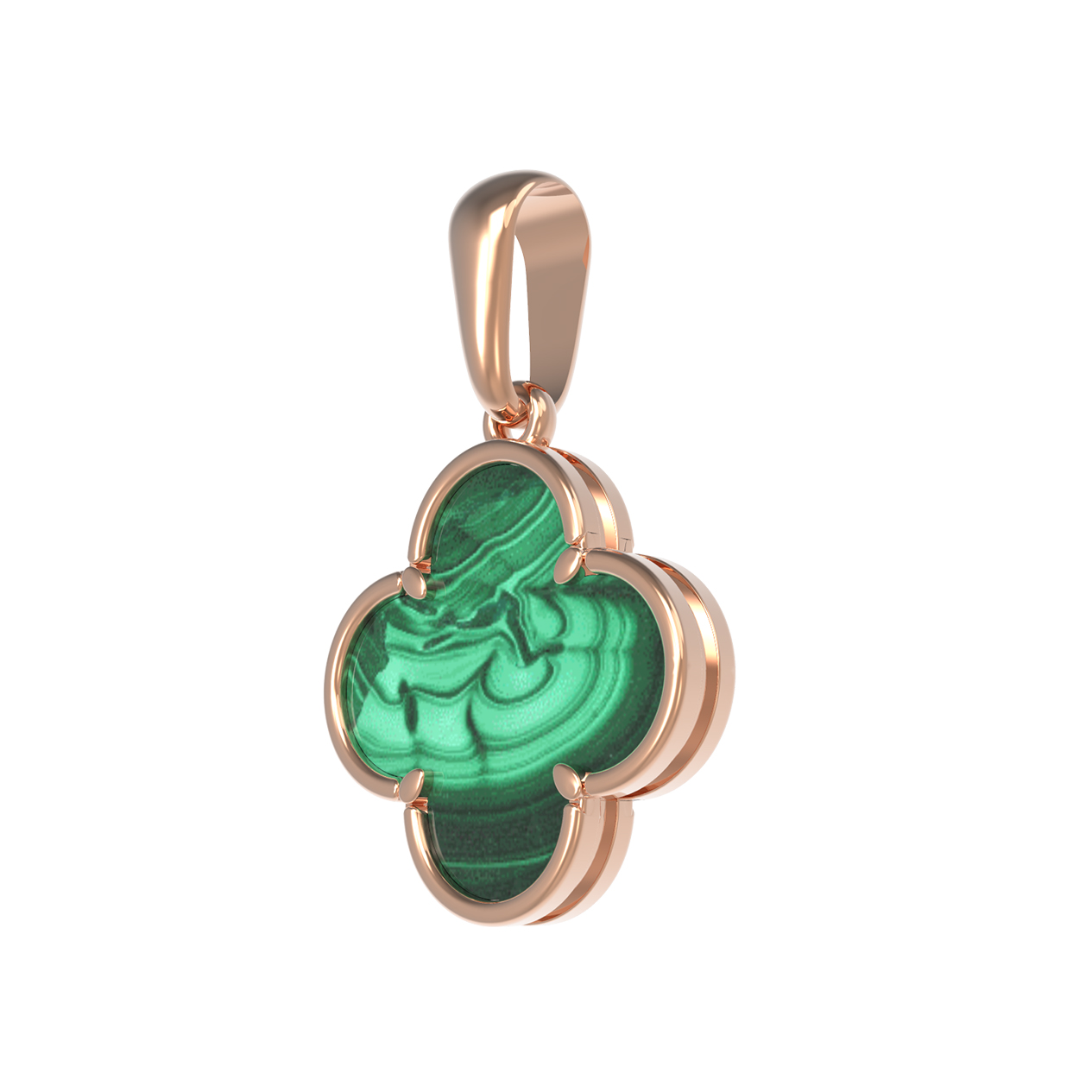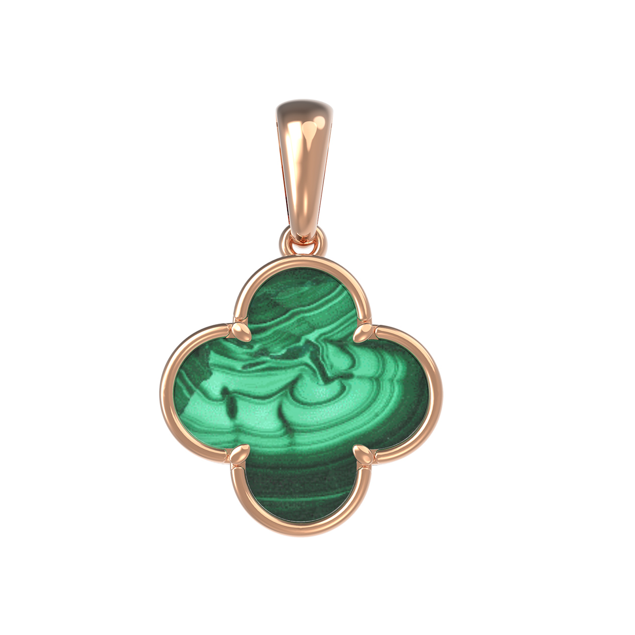 Подвеска из золота с малахитом — это изысканное ювелирное украшение, которое станет достойным дополнением вашего образа. Изделие выполнено из красного золота 585 пробы, что обеспечивает долговечность и благородный теплый оттенок металла. В центре внимания — натуральный зеленый малахит, который притягивает взгляд своей уникальной природной текстурой и насыщенным цветом. Дизайн в форме четырехлистного клевера символизирует удачу и гармонию, придавая украшению особый смысл.