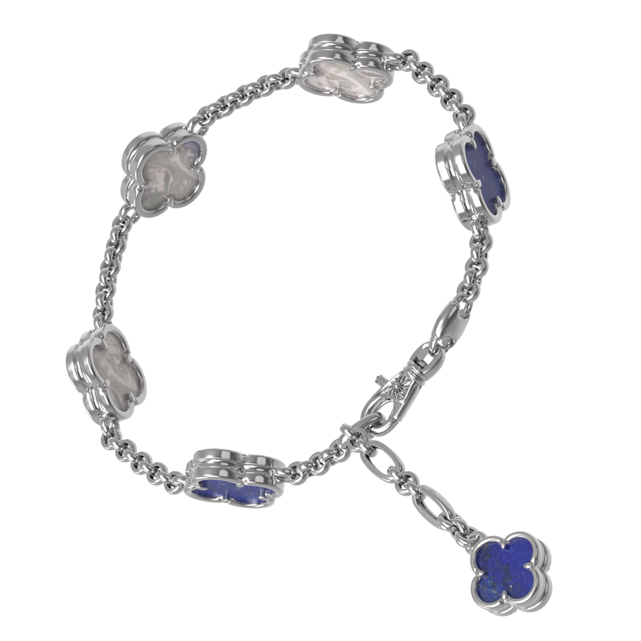 Элегантный браслет из белого золота 585 пробы станет утонченным дополнением вашего образа. Дизайн изделия выполнен в форме изящного клевера — символа удачи и гармонии. Украшение входит в коллекцию De Luxe — Клевер весна, отличающуюся благородством исполнения и вниманием к деталям. Белое золото холодного оттенка эффектно подчеркивает красоту шести вставок, чередующих глубокий синий цвет лазурита и нежное сияние перламутра.