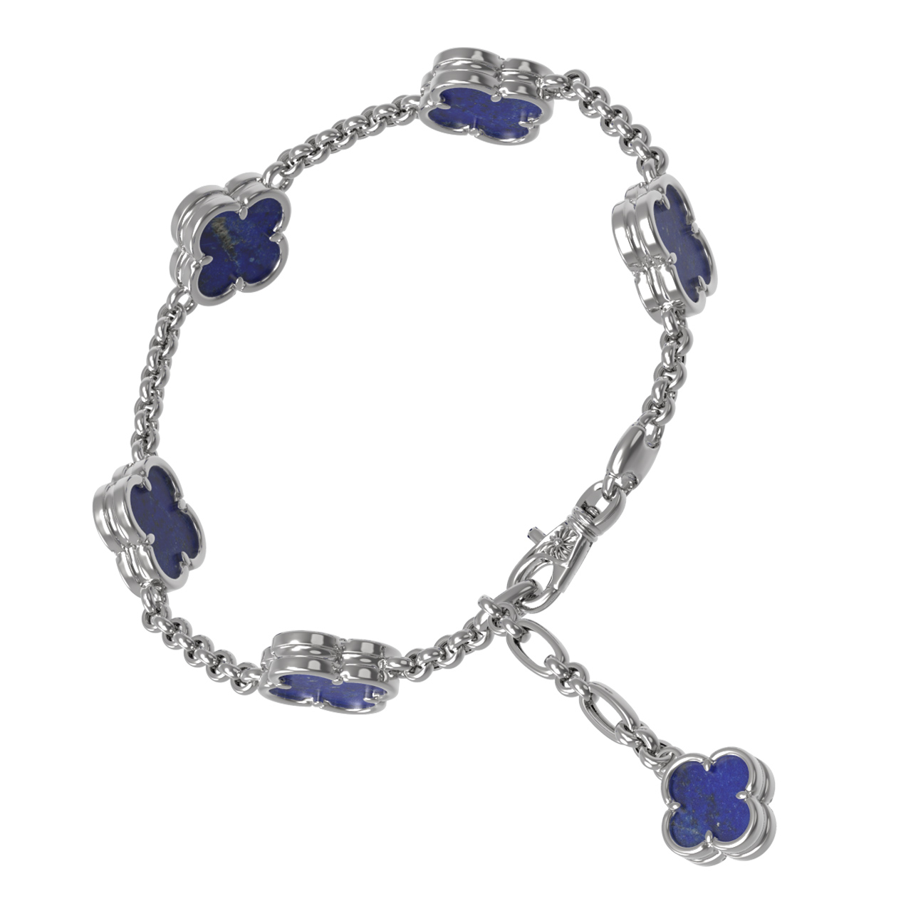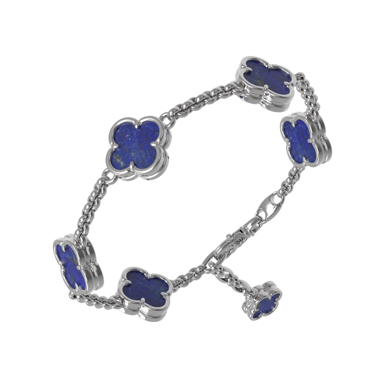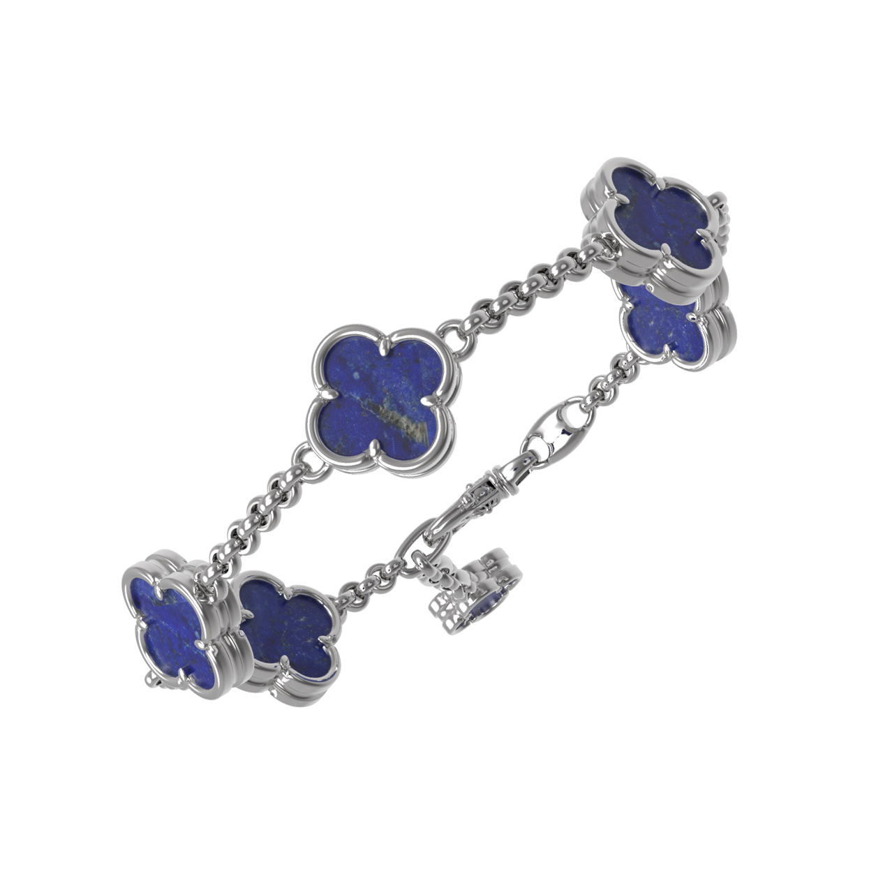 Изысканный браслет из белого золота 585 пробы станет ярким акцентом вашего образа. Дизайн украшения, выполненный в форме символичного клевера, придает изделию утонченность и особый шарм. В качестве декоративных элементов использованы 6 вставок из натурального лазурита насыщенного синего цвета, которые гармонично сочетаются с холодным блеском драгоценного металла.