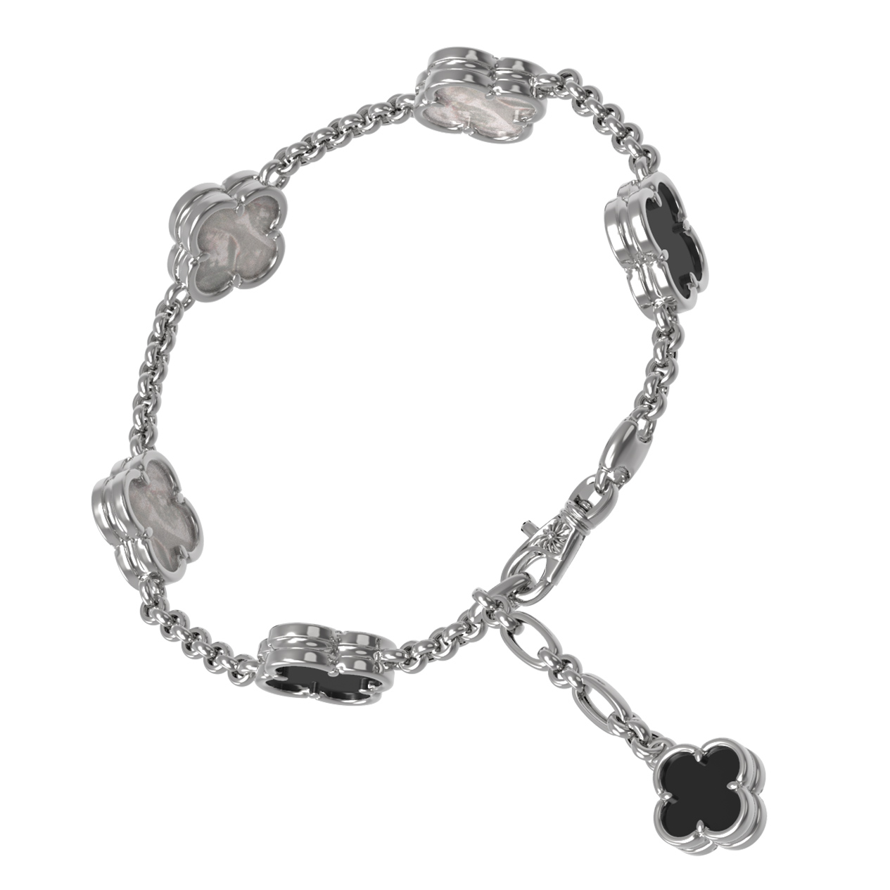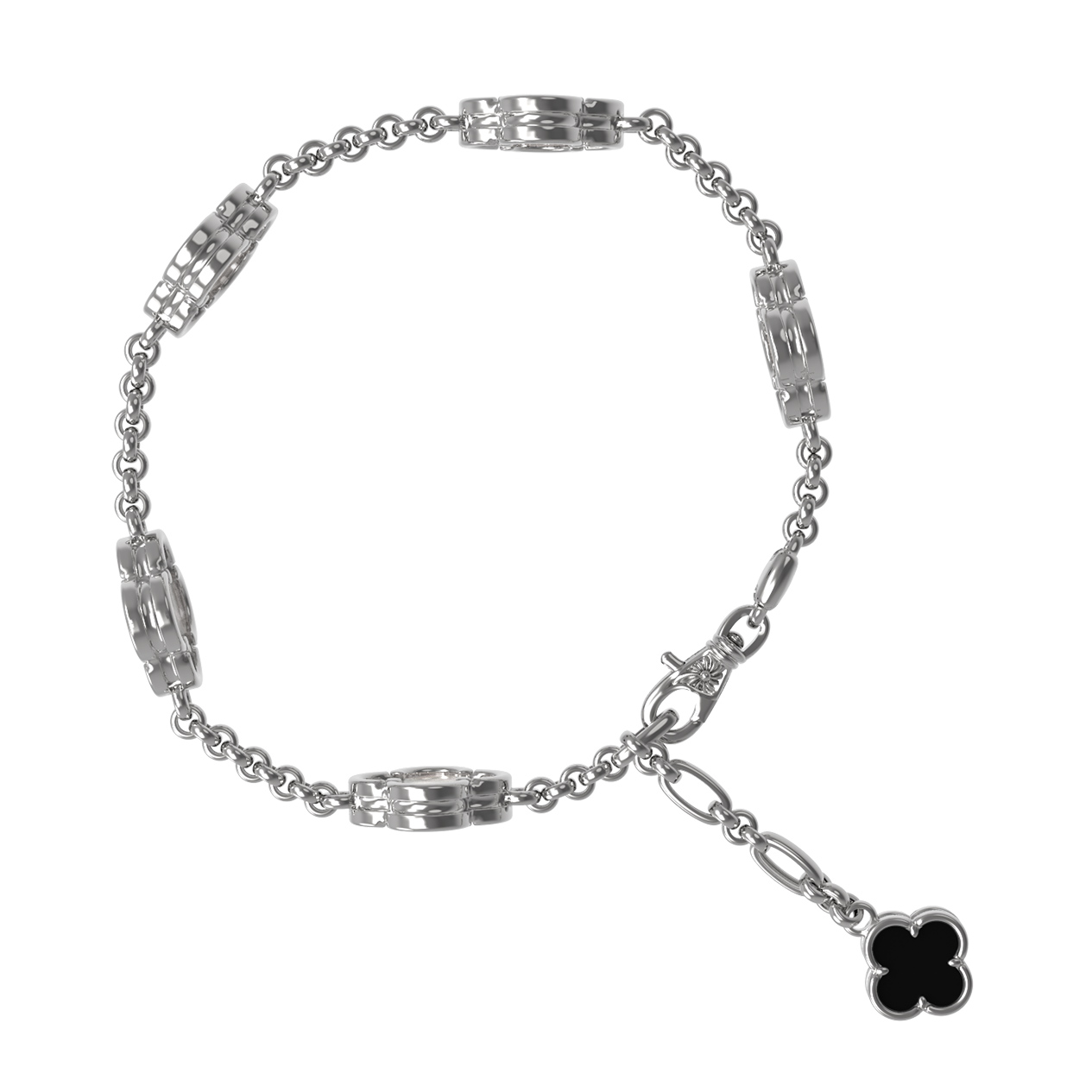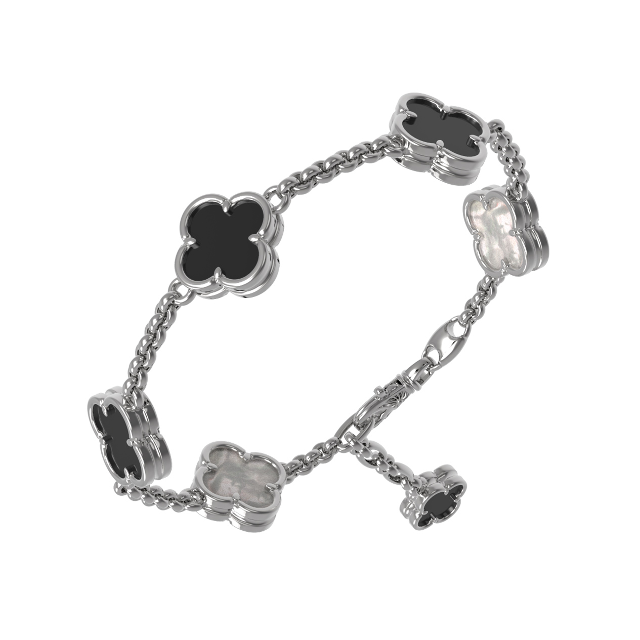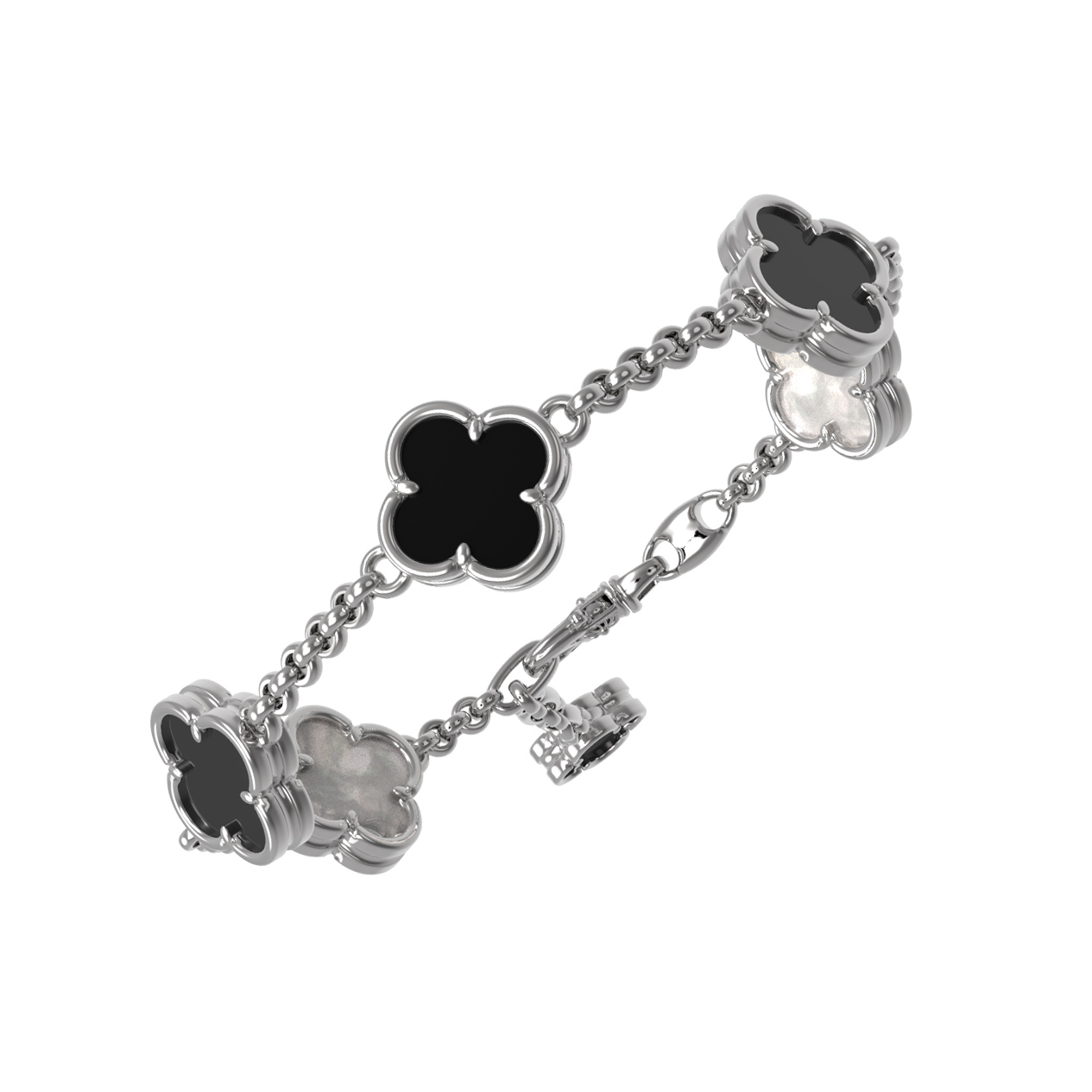 Центральное место в композиции занимают 6 вставок, чередующихся между собой: глубокий черный оникс контрастирует с нежным, переливающимся перламутром. Такое сочетание цветов делает браслет универсальным аксессуаром, который легко впишется как в строгий деловой дресс-код, так и в вечерний наряд. Цвет материала — холодный блеск белого золота — подчеркивает чистоту линий каждой детали.
