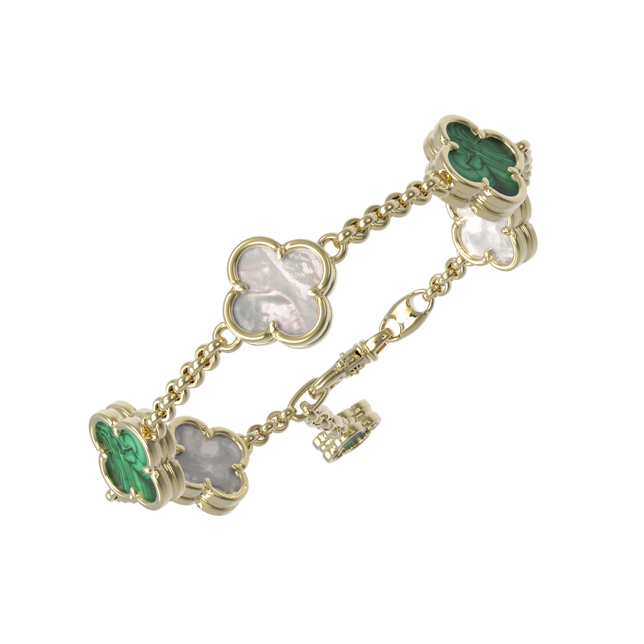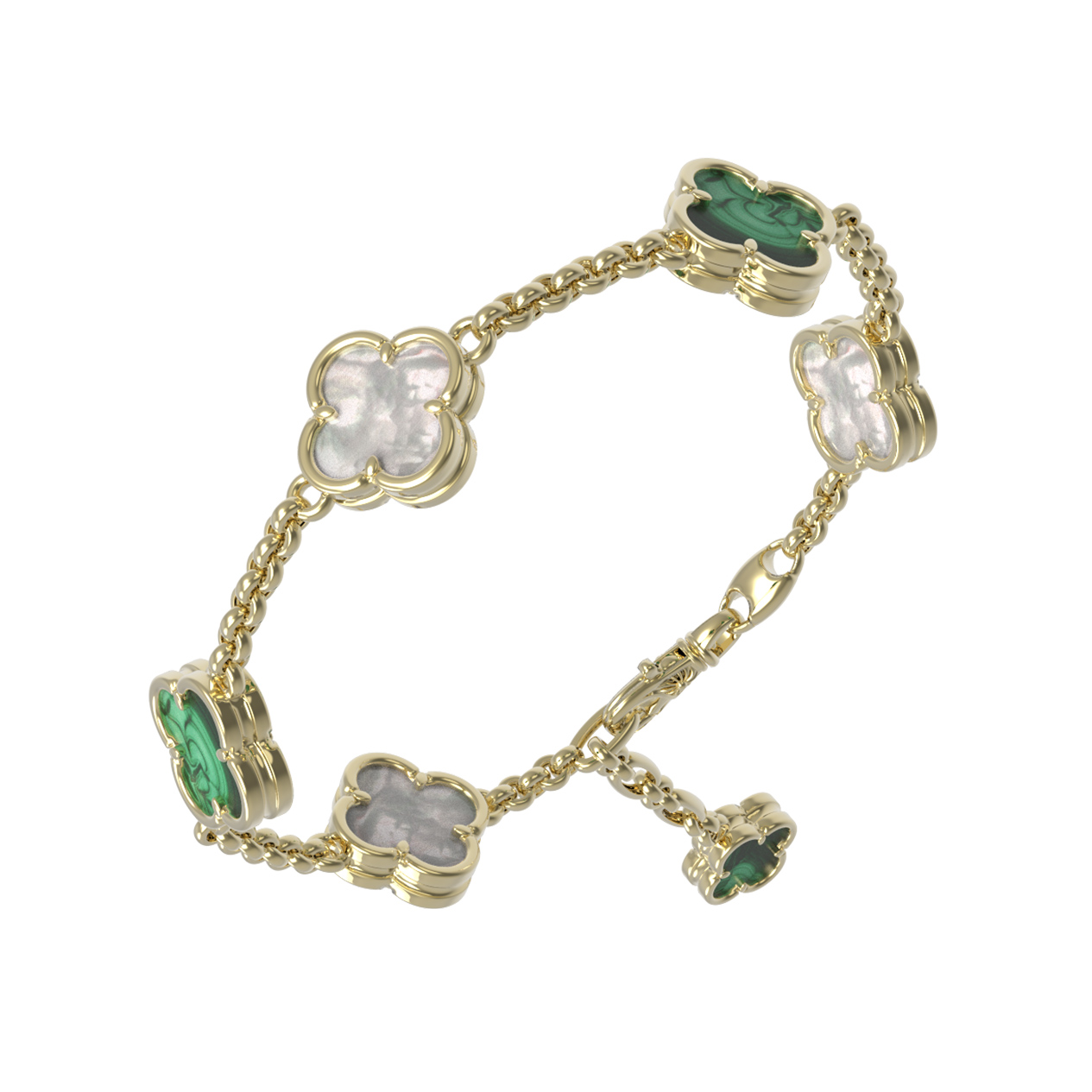 В центре композиции — 3 контрастные вставки из натурального малахита с его глубоким зеленым узором и нежного перламутра, переливающегося мягкими бликами. Сочетание зеленого цвета малахита и перламутра придает изделию особое очарование, делая его универсальным дополнением как повседневного, так и вечернего образа. Тонкая, тщательно проработанная золотая цепочка подчеркивает утонченность дизайна, а надежная застежка обеспечивает комфорт при ежедневном ношении.