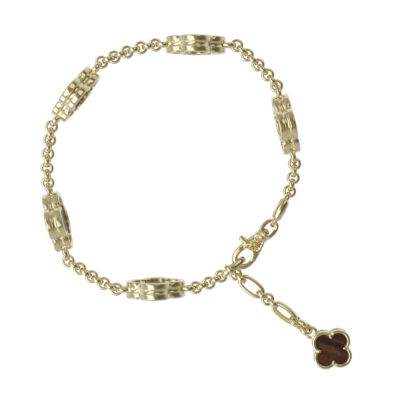 Изящный и выразительный браслет из лимонного золота 585 пробы станет центральным акцентом вашего образа. Это украшение входит в коллекцию De Luxe — Клевер весна, вдохновленную природной гармонией и эстетикой простых, но элегантных форм. Дизайн изделия выполнен в популярном стиле клевер, который ассоциируется с удачей и утонченным вкусом. Центральными элементами композиции выступают шесть вставок из натурального тигрового глаза, обладающего благородным оранжевым оттенком с характерным шелковистым переливом.