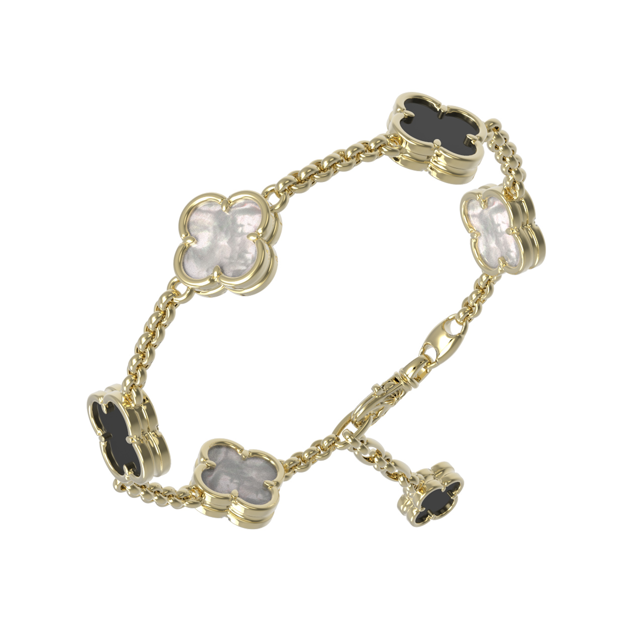 Элегантный браслет из коллекции De Luxe — Клевер весна станет безупречным акцентом в вашем образе. Дизайн в форме клевера — это воплощение изящества и стиля, которое легко вписывается как в повседневные, так и в торжественные комплекты украшений. Ювелирное изделие выполнено из благородного лимонного золота 585 пробы, чей теплый оттенок подчеркивает сияние вставок.