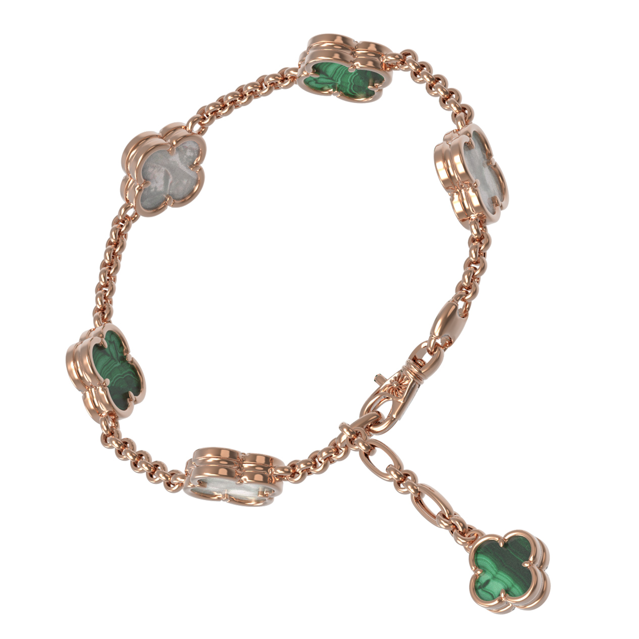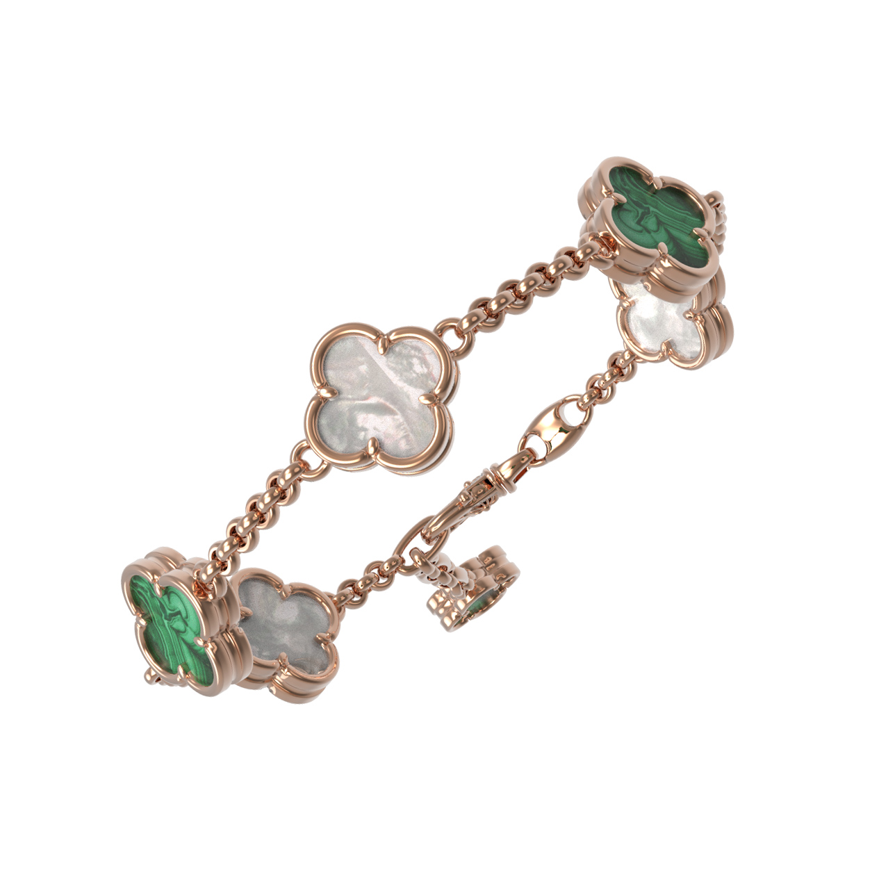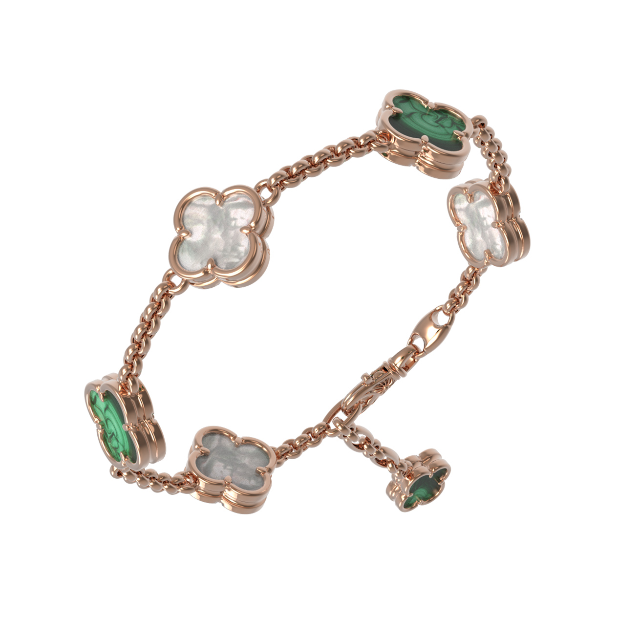 В центре композиции — 3 вставки: благородный малахит зеленого цвета и нежный перламутр, создающий мягкие переливы. Контраст между глубоким природным оттенком камней и мягким блеском красного золота делает этот аксессуар по-настоящему притягательным. Тонкая, но прочная цепочка обеспечивает комфортную посадку на запястье.