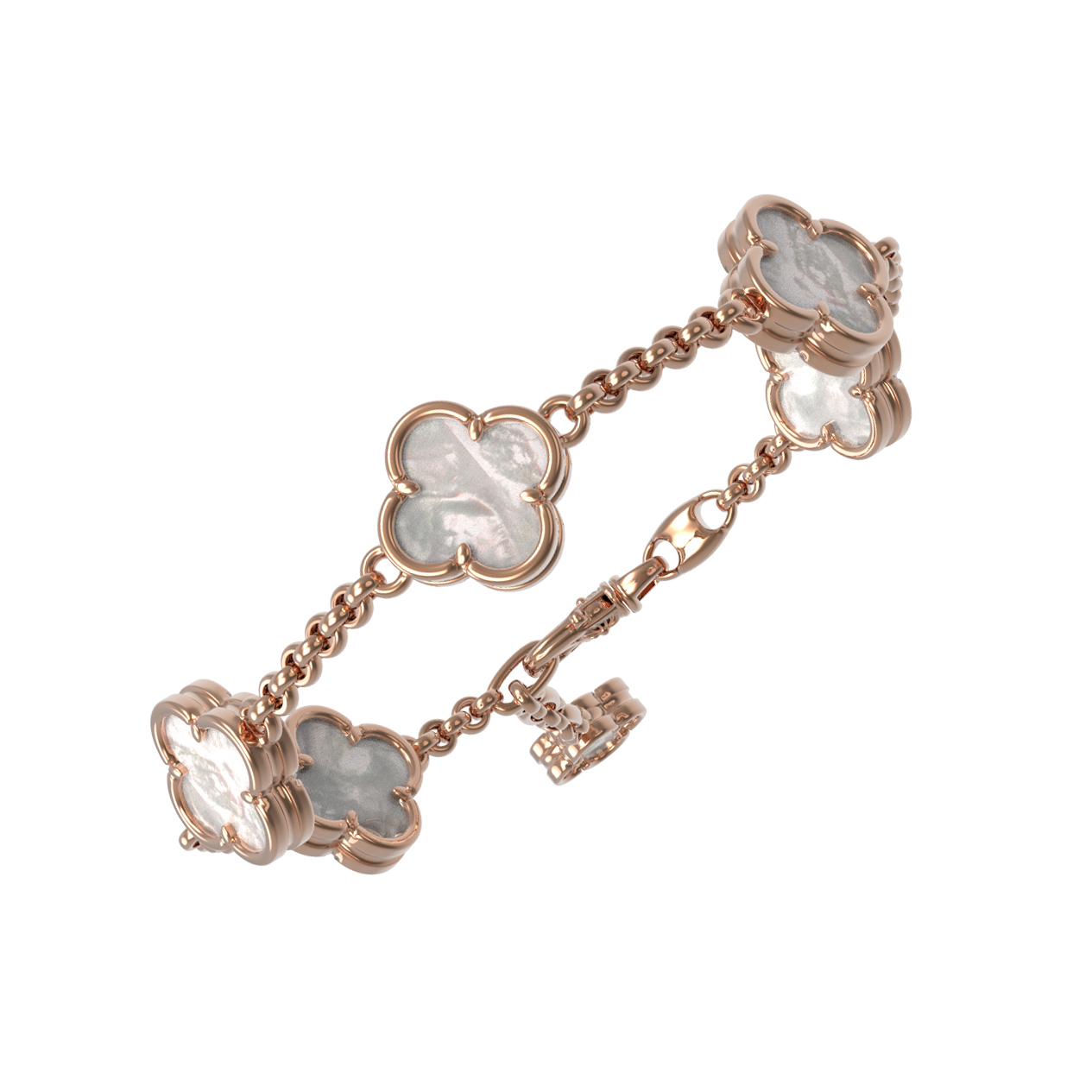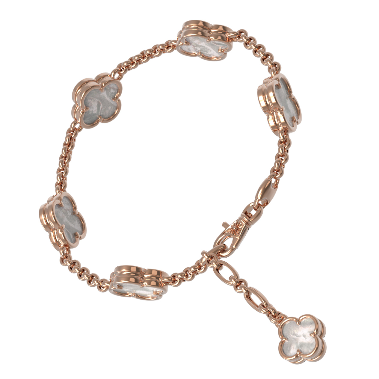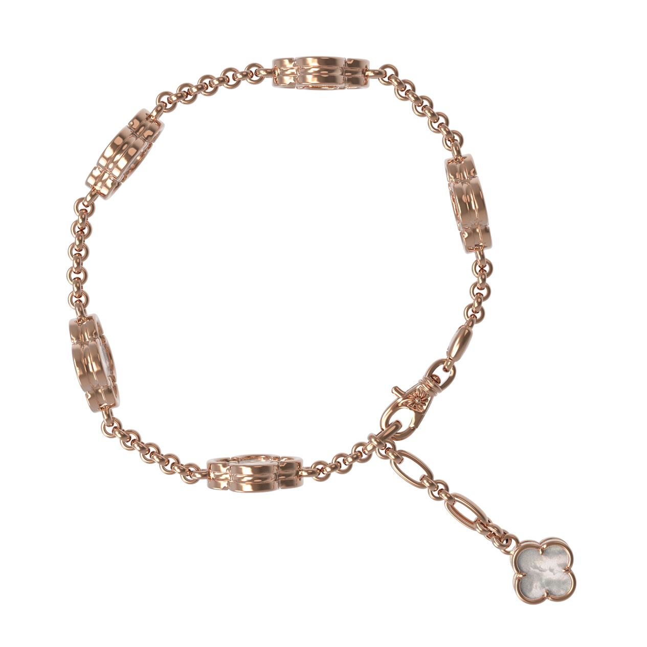 Изящный браслет из красного золота 585 пробы из коллекции De Luxe — Клевер весна станет безупречным акцентом вашего образа. Дизайн украшения воплощает в себе нежность и утонченность: цепочка дополнена декоративными элементами в форме клевера, которые являются символом удачи и благополучия. В качестве вставок использован натуральный перламутр, чей мягкий перелив гармонично сочетается с теплым блеском красного золота.