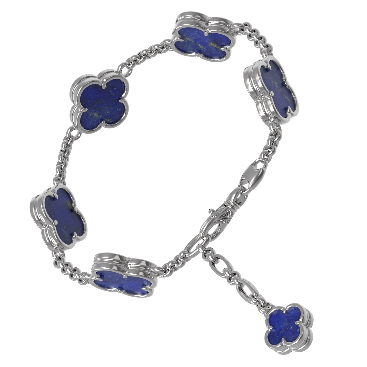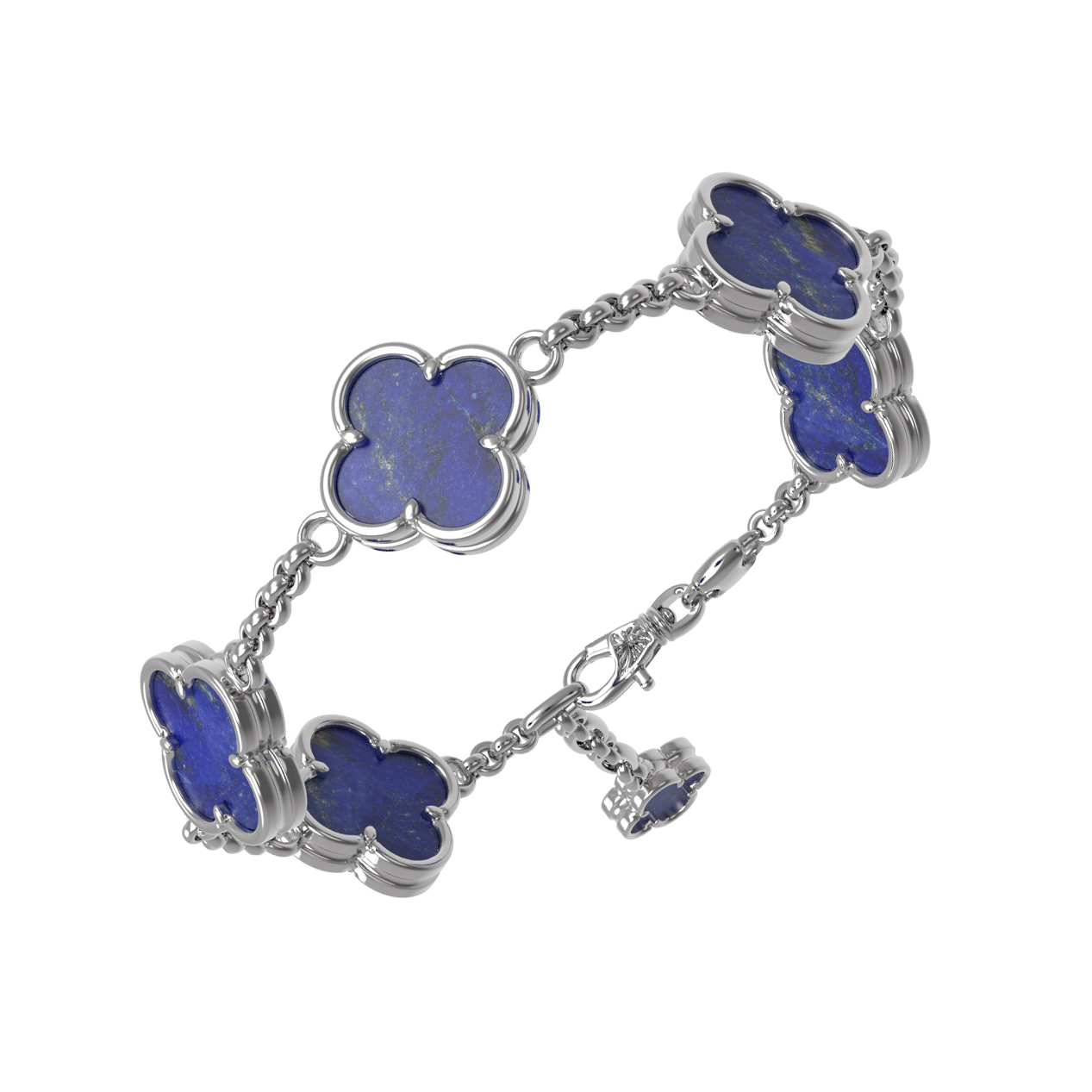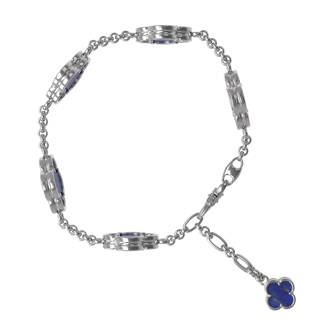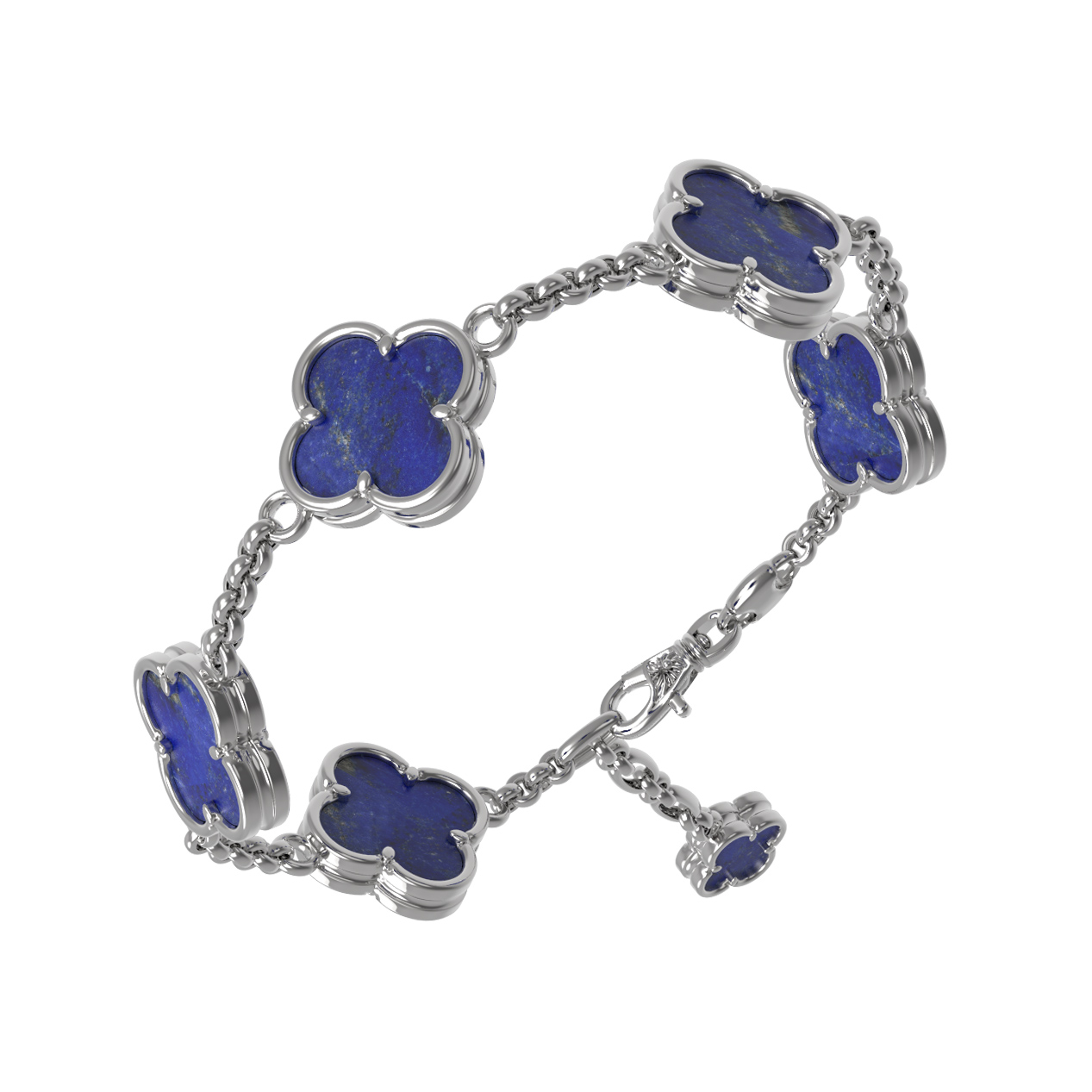 В украшении использовано 6 вставок из натурального лазурита, которые придают аксессуару особую выразительность и глубину. Это изделие, представленное в коллекции De Luxe — Клевер весна, отличается продуманной детализацией и ювелирной точностью исполнения. Универсальный дизайн позволяет носить браслет как женщинам, так и мужчинам, дополняя повседневные или вечерние ансамбли.