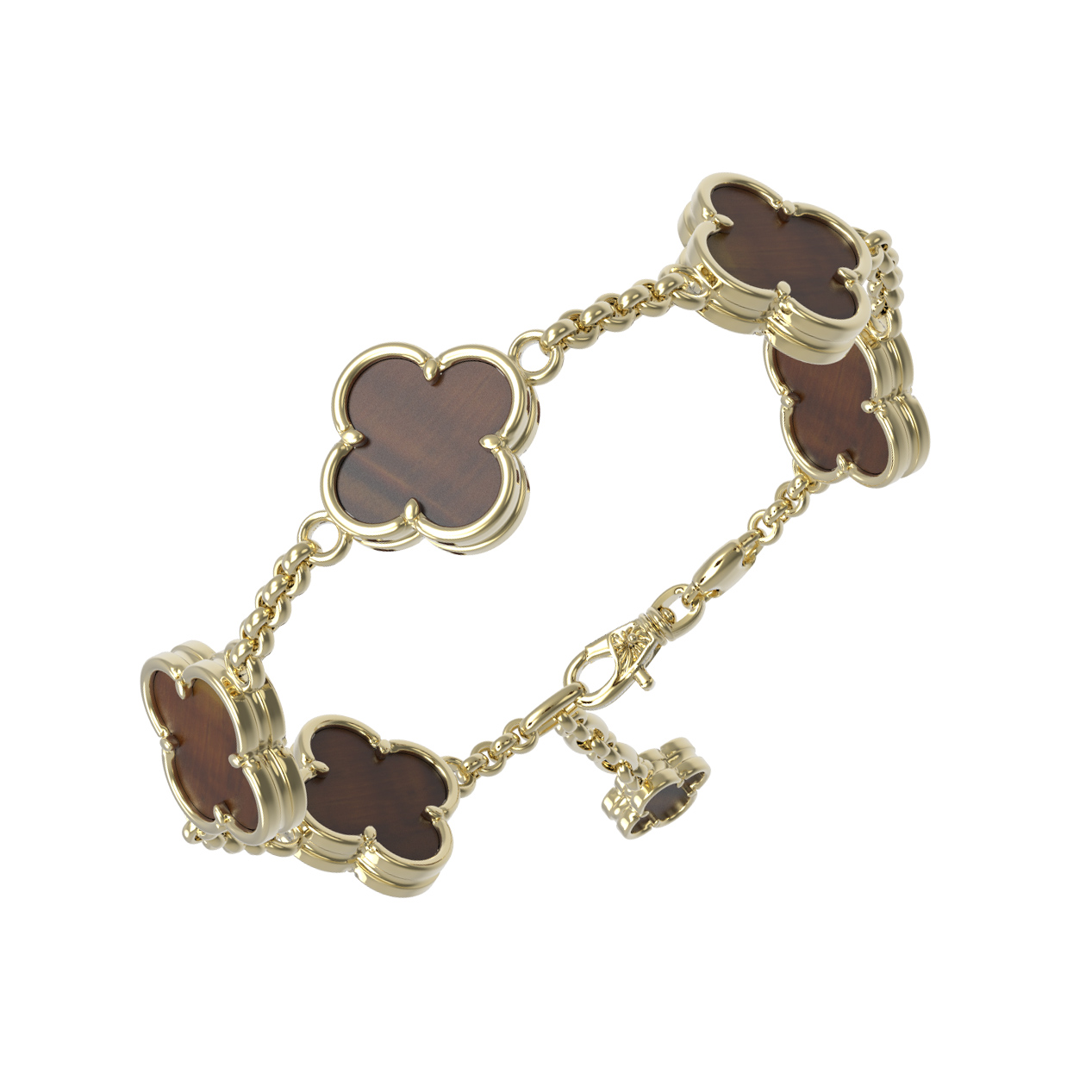 Центральным элементом композиции выступают 6 вставок из натурального тигрового глаза. Глубокий оранжевый оттенок камней красиво контрастирует с благородным блеском лимонного золота, создавая выразительную и притягательную игру света. Дизайн клевер, ставший современной классикой, придает браслету нотки утонченного шарма и легкости.