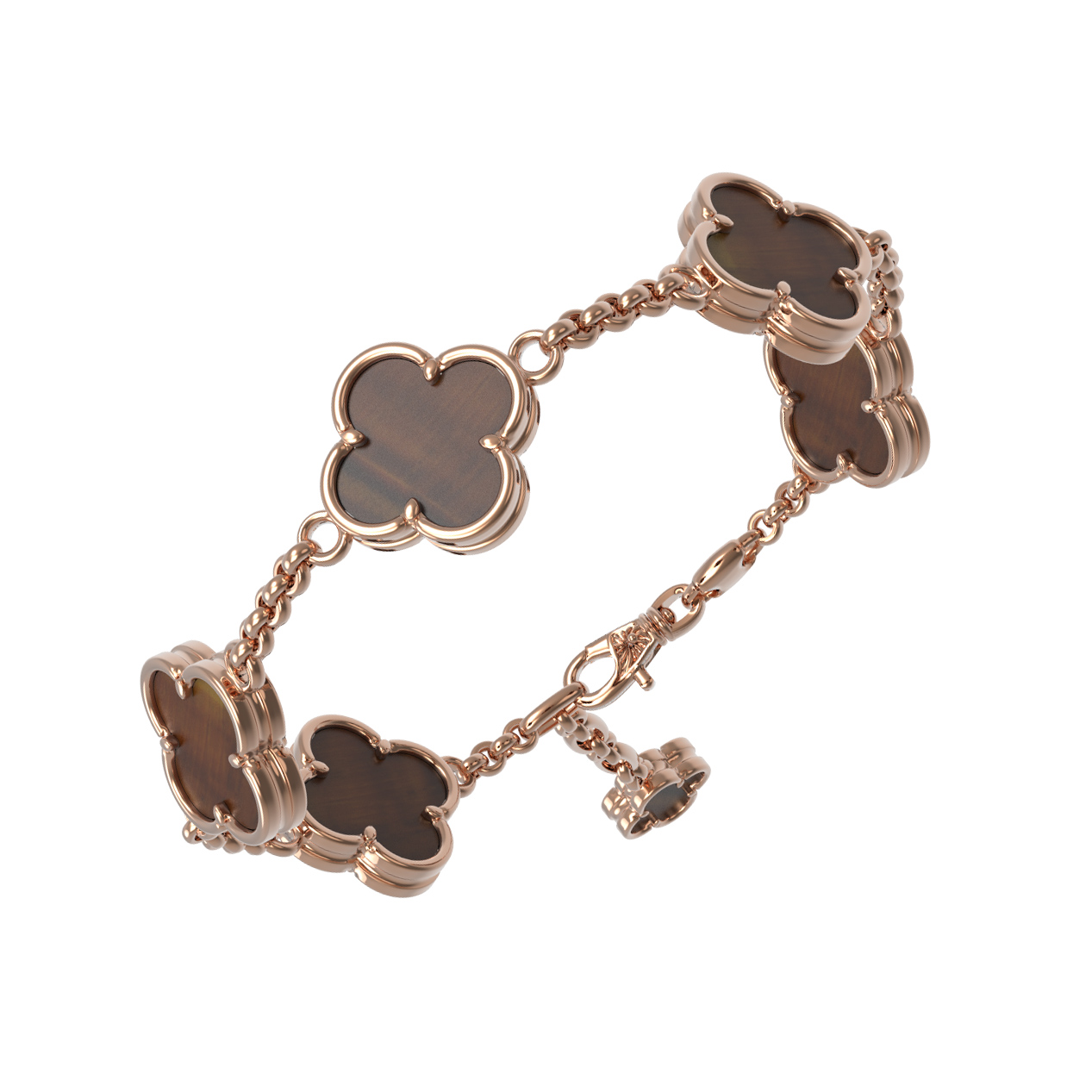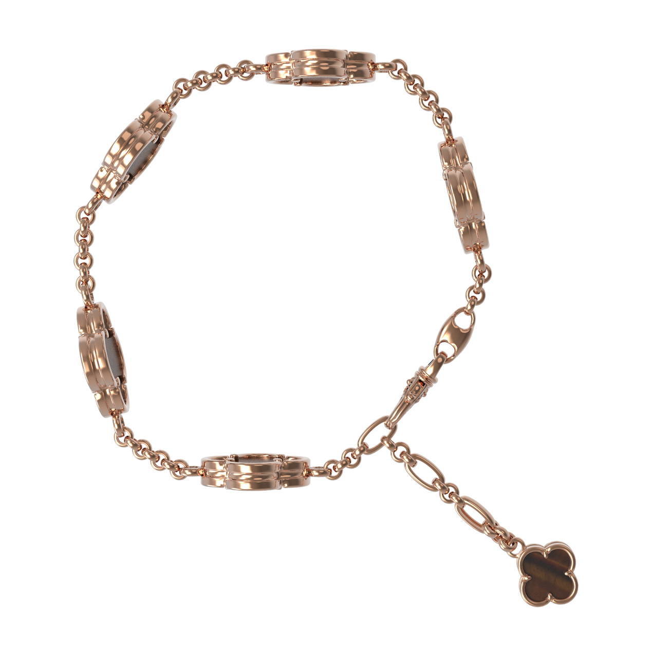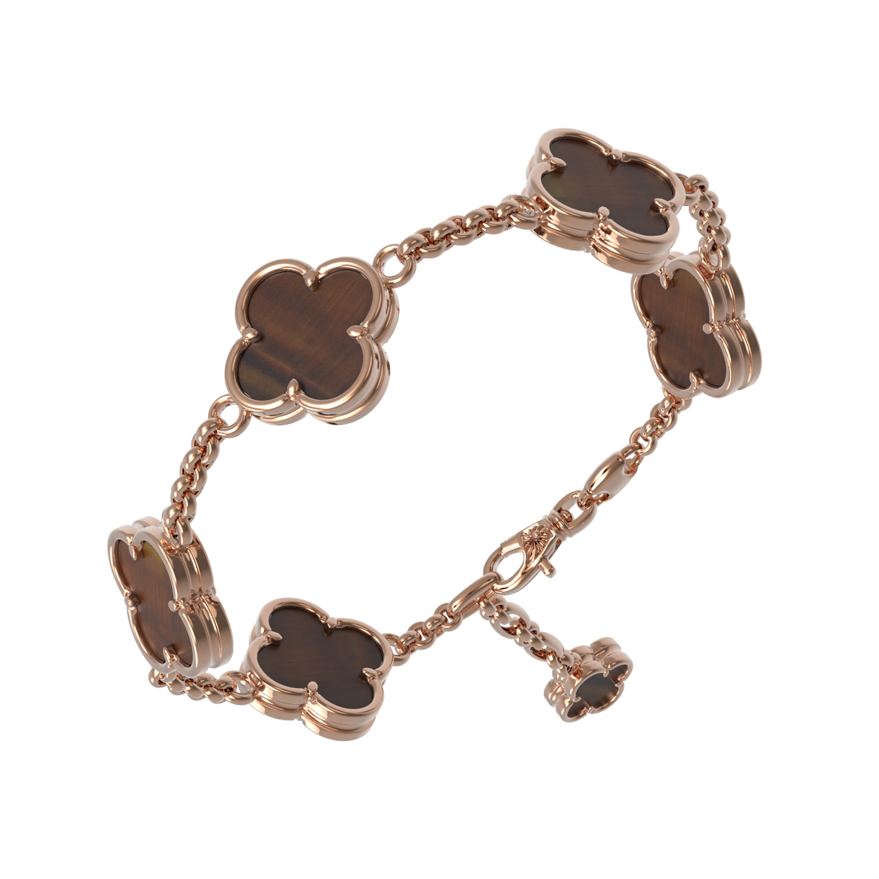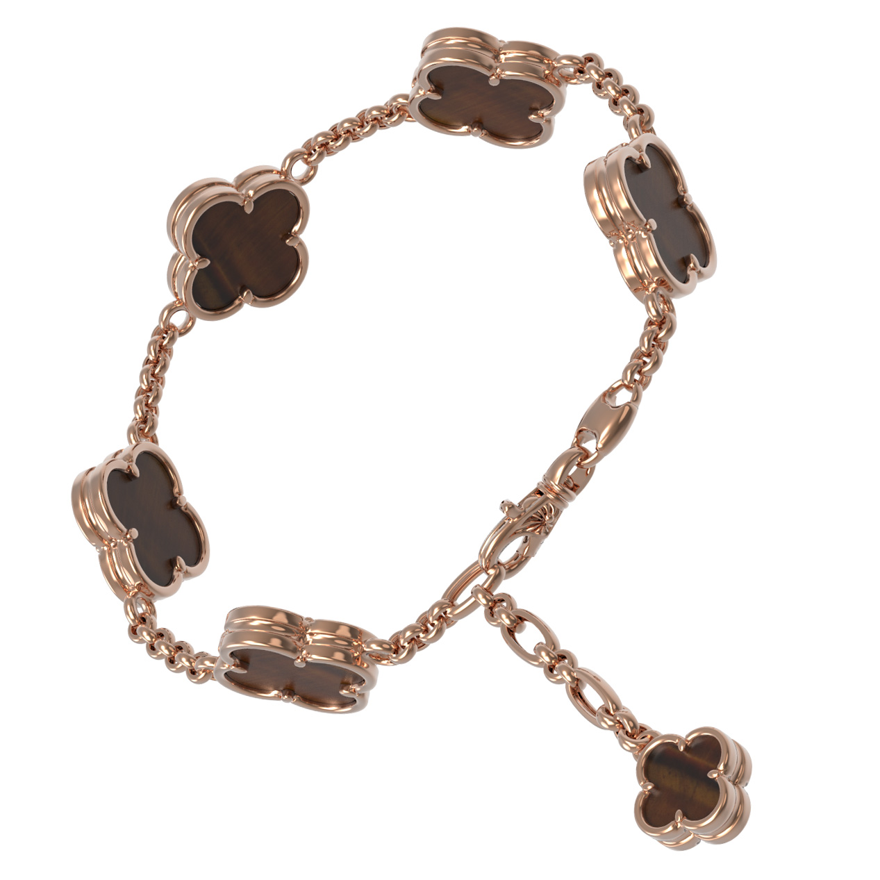 Изысканный браслет из красного золота 585 пробы станет утонченным акцентом в вашем ювелирном гардеробе. Изделие из коллекции De Luxe — Клевер весна выполнено в популярном дизайне в форме клевера, который придает образу нотки природной элегантности и символизирует удачу. Теплый оттенок красного золота гармонично сочетается с глубоким цветом вставок из натурального тигрового глаза. Оранжевые переливы камня эффектно дополняют благородный металл, создавая притягательный и сдержанный контраст.