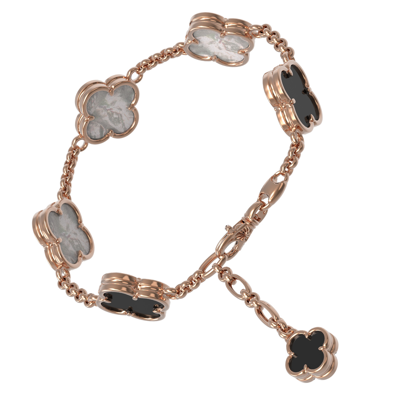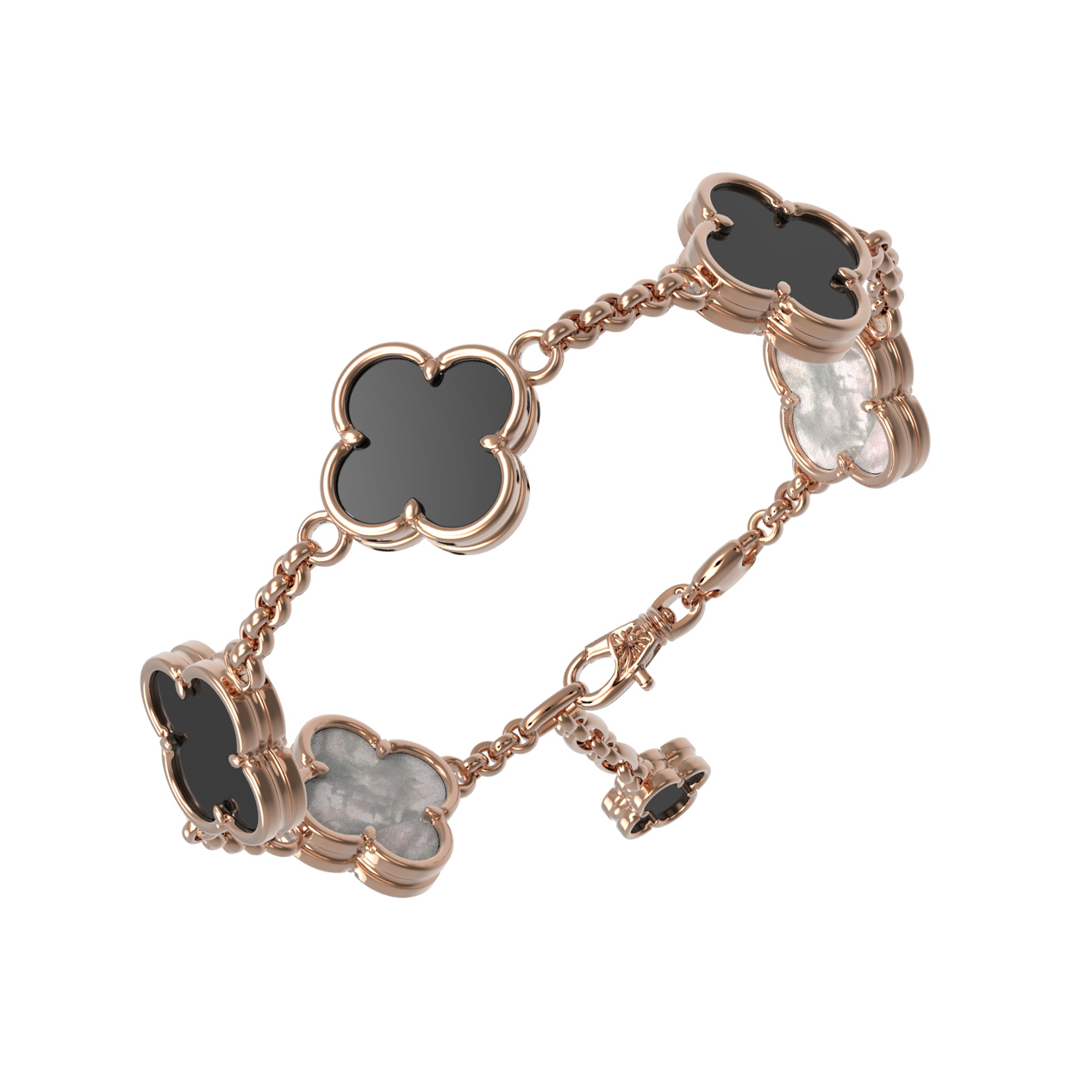 Центральным элементом композиции стали 6 вставок, гармонично сочетающих в себе два контрастных материала: глубокий черный оникс и нежный переливающийся перламутр. Чередование черного и перламутрового оттенков создает выразительную игру света, делая браслет центральным акцентом вашего образа. Лаконичное плетение основы идеально дополняет геометрию клевера, обеспечивая комфортную посадку на запястье.